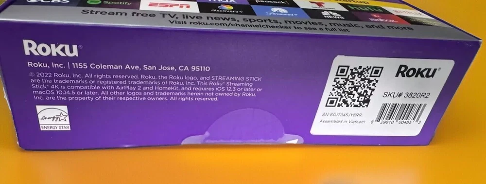 Qty. 1 Roku Streaming Stick 4k Features: Hides behind your TV: The stick design plugs right into your TV with a simple setup Super-fast startup: Start streaming channels like Disney+, HBO Max, Apple TV+, Netflix, Sling, and Hulu in a snap—just turn on your TV Long-range Wi-Fi: Enjoy fast, seamless TV streaming in any room with a strong Wi-Fi connection, now with up to 2x the speed No more juggling remotes: Power up your TV, adjust the volume, and control your Roku Streaming Stick with the Roku remote Voice search & control: Quickly search, play entertainment, and control your streaming device with the voice remote Breathtaking picture: Stream in 4K, Dolby Vision, and HDR10+ with sharp resolution and vivid color Watch what you love: Upgrade your streaming with a massive selection of free, live, and premium TV, including Roku Originals and 350+ Live TV channels for free on The Roku Channel Works with popular voice assistants: Enjoy easy voice control with Siri, Alexa, and Hey Google