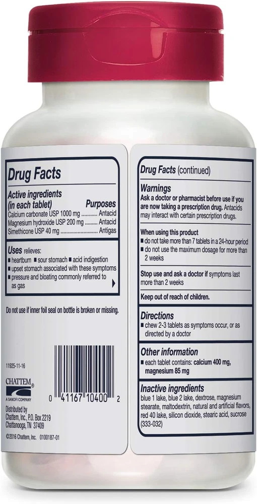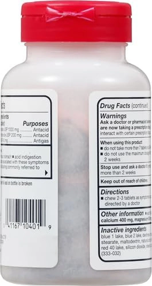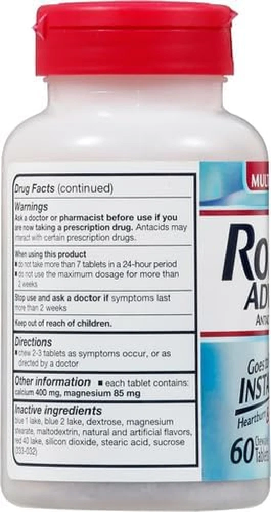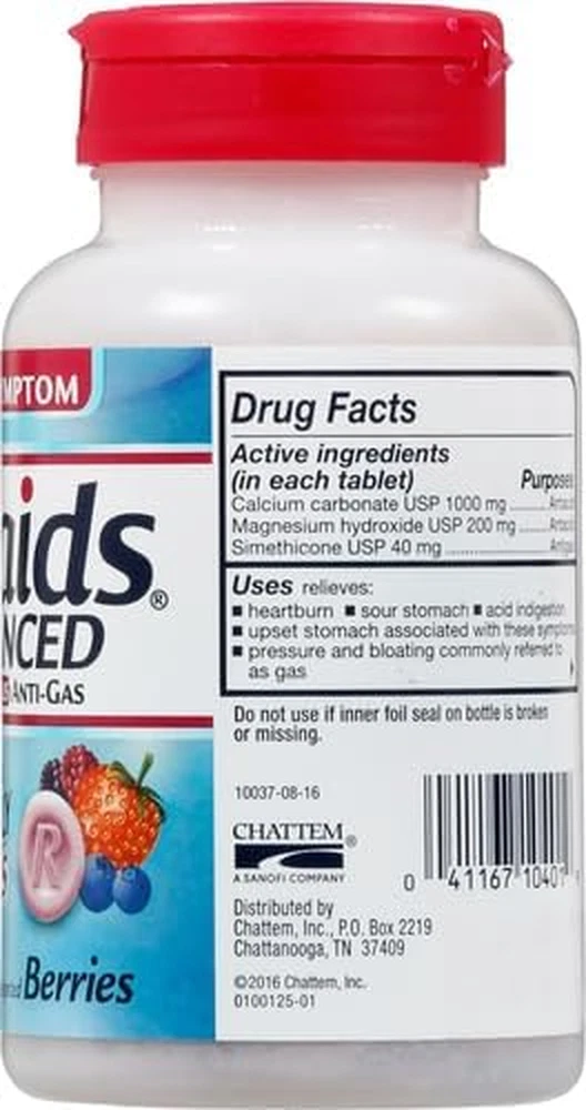 Store New Arrivals Add to Favorite View Feedback Contact Rolaids Advanced Antacid plus Anti-Gas 60 Chewable Tablets, Assorted Berry, Heartburn and Gas Relief Description Item model number 041167104019 Item dimensions L x W x H 2.5 x 2.5 x 4.63 inches Special Feature fast_acting Product Dimensions 2.5 x 2.5 x 4.63 inches; 6.38 ounces Country of Origin USA Product Benefits Heartburn, acid indigestion, sour stomach, pressure & bloating Specific Uses For Product Anti-Gas, Indigestion, Heartburn, Bloating Size 60 Count (Pack of 1) Is Discontinued By Manufacturer No Brand Rolaids Manufacturer Procter & Gamble CONTAINS: One (1) 60-count bottle of Rolaids Advanced Antacid Plus Anti-Gas Chewable Tablets, Assorted Berry KICKS ACID & MORE: Rolaids Advanced Antacids plus Anti-Gas offer multi-symptom relief GOES TO WORK INSTANTLY: Chewable antacid tablets start working immediately to help relieve heartburn, acid indigestion, pressure and bloating commonly referred to as gas CONVENIENT: Chew 2-4 tablets as symptoms occur or as directed by a doctor; do not take more than 7 tablets in 24 hours; do not use the maximum dosage for more than 2 weeks ASSORTED BERRY FLAVOR: This heartburn relief tablet comes in an assorted berry flavor When you have heartburn, acid indigestion, or pressure and bloating commonly referred to as gas, look to Rolaids for relief. Rolaids Advanced Antacid Plus Anti-Gas Chewable Tablets go to work instantly to relieve your heartburn, bloating and gas symptoms. Rolaids chewable antacid tablets come in Assorted Berry flavor. Chew 2-4 tablets as your symptoms occur, or as directed by a doctor. Do not take more than 7 tablets in 24 hours. Stop use and ask a doctor if symptoms last more than 2 weeks. Keep this Rolaids multi-symptom antacid relief at home, in your car or in your purse to have heartburn relief on hand wherever you go. ABOUT US We offer the best prices around on high quality products. Our E-store includes media such as books, movies, music and games while offering electronics, toys, sporting apparel, clothing, tools, general home, garden items and more. SHIPPING We are always working hard to ensure your package arrives as soon as possible. Please understand that some factors like weather, high postal traffic, and the performance of shipping companies are outside of our control. We offer free shipping to the lower 48 states and ship within 2 business days of payment, usually sooner. We do not accept P.O. Boxes. Please provide a physical address. RETURNS We offer a 30-Day Return Policy on items which you are not completely satisfied with. You have the option for a full-refund or an exchange of the item. No returns are available on items shipped outside of the USA. PAYMENT We accept PayPal. CONTACT US This page content is yet to come Please ad us to your favorite seller and visit again later Thank You CUSTOMER SATISFACTION We try our very best to make sure every customer is completely satisfied. If there's a problem, message us! We're happy to help.