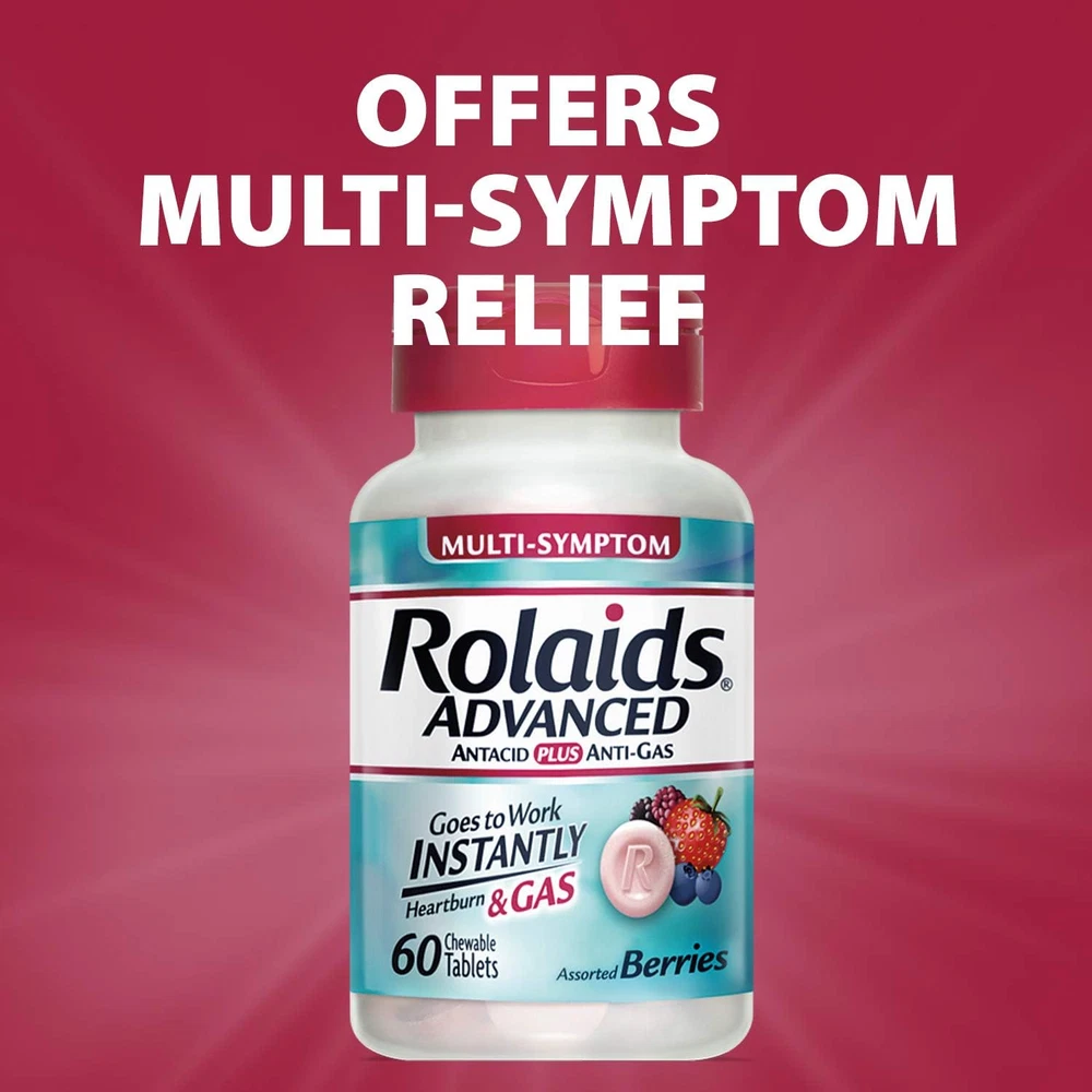 Rolaids Advanced Antacid plus Anti-Gas 60 Chewable Tablets, Assorted Berry, Hear