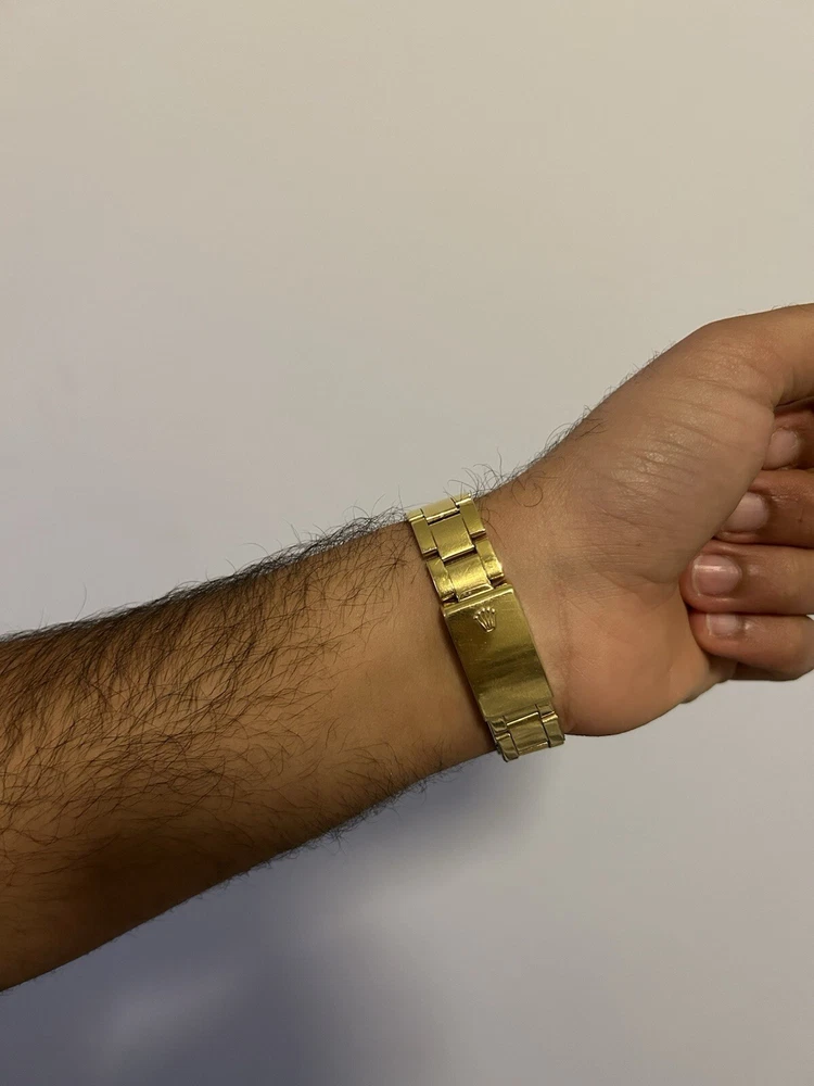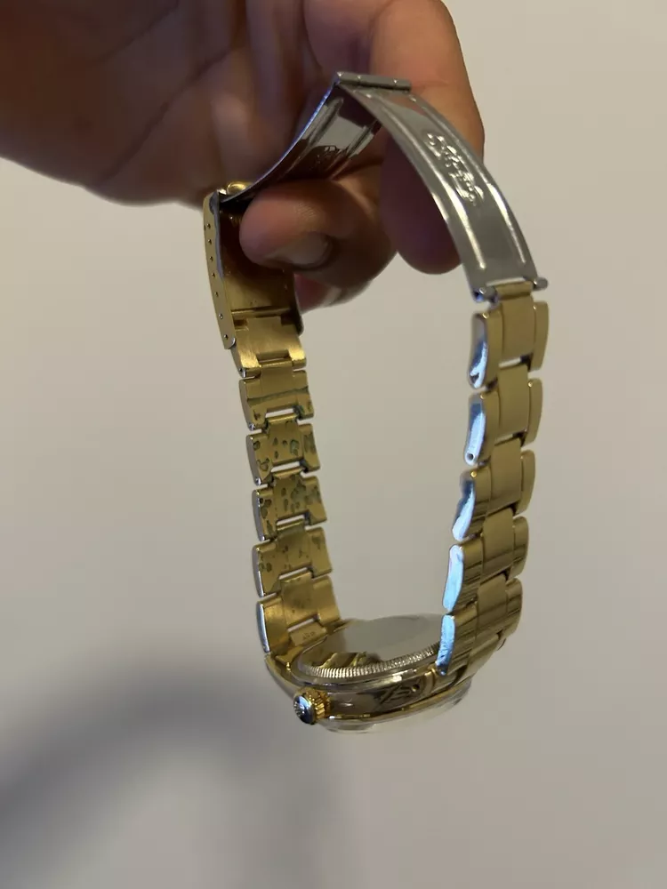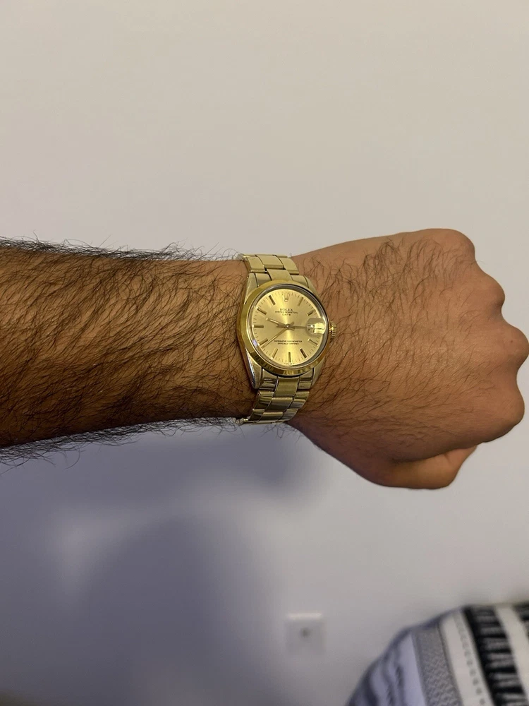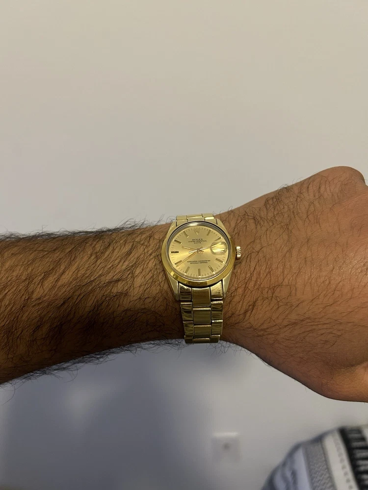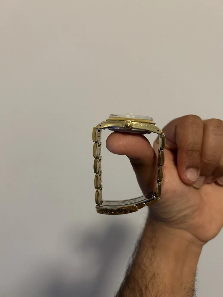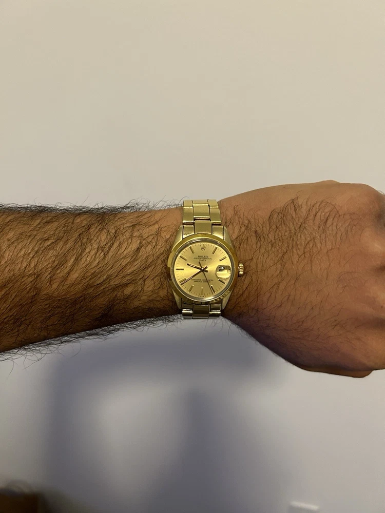 Rolex Date 18k Gold plated with Gold shell case stainless steel 34mm has signs of wear inside bracelet comes with certification of authenticity and watch box. Will be delivered with FREE shipping. Happy bidding and God Bless!