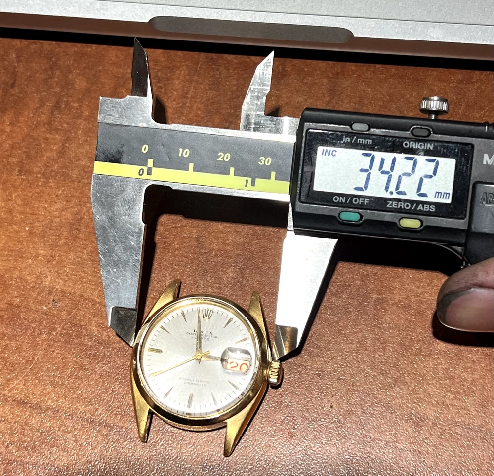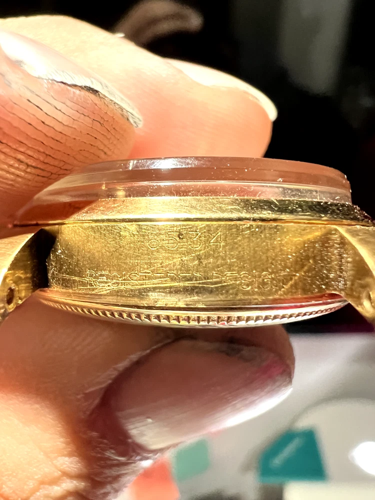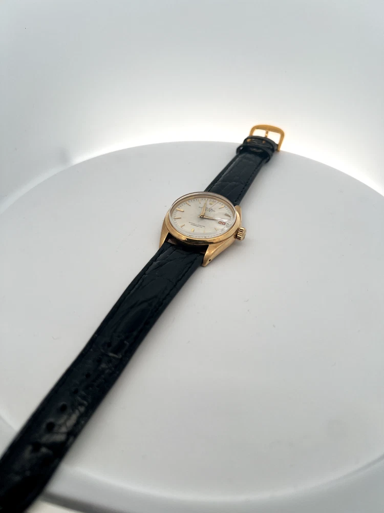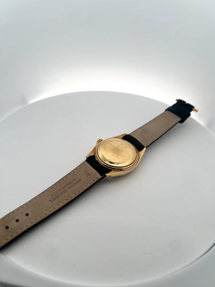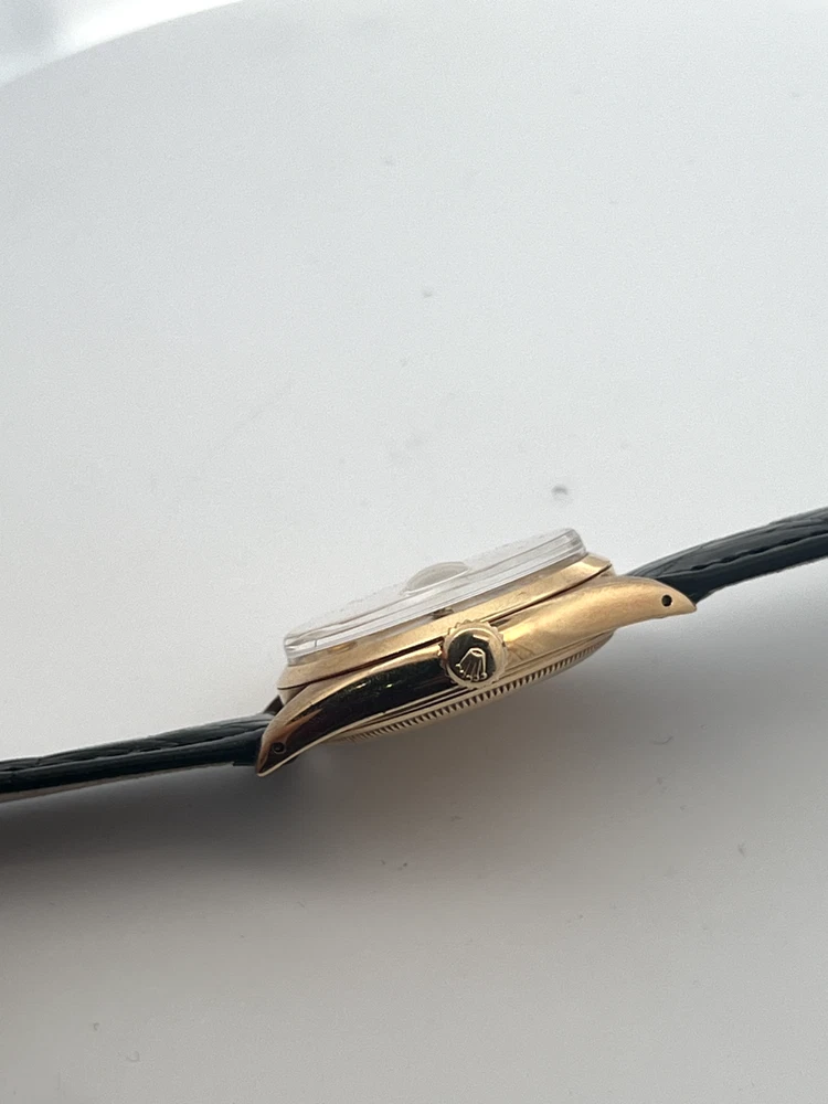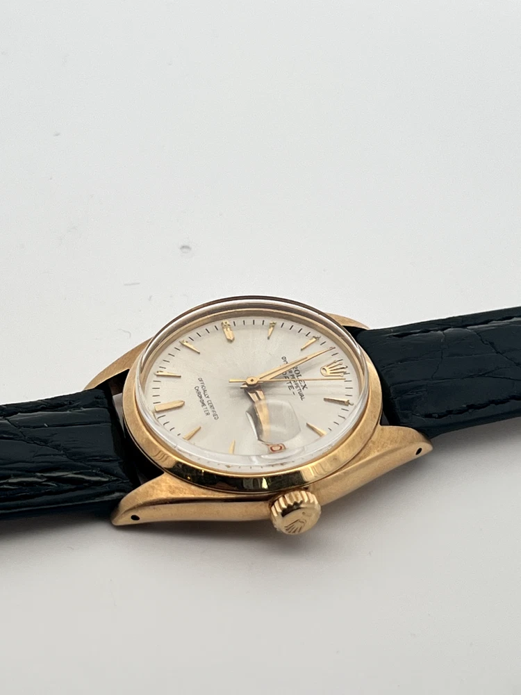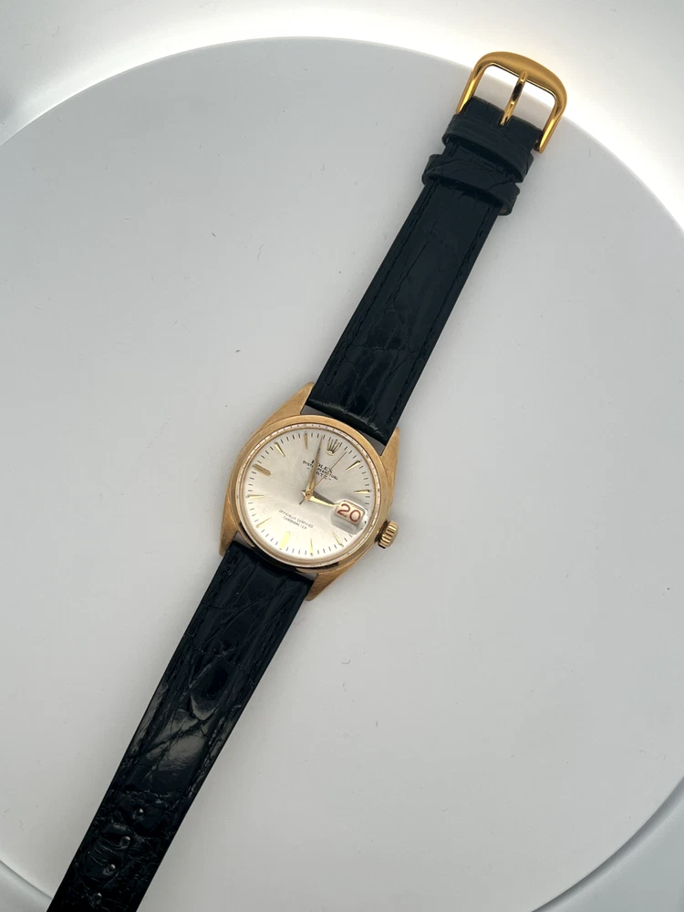 This Rolex Date wristwatch is a luxury timepiece with a yellow gold case and a smooth bezel. The watch features a sunburst dial pattern with arrow, baton, and dagger/dauphine indexes. It was manufactured between 1954-1957 and is vintage. The case is 34mm in size with a thickness of 10mm and a brushed finish. The watch has a buckle closure and a faux leather band with a width of 19mm. This Swiss-made watch has a mechanical (automatic) movement and a date indicator. Does not have papers or original box/packaging. The watch is unisex and has a style that is both classic and luxurious. It is a perfect addition to any watch collection and is sure to impress. Reference at 12 o'clock 6534 & serial numbers at 6 o'clock 408397. Comes with a black leather band & a gold plated buckle. Calendar date is alternating black & red. No work has been done, and is currently running and keeping time & date. Being sold AS IS & NO WARRANTY.