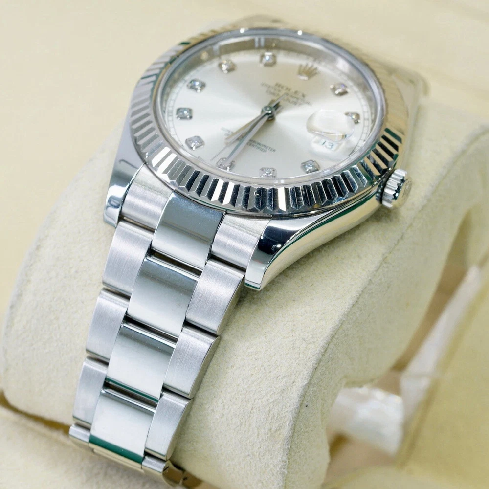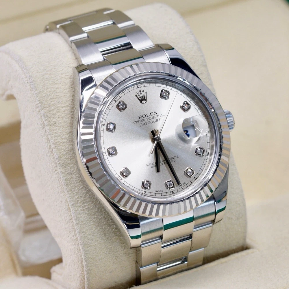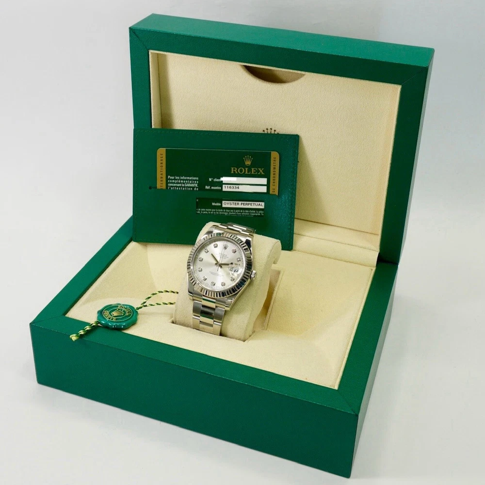 Description GENERAL DESCRIPTION The 116334 is an expression of timeless prestige. It features a silver Diamond dial that add a touch of classic sophistication. Its 41 mm stainless steel case, complemented by a white gold bezel, perfectly fuses durability and luxury. Equipped with a high-precision automatic movement, it guarantees exceptional performance and reliability. WATCH DETAILS The watch is in excellent condition. Clea crystal and bezel. If you have any additional questions regarding the condition of the watch please do not hesitate to contact us. ABOUT US We are a company dedicated to buy and sell luxury watches. We have the highest quality standards and the most detailed selection processes. Each of our pieces is previously checked by our watchmaker to authenticate the quality of the piece. DISCLAIMER 1 - We use a macro lens for professional photography, it is possible that dust or particles may be perceived in the picture. The description of the watch is given in the description 2 - When packed, the watch is handled carefully and meticulously, however, due to transportation and delivery, slight handling marks may occur. COMES WITH Box : Yes Papers : Yes