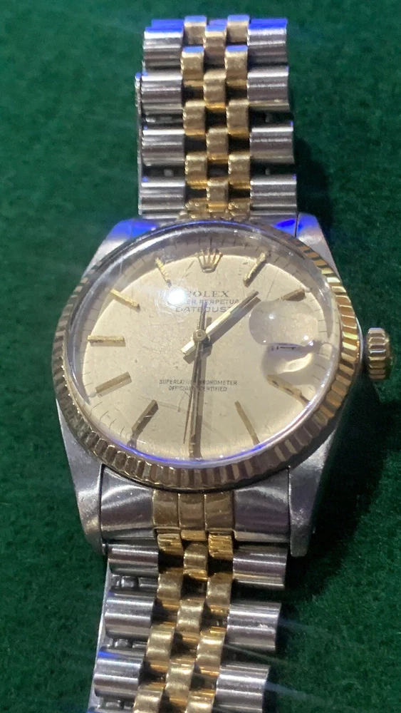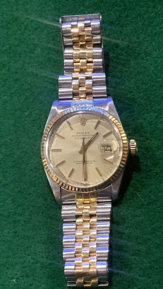 Available now is this excellent Rolex DateJust 16013 from 1979 Below are the features. • Model: Rlx Datejust 16013 . Serial #7,400,000 series . Year: 1983 • Movement: Rlx Calibre 3035 (automatic movement with quickset date) • Case: 36mm stainless steel with 18k yellow gold fluted bezel • Bezel: 18k yellow gold, fluted design • Dial: Silver dial with applied hour markers and luminous hands • Hands: Gold-tone hands with luminescent coating • Crystal: Acrylic crystal with Cyclops lens over the date • Water Resistance: 100 meters (330 feet) • Bracelet: Two-tone (Rolesor) stainless steel and 18k yellow gold Jubilee bracelet with a folding clasp • Functions: Time, date display at 3 o’clock (quickset), power reserve of approximately 48 hours • Special Features: Classic two-tone design with champagne dial, iconic fluted bezel, versatile and elegant for both formal and casual occasions This comes with No Box and papers. It looks sharp, and runs excellent. Has recently been serviced. Crystal has some small scratches, that can be buffed but is not overly noticeable. See photos measurements on bracelet I’m 7-1/2” inches and there is still room to fit larger to 8”.
