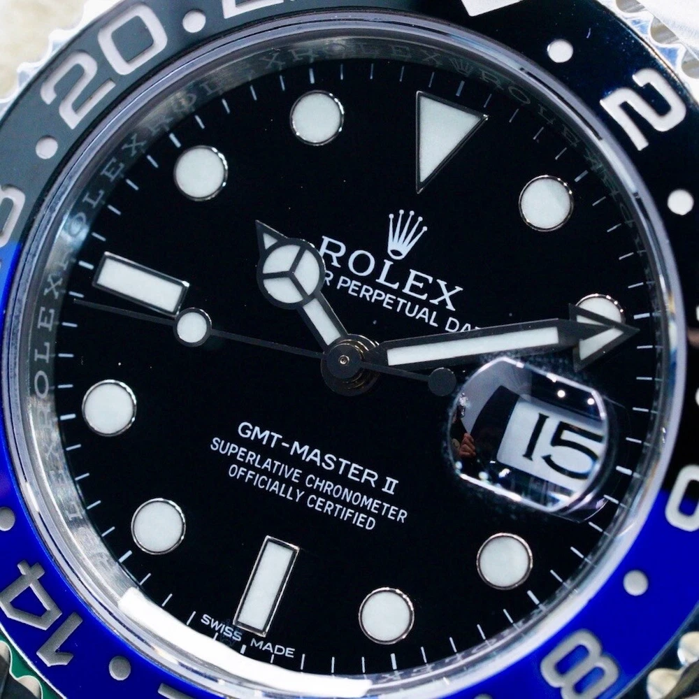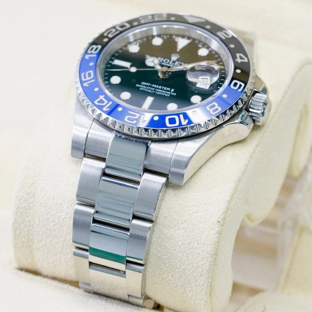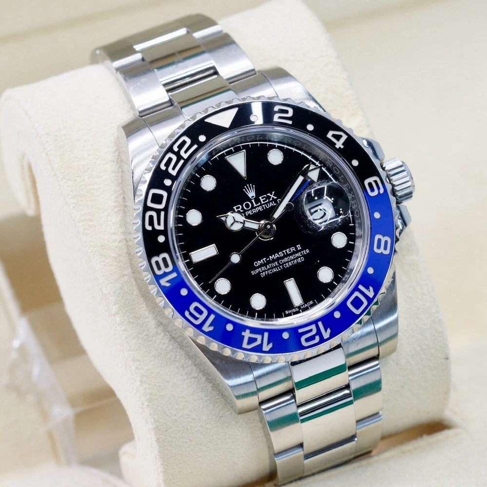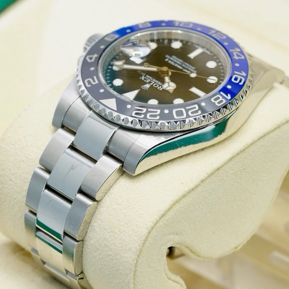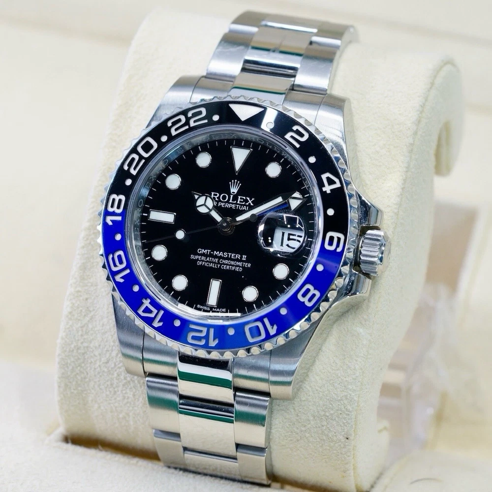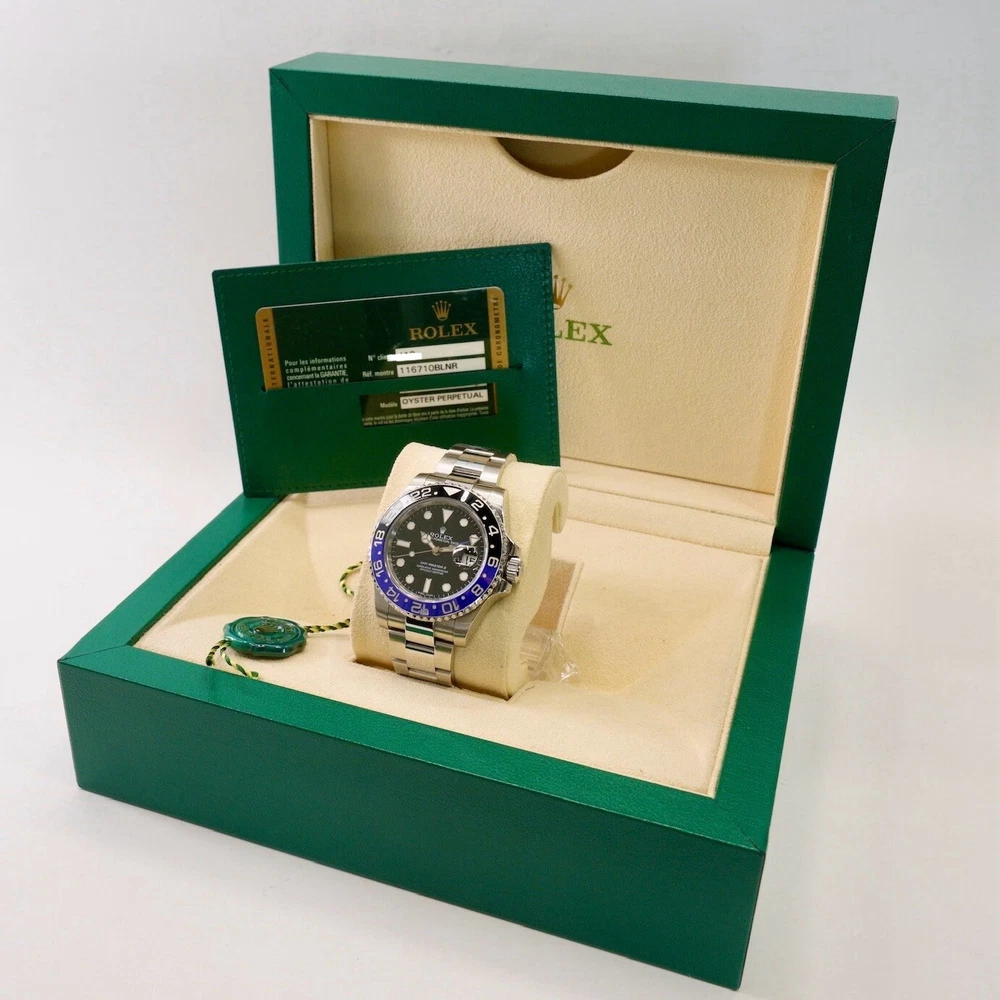 GENERAL DESCRIPTION Introduced in 2013, this watch has become an icon in the world of watchmaking. Its 40 mm stainless steel case houses caliber 3285, offering exceptional precision. The most striking feature of the "Batman" is its black and blue Cerachrom bi-directional rotating bezel, which allows travelers to track two time zones simultaneously. WATCH DETAILS The watch is in excellent condition. Clean crystal and bezel. If you have any additional questions regarding the condition of the watch please do not hesitate to contact us. ABOUT US We are a company dedicated to buy and sell luxury watches. We have the highest quality standards and the most detailed selection processes. Each of our pieces is previously checked by our watchmaker to authenticate the quality of the piece. DISCLAIMER 1 - We use a macro lens for professional photography, it is possible that dust or particles may be perceived in the picture. The description of the watch is given in the description 2 - When packed, the watch is handled carefully and meticulously, however, due to transportation and delivery, slight handling marks may occur. COMES WITH Box : Yes Papers : Yes