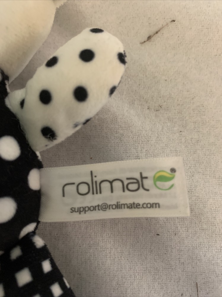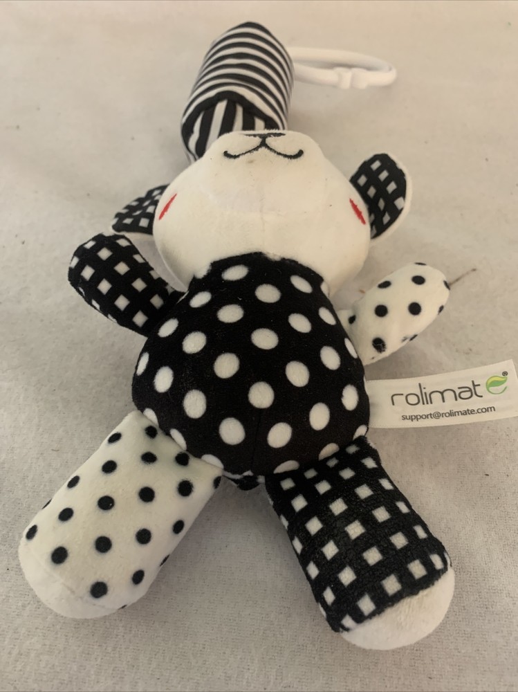 Rolimate Baby Toy Black White Plush Bear Crib Stroller Clip Chime Squeak Crinkle.