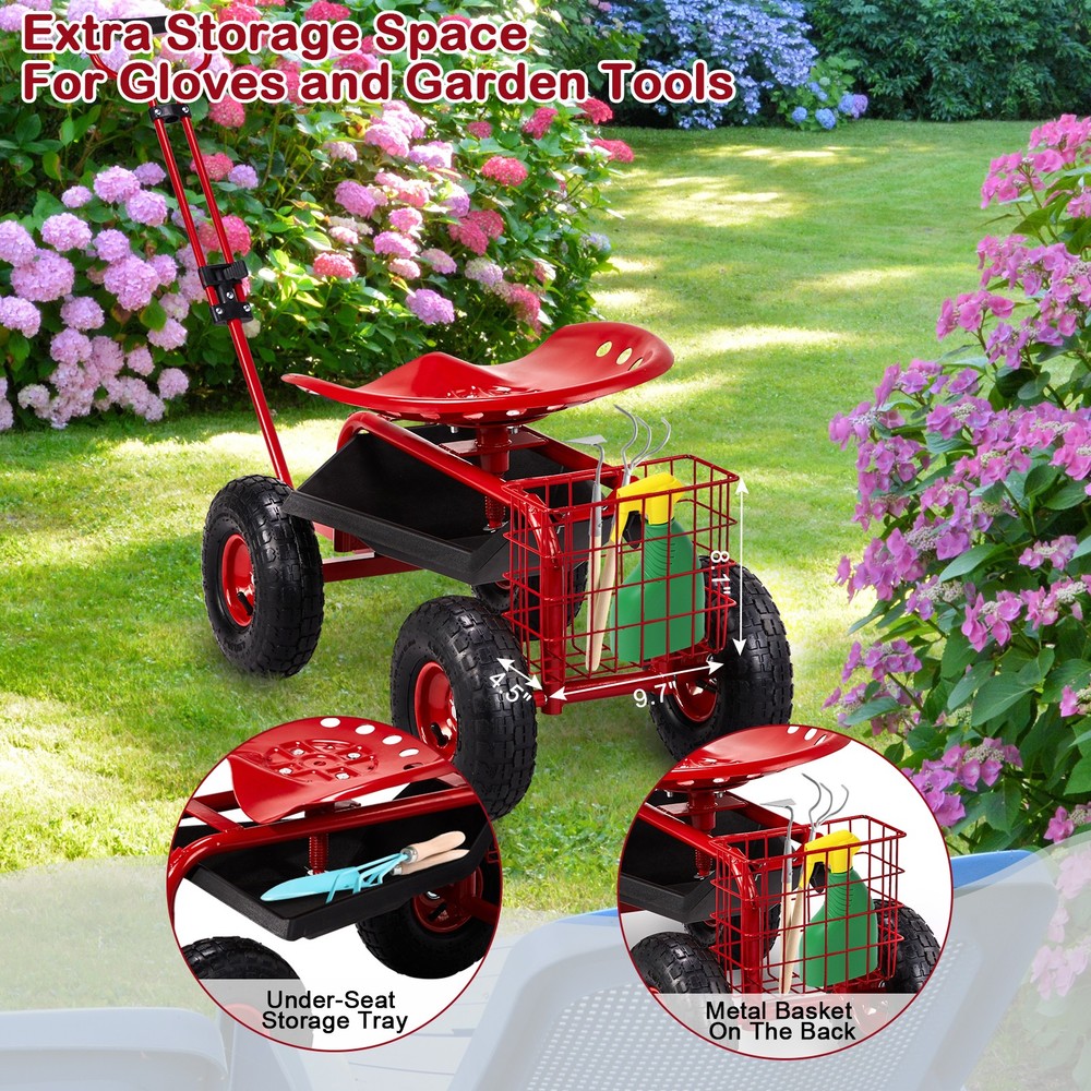 listing template VISIT OUR STORE SIGH UP FOR EMAIL Rolling Garden Cart with 360-Degree Swivel Seat & Tool Tray 3 Color Rolling Garden Work Seat with Wheels, Garden Scooter with 360 Degree Swivel Seat & Extendable Handle & Tool Tray, Gardening Stool for Planting, Red Introductions: Transform your gardening experience with the Rolling Garden Work Seat, designed for ultimate convenience and comfort. This garden scooter features a 360-degree swivel seat with adjustable height, an extendable handle for effortless maneuverability, and inflatable tires that glide smoothly over any terrain. With ample storage for your tools and a durable steel construction, this versatile gardening stool is your perfect companion for planting, weeding, and all outdoor tasks. Features: 1. Comfortable Swivel Seat: The 360-degree swivel seat allows you to easily reach different angles without straining, and its adjustable height range of 5.9 inches meets the needs of gardeners of all heights, reducing pressure on your lower back during long gardening sessions. 2. Extendable Handle for Easy Control: Navigate your garden with precision using the extendable steering handle. Adjustable from 22.6 inch to 32 inch, it provides a customized grip for effortless control and smooth handling. 3. Heavy-Duty Inflatable Tires: The 10-inch inflatable tires enhance stability and grip, enabling the work seat to glide effortlessly across various terrains, including gravel, grass, and soil. Say goodbye to getting stuck while gardening! 4. Convenient Tool Storage: Keep all your essential gardening tools organized and within reach. The spacious rear storage basket and under-seat tool tray provide ample room for everything you need, saving time and effort. 5. Reinforced Steel Construction: Built with a heavy-duty powder-coated steel frame, this gardening stool is made to last. Its sturdy design resists deformation and stands up to outdoor use, ensuring long-term reliability for all your gardening projects. Specifications: 1. Material: Iron 2. Overall Dimensions: (35 x 17.7 x 22.4) in / (89 x 45 x 57) cm 3. Seat Adjustable Height: 5.9 in / 15 cm 4. Wheel Diameter: 10 in / 25 cm 5. Seat Dimensions: (17.7 x 13.4) in / (45 x 34) cm 6. Distance Between Two Wheels: 11 in / 28 cm 7. Basket Dimensions: (9.3 x 4.3 x 7.9) in / (23.5 x 11 x 20) cm 8. Backrest Height: 7.9 in / 20 cm 9. Handle Length: 22.6 in / 57.5 cm (Extended: 31.9 in / 81 cm) 10. Net Weight: 31.3 lbs / 14.2 kg Package Includes: 1 x Garden Cart 1 x Assembly Hardware Set 1 x Instruction Manual You might like this more>> Portable Princess Castle Play House Blue Large Kids Play Tent $23.79 Double Shoe Rack Closet Shelf Storage Organizer $19.49 Oil Painting Easel Sketch Box Portable Folding $57.49 FCH L-Shaped Corner Computer Desk Home Office Desk $109.99 10 Tier Durable Storage Organizer 30 Pair Shoe Tower $18.99 24 Slots PU Leather Wrist Watch Box Display Case Organizer $16.99 Shipping Policy 1. Ship from New Jersey by Standard Int'l Shipping, and only to VERIFIED PAYPAL ADDRESS . 2.International Buyers – Please Note: a. Import duties, taxes and charges are not included in the item price or shipping charges. These charges are the buyer’s responsibility. b. Please check with your country’s customs office to determine what these additional costs will be prior to bidding/buying. 3. Please check your shipping address carefully before checkout, it can't be changed if order completed. 4. All items will be shipped to buyer's ebay address. Before you pay, please make sure your address in ebay match the address you would like us to ship to. 5. Ship within 1 business day once payment completed. We do not ship on weekends or public holidays. 6. Item normally will arrive in 10-15 business days but sometimes goes to 25-30 business days for remote area. That is depends on the freight in different countries. Return Policies 1. Refunds given only if item DOA and cannot be replaced via PAYPAL . If so, Please contact us with 5 days since you receive the item and and return to us within 30 days from the delivery date for exchange or refund. 2. If you need return, please contact our customer service representative, let us know the detailed problem and send us some pictures for confirmation. Payment Payment should be sent within 8(EIGHT) days of auction closing. Feedback If you are dissatisfied for any reason, please do not be quick to leave negative/neutral feedback. We work hard to make sure EVERY CUSTOMER 100% SATISFIED and resolve any problem for you. Work Time Work Time: Monday to Saturday About Us | Newsletter| Feedback| Contact Us Copyright © 2021 City-green. All rights reserved. 无标题文档 Rolling Garden Cart with 360-Degree Swivel Seat & Tool Tray 3 Color Rolling Garden Work Seat with Wheels, Garden Scooter with 360 Degree Swivel Seat & Extendable Handle & Tool Tray, Gardening Stool for Planting, Red Introductions: Transform your gardening experience with the Rolling Garden Work Seat, designed for ultimate convenience and comfort. This garden scooter features a 360-degree swivel seat with adjustable height, an extendable handle for effortless maneuverability, and inflatable tires that glide smoothly over any terrain. With ample storage for your tools and a durable steel construction, this versatile gardening stool is your perfect companion for planting, weeding, and all outdoor tasks. Features: 1. Comfortable Swivel Seat: The 360-degree swivel seat allows you to easily reach different angles without straining, and its adjustable height range of 5.9 inches meets the needs of gardeners of all heights, reducing pressure on your lower back during long gardening sessions. 2. Extendable Handle for Easy Control: Navigate your garden with precision using the extendable steering handle. Adjustable from 22.6 inch to 32 inch, it provides a customized grip for effortless control and smooth handling. 3. Heavy-Duty Inflatable Tires: The 10-inch inflatable tires enhance stability and grip, enablin