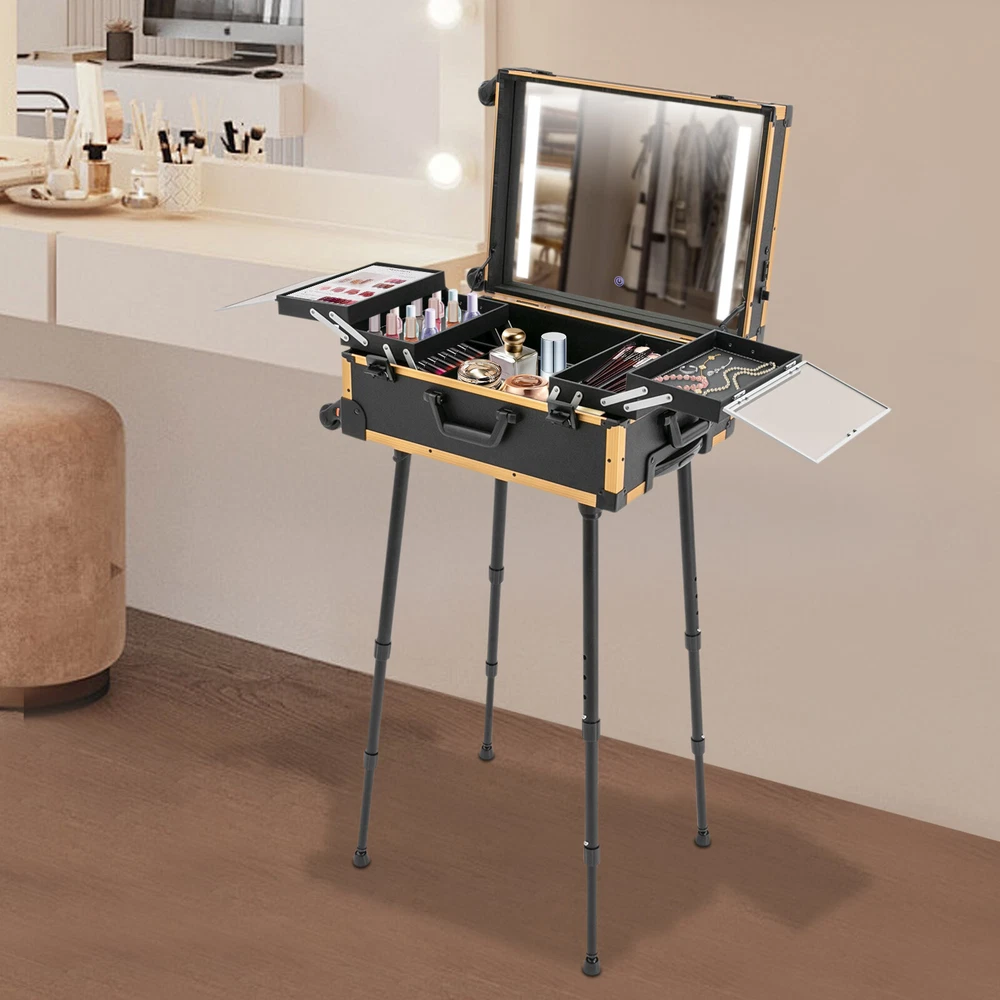 Whether you're working or traveling, a professional makeup case will be a great convenience. This makeup case is made of high-quality material, which is strong and durable. The compartmentalized design makes the items neatly organized, and the clear mirror and LED lights are convenient for you to apply makeup in various environments. It is ideal for professional makeup artists and cosmetologists. Rolling Makeup Case Trolley Train Box Organizer with LED Lighted Mirror Welcome to our store~ High-quality Material: The product is made of high-quality aluminum alloy, medium fiberboard, ABS, and PVC with oxidation and electroplating processes, which are strong, pressure-resistant, waterproof, impact-resistant, corrosion-resistant, rust-resistant , and has a long service life. Humanized Design: The large mirror with LED light can be easily adjusted between warm, neutral and white light with the touch of the switch and the brightness of the light can be infinitely adjusted with a long press of the switch, which can help you see more details of your makeup and restore the true state of your makeup. Categorized Storage: This product has four storage trays for makeup brushes, nail polish, foundation, eye shadow, hair clips, and other tools (not included). The neat and orderly distribution and sorting trays keep the tools in order, which is an essential and good helper for you. Convenient to Use: This product is equipped with a 12V charging jack, an external power jack, and a power jack. After connecting the power cord, it can be connected to an external curling iron, cell phone, and hair dryer (not included) to meet your needs when working. Protect Your Privacy : Two locking buckles with keys securely protect your valuables inside the box and maximize your privacy. Flexible Movement: 4 universal wheels, a telescopic trolley rod, and a top handle make it easy to move the case up and down stairs, in and out of cars and elevators. The detachable universal wheels enable you to replace them conveniently when damaged, which is easy and cost-efficient. Ideal Gift: With a stylish appearance and practical functions, this product is an ideal birthday and holiday gift for family, friends, fashionistas, and beauty lovers. Effortless Cleaning: Thanks to the smooth surface and simple structure, you can easily wipe off the dirt on it with a soft cloth. Good Customer Service: We stand behind all our guests and look forward to assisting you with your purchase. It is our pleasure to answer your confusion and questions. The end of the story between us is not "we sell and you buy". Details Adjustable Support Legs: The support legs have four adjustable heights (29.33in, 30.71in, 32.09in, and 33.46in) for people of different heights. Removable Tray: Two hooks and loops on the inside of the case make it easy to secure the tray and remove it for individual use. Wide Opening : With a wide opening, it is easy for you to store and retrieve certain items without messing up other items in the box. Application This product is suitable for travel, wedding, event, and home makeup use, and can organize makeup brushes, nail polish, foundation, eye shadow, hair clips, and other tools. It is ideal for makeup artists, hair stylists, nail technicians, and cosmetologists. Package Included 1* Makeup Case 4* Legs 1* Storage Bag 2* Keys 1* USB Cable 1* Power Cord All Accessories for Installation DESCRIPTION 2 Notes Please note that cosmetics and make-up tools are not included. Wear and tear is normal for cosmetic cases after use. Please try to avoid excessive impacts and drops during daily use to minimize the wear and tear of the case. Please use soft tools for cleaning. Please use water to clean, away from corrosive liquid. Please avoid long-term exposure to the sun. Please remove the debris around the wheels in time to keep the dragging smooth. Please allow the slight color difference caused by the shooting light and the 1-3 cm error due to manual measurement, and make sure you do not mind before ordering. ↓↓↓ Payment Delivery details Terms of sales About us Contact us Payment We accept ebay payment 。 Fees such as import duties, taxes are not included in the item price or shipping costs. These charges are the buyer's responsibility. Delivery details Shipping: 2-9 working days to: USA Terms of sales We maintain high standards of excellence and strive for hundred percent customer satisfaction. Feedback is very important to us. We hope that you contact us immediately before you give neutral or negative feedback, so that we can address your concerns. It is impossible to address issues if we do not know about them! About us Your satis faction is our ultimate goal. We work hard to earn your trust and future business. Our certified technicians have tested each item before shipping. The unit comes with 1 year limited warranty on all manufacturing defects. a) If you receive a defective item, you may return it or ask for a discount. Please contact us within 14 days after you receive the package. b) What you returned must be intact and in its original packaging as re? u. Customer is responsible for shipping costs of the returned item. c) We will cover the cost of shipping back t with the shipping rate indicated in the registration page. We will send you a new unit or refund the full payment you paid. Thank you. Contact us Business Hour Business Hour: Monday To Friday: 8:30 AM to 5:00 PM (Beijing China time) Due to time zones, our reply to your questions may not be immediately. But within above working time, we will reply your email within 24 hours. If it's non-workdays, please kindly be patient and wait till Monday. Please contact us with ebay message. Please feel free to contact us if you have any questions. Monday To Friday: 8:30 AM to 5:00 PM (Beijing China time) Due to time zones, our reply to your questions may not be immediately. But within above working time, we will reply your email within 24 hours. If it's non-workdays, please kind