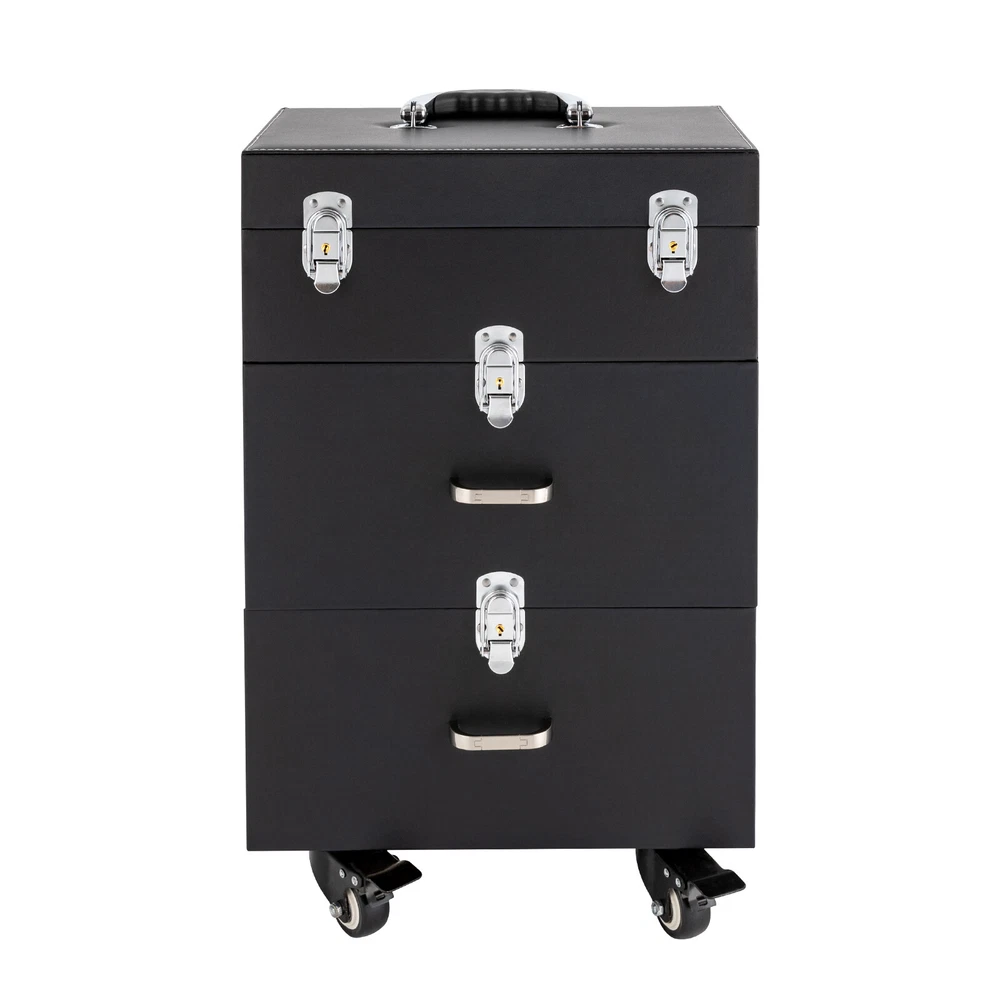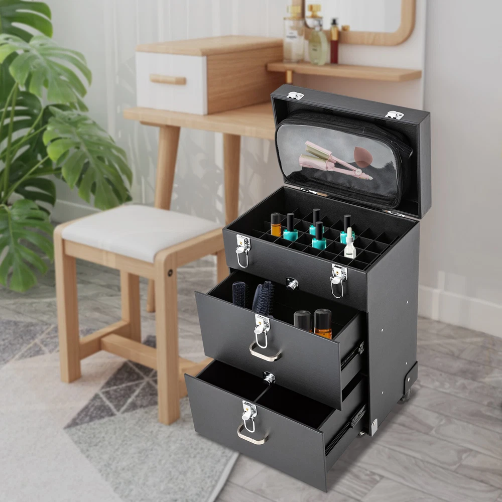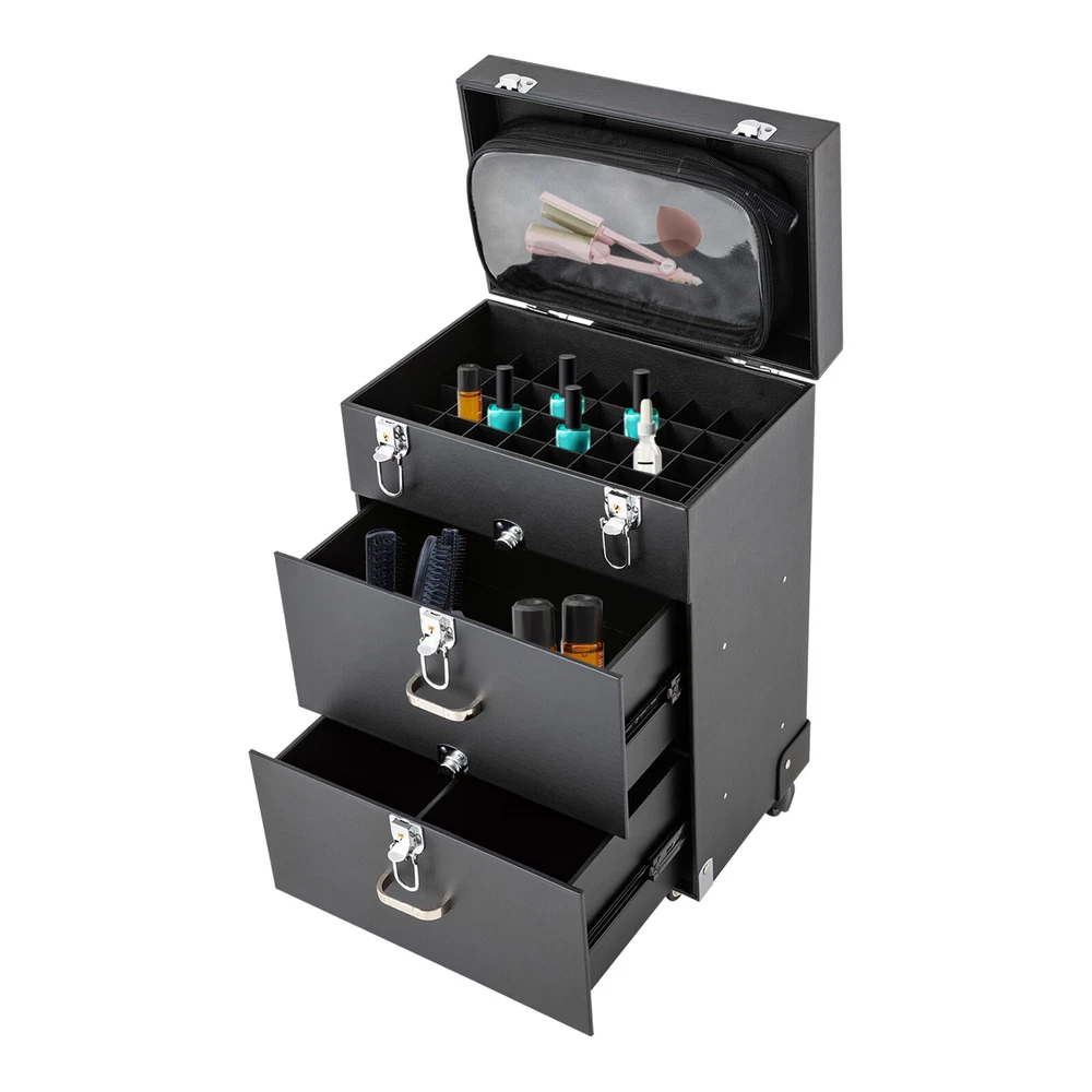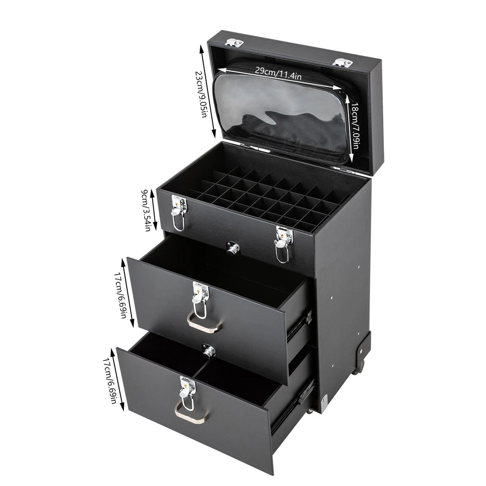Rolling Makeup Train Case Aluminum Salon Cosmetic Trolley Organizer Box+Drawer Description This is a rolling makeup train case designed for professional beauty artists to make up anytime and anywhere. It is constructed of high-quality PU, wood, PVC , and aluminum alloy that is sturdy and durable. It has extra large capacity compartments and multi-layer drawers. This case is ideal for all people who love beauty or nail art. Key Features High-quality Material: This product is made of high-qualit y PU, wood, PVC, and aluminum alloy, with c orrosion resistance , wear resistance , and not easy to fade. Categorized Storage: Three compartments and a removable grid tray allow you to organize beauty products of different functions and sizes and make it easy to find the tools you want quickly . High Privacy: Four locking cylinders securely protect your valuables inside the box and maximize your privacy. Large Capacity: One 3.54in high tray and two 6.69 high trays can store a variety of cosmetics and beauty appliances, such as perms, nail machines and light therapy supplies, its ample storage space will be able to meet your multiple storage needs. Outstanding Load Capacity: The rectangular structure gives it an excellent load capacity (up to 99 lbs). You can put all your beauty tools in it with confidence. Easy to Move and Carry: The easy-to-move silent universal wheels (two of them can be fixed), three-position telescopic trolley rod, and a top handle make it more convenient to carry on the go, especially suitable for nail technicians and cosmetologists who have a lot of tools and need to be on the go frequently. Stylish Appearance: Its simple structure and black color give people a fashionable and elegant feeling. Such a vintage makeup case can nicely decorate your dressing room and make a good impression when you go out to work. Protective Shipping: To prevent the product from being damaged during transportation as much as possible, this product uses a rigid cardboard box, plastic bag, and foam that can effectively resist normal compression and drops. Details Clear Storage Bag: The clear storage bag on the inside of the lid allows for wet and dry storage and avoids cross-contamination. In addition, the double zipper design not only makes it easier to open and close, but also gives it a better seal. Corner Reinforcement: The bottom corner reinforcement design makes the box structure more stable, thus providing you with more excellent quality assurance. Smooth Tracks: Smooth drawer tracks make the drawing smoother and less noisy. Ergonomic Handles: The top handle has an ergonomic four-finger structure and a slow rebound damping design, making it more comfortable to hold and less likely to break. In addition, two drawer handles make it easy to pull out the drawer. Application This rolling makeup train case is suitable for professional make-up artists, hairdressers, nail technicians, and beauticians in beauty centers, salons, private homes, parties, and other occasions. Specification Material: PU, Wood, PVC, Aluminum Alloy Color: Black Shape: Rectangular Assembly Required: No Opening Method: Latch Carrying Parts: Retractable Handle Rolling Wheel Style: Universal Wheel Number of Trays: 3 Maximum Load: 45kg/99lbs Gross Weight: 9.2kg/ 20.28 lbs Net Weight: 8kg/ 17.64 lbs Package Size: 42*34*64 cm/ 16.54* 13.39*25.2 in Footprint: 36*23cm/14.17*9.05in Top Cover Height from Ground: 49cm/19.29in Top Cover Size: 29*23*5cm/11.4*9.05*1.97in Telescopic Rod Extension Height from Case: 45cm/17.72in First Tier Height: 9cm/3.54in Second Tier Height: 17cm/6.69in Third Tier Height: 17cm/6.69in Package Included 1 * Rolling Makeup Train Case 2 * Keys Notes It's normal for the tie rod to wobble a little bit as it needs clearance to move back and forth better. If it is too tight, it will harm the tie rod instead. Please make sure you don't mind before purchasing. Please allow the slight color difference caused by the shooting light and the 1-3 cm error due to manual measurement, and make sure you do not mind before ordering. Payment Delivery details Terms of sales About us Contact us Payment We accept ebay payment 。 Fees such as import duties, taxes are not included in the item price or shipping costs. These charges are the buyer's responsibility. Delivery details Shipping: 2-9 working days to: USA Terms of sales We maintain high standards of excellence and strive for hundred percent customer satisfaction. Feedback is very important to us. We hope that you contact us immediately before you give neutral or negative feedback, so that we can address your concerns. It is impossible to address issues if we do not know about them! About us Your satis faction is our ultimate goal. We work hard to earn your trust and future business. Our certified technicians have tested each item before shipping. The unit comes with 1 year limited warranty on all manufacturing defects. a) If you receive a defective item, you may return it or ask for a discount. Please contact us within 14 days after you receive the package. b) What you returned must be intact and in its original packaging as re? u. Customer is responsible for shipping costs of the returned item. c) We will cover the cost of shipping back t with the shipping rate indicated in the registration page. We will send you a new unit or refund the full payment you paid. Thank you. Contact us Business Hour Business Hour: Monday To Friday: 8:30 AM to 5:00 PM (Beijing China time) Due to time zones, our reply to your questions may not be immediately. But within above working time, we will reply your email within 24 hours. If it's non-workdays, please kindly be patient and wait till Monday. Please contact us with ebay message. Please feel free to contact us if you have any questions. Monday To Friday: 8:30 AM to 5:00 PM (Beijing China time) Due to time zones, our reply to your questions may not be immediately. But within above working time, we will reply your email within 24 hours. If it'