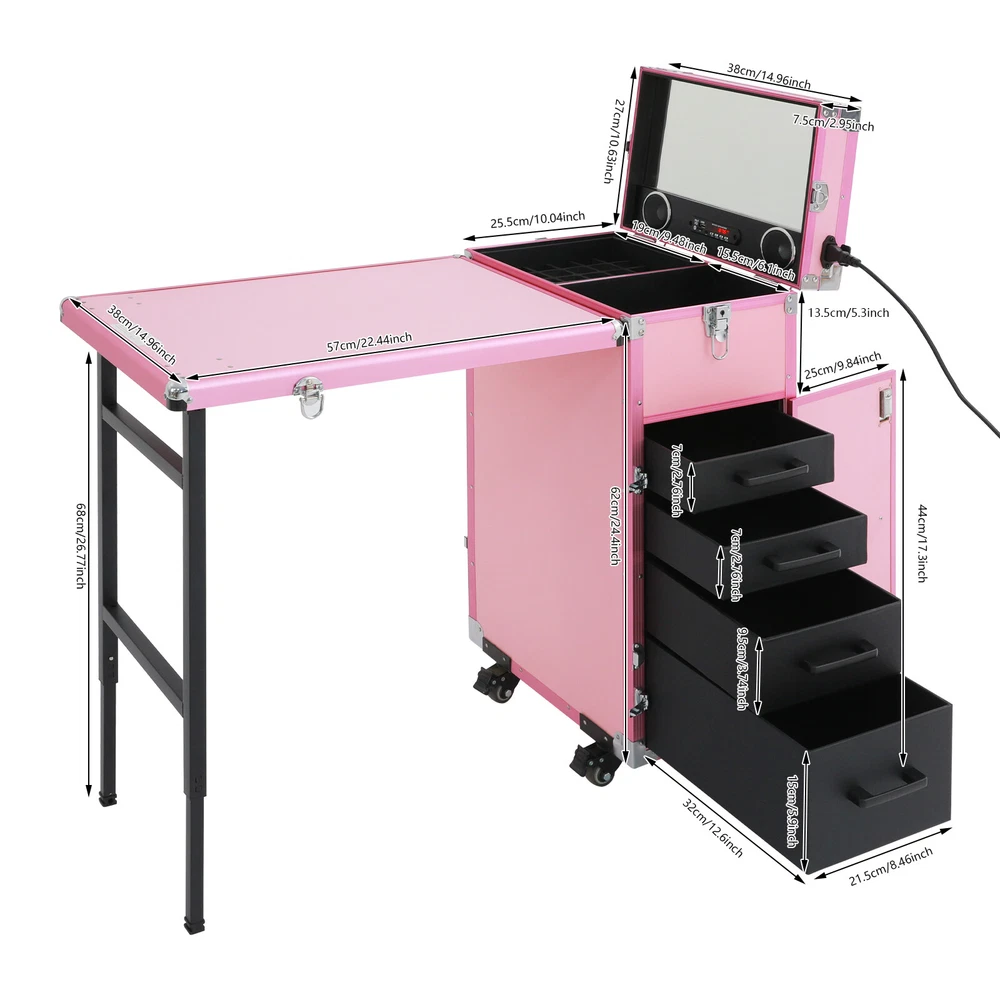 Package Included 1*Cosmetic Trolley Storage Organizer 1*Remote Control 1*Adapter 2*Keys Rolling Manicure Table Nail Desk Travel Train Case Cosmetic Trolley & Speaker US Description A good hairstyle and makeup can bring us a new look, but messy tools often affect our work efficiency. Our cosmetic trolley storage organizer can eliminate your concerns. Made of MDF, aluminum and iron, this case is durable and flexible for moving, so you can use it for a long time and save costs. In addition, the large capacity and compact design can provide convenience for your daily use and carry. Come and build your own beauty boutique right now! Specifications Material: MDF, Aluminum, Iron, PVC Process: Die Casting, Electroplating Color: Pink Style: Modern Shape: Rectangular Plug Type: US Standard Power Cord Length: 1.8m/5.91ft Maximum Load Capacity: 50kg/110.23lbs Net Weight: 16.45kg/36.27lbs Gross Weight: 19.5kg/42.99lbs Table Expanded Dimension: 57*38*68cm/22.44*14.96*26.77inch Package Size: 88*50*39cm/34.65*19.69*15.35inch Package Included 1*Cosmetic Trolley Storage Organizer 1*Remote Control 1*Adapter 2*Keys Key Features Sturdy and Durable: High-quality MDF, aluminum frame and iron clad corners with die casting and electroplating processes make the product book antiqua-resistant, crash-proof and sturdy, you can use it for a long time without frequent replacement, which saves cost to a certain extent. Fingertip Magic: It is designed with multi-functional storage compartments, which is your "treasure box". It carries not only various tools, but also your magic and dreams. As if you raise your hand, you would conduct a colorful fingertip magic. Mobile Makeup Studio: It is equipped with 4 universal wheels, all with brakes that can be locked. It is also equipped with an expandable floor workstation that can be converted into an additional makeup workstation, and equipped with a portable mirror for easy indoor and outdoor makeup. Enjoy Music: It has 2 built-in music speakers, so you can play music by connecting it to Bluetooth, an SD card, and a USB port, allowing you or your guests to relax during the makeup process. Ample Space: It consists of a foldable table, an upper compartment with slots for small items, and a lower compartment with 4 removable drawers, which organize different items into one box to fully meet your storage needs. High Load-bearing: the rectangular frame and high-quality materials allow it to withstand up to 110.23 pounds without collapsing, so you can use it with confidence. High Safety and Privacy: Comes with 2 three-digit combination locks and 2 keys to provide double security and privacy for your belongings. In addition, side latch locks the table securely to the case when not needed without smashing your feet or taking up space. Protective Packaging: To prevent the product from being damaged during transportation as much as possible, this product uses foam that can effectively resist normal compression and drops. Details Long Power Cord: A 5.91ft long power cord meets the needs of long-distance use. Handle: The ergonomic handle makes it easy to move to the case. Hinge: It makes opening and closing more smoothly, and provides bigger opening angle(90°). Application This product can be widely used by hair stylists, pet groomers, makeup artists, and so on for storing scissors, makeup, jewelry, combs, and other items. It's also suitable for outdoor use, such as street performances, makeshift makeup rooms, or accessory stalls at flea markets and suitable for you to store tools or daily necessities when you go out. Notes Please keep the product away from corrosive substances. Please allow the slight color difference caused by the shooting light and 1-3cm error due to manual measurement, and make sure you do not mind before you order. Payment Delivery details Terms of sales About us Contact us Payment We accept ebay payment 。 Fees such as import duties, taxes are not included in the item price or shipping costs. These charges are the buyer's responsibility. Delivery details Shipping: 2-9 working days to: USA Terms of sales We maintain high standards of excellence and strive for hundred percent customer satisfaction. Feedback is very important to us. We hope that you contact us immediately before you give neutral or negative feedback, so that we can address your concerns. It is impossible to address issues if we do not know about them! About us Your satis faction is our ultimate goal. We work hard to earn your trust and future business. Our certified technicians have tested each item before shipping. The unit comes with 1 year limited warranty on all manufacturing defects. a) If you receive a defective item, you may return it or ask for a discount. Please contact us within 14 days after you receive the package. b) What you returned must be intact and in its original packaging as re? u. Customer is responsible for shipping costs of the returned item. c) We will cover the cost of shipping back t with the shipping rate indicated in the registration page. We will send you a new unit or refund the full payment you paid. Thank you. Contact us Business Hour Business Hour: Monday To Friday: 8:30 AM to 5:00 PM (Beijing China time) Due to time zones, our reply to your questions may not be immediately. But within above working time, we will reply your email within 24 hours. If it's non-workdays, please kindly be patient and wait till Monday. Please contact us with ebay message. Please feel free to contact us if you have any questions. Monday To Friday: 8:30 AM to 5:00 PM (Beijing China time) Due to time zones, our reply to your questions may not be immediately. But within above working time, we will reply your email within 24 hours. If it's non-workdays, please kindly be patient and wait till Monday. Please contact us with ebay message. Please feel free to contact us if you have any questions.