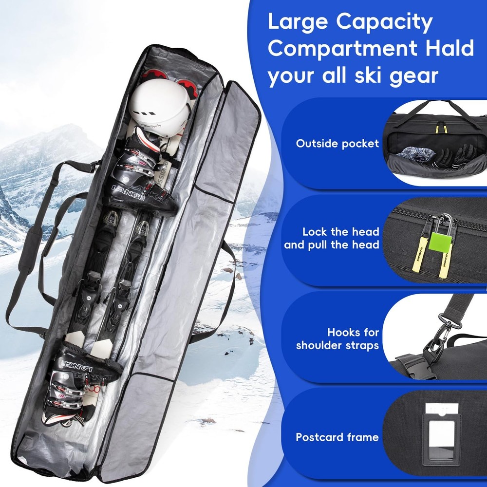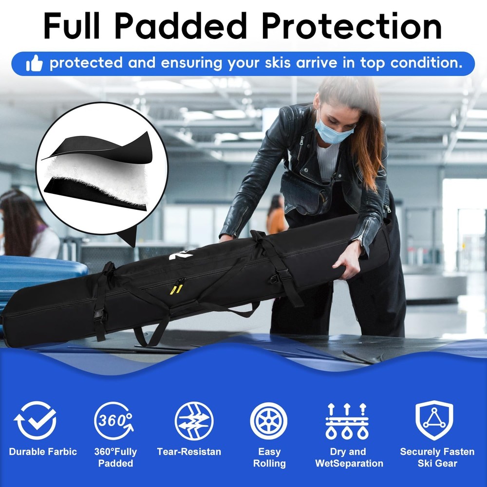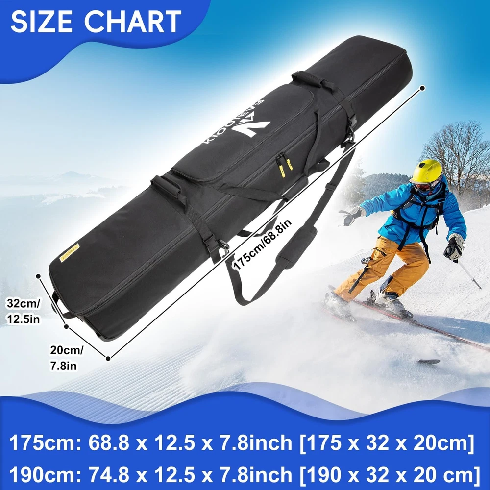 Rolling Ski Bag - Fully Padded Ski Bag with Wheels for Air Travel size options : sizes :175cm: 68.8 x 12.5 x 7.8inch[175 x 32 x 20cm] or 190cm: 74.8 x 12.5 x 7.8inch[190 x 32 x 20 cm]. Product Details: High-density polyester Fully padded, lightweight design - dense foam padding throughout. LARGE, spacious main compartment - keep your bindings mounted Padded shoulder strap - detachable Luggage ID card slot Fit Almost All Ski Sizes:This padded ski bag can fit almost all skis up to 190 cm and is equipped with multiple interior straps to keep your gear securely in place, accommodating skis of various sizes. Double Rolling Ski Bag: The inner strap secures your skis or secures your snowboard, this snowboard bag also can hold pairs of skis or snowboard, featuring adjustable webbing design for easy adjustment based on your skiing needs. Heavy Duty Wheels for Easy Roling: Ski bag for air travel are built with durable wheels and thickened back panel, featuring smooth-rolling wheels for easy transport across any terrain. Full Padded Protection: Our rolling double ski bag for flying feature EPE foam padding and 600D water-resistant polyester, super tough, and keeps your gear organized and protected and ensuring your skis arrive in top condition. What to Expect: Measures 175/190x 32x 20 cm, 2 kg; Thank you very much for the customers who bought our products. We always put customer satisfaction first. If there is any problem with the purchase of our ski bag, please with our in time. We will help to deal with it at the first time.