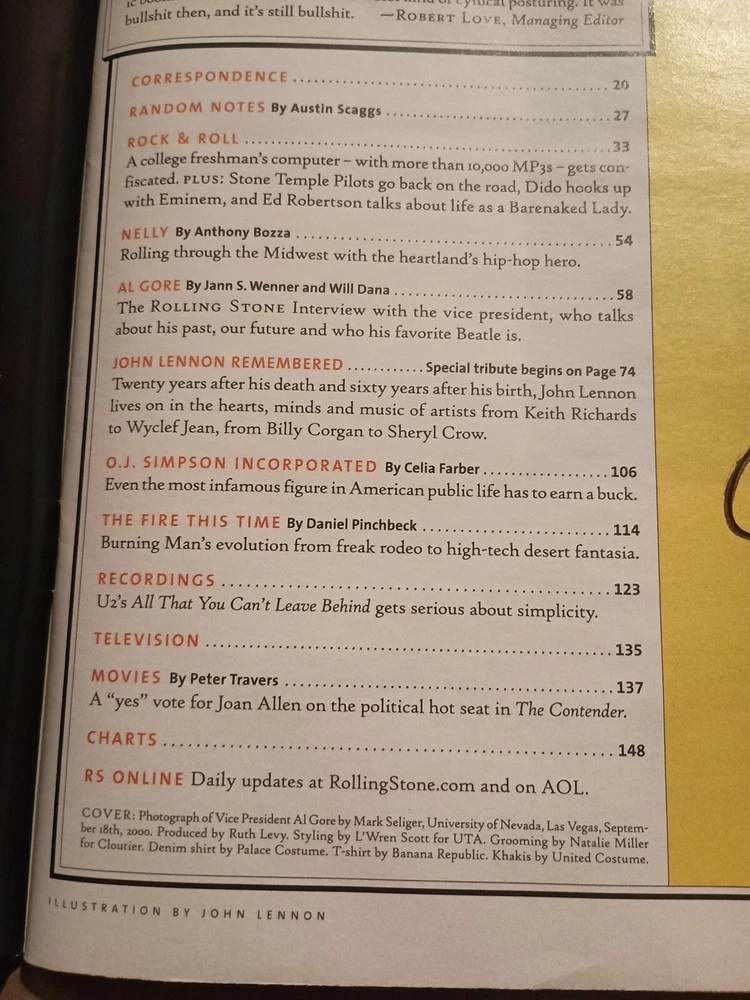 This issue of Rolling Stone magazine features Al Gore on the cover and includes articles on John Lennon, news, and general interest topics.