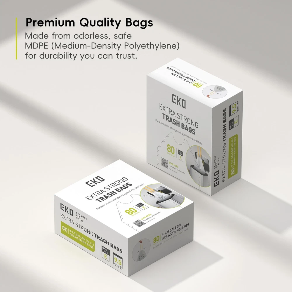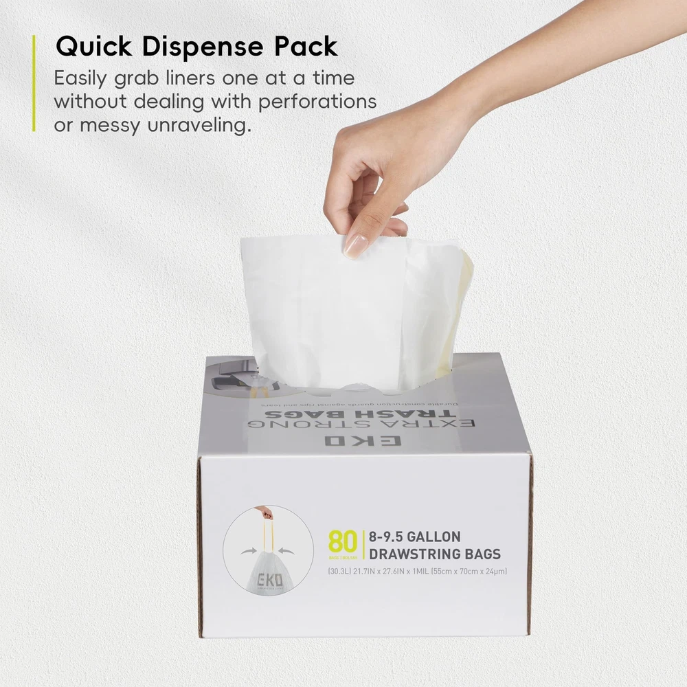 EXCEPTIONAL STRENGTH: With substantial thickness, trash bags are designed for unmatched durability, providing superior resistance against rips and tears. LEAKPROOF CONFIDENCE: Enjoy peace of mind with our innovative layered construction, which effectively prevents leaks and spills, keeping your space clean and mess-free. LIFT, TIE, AND CARRY WITH EASE: Our convenient drawstring design ensures effortless lifting, tying, and carrying, making waste disposal tasks quick and simple. EASY DISPENSE PACK: Featuring 2 rolls with a total of 80 bags, our easy dispense pack offers a continuous supply of reliable trash bags, ensuring you're always prepared. VERSATILE FIT: Perfectly sized for trash cans, these bags also accommodate a variety of other containers, providing flexible and versatile waste management solutions.