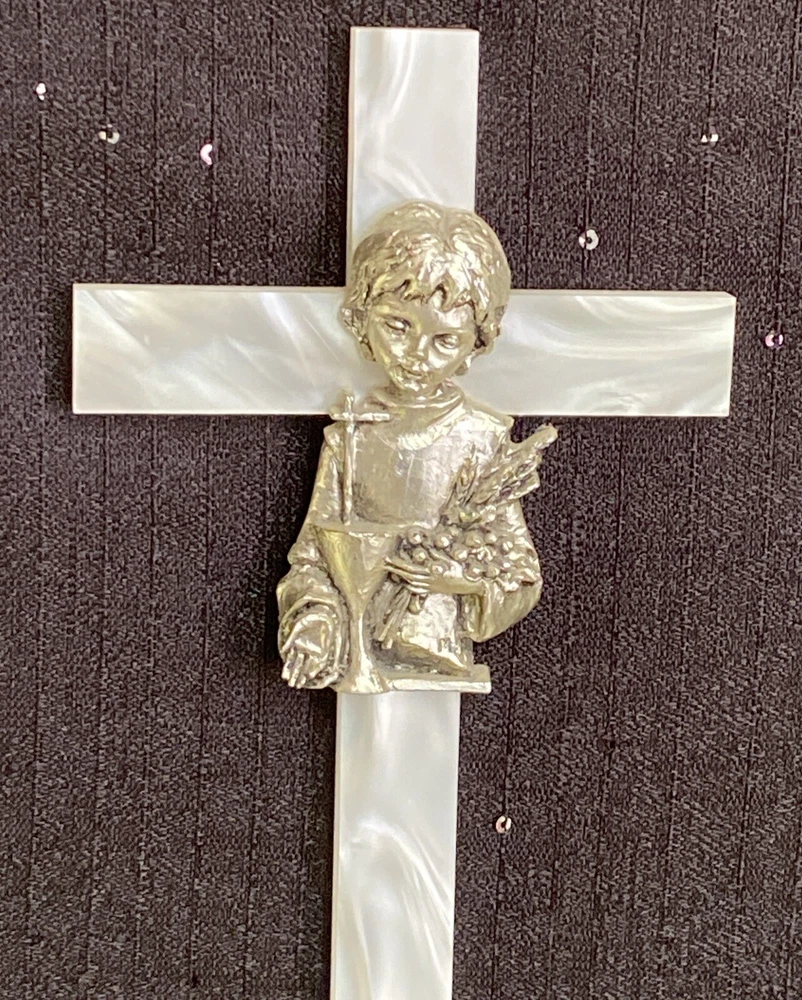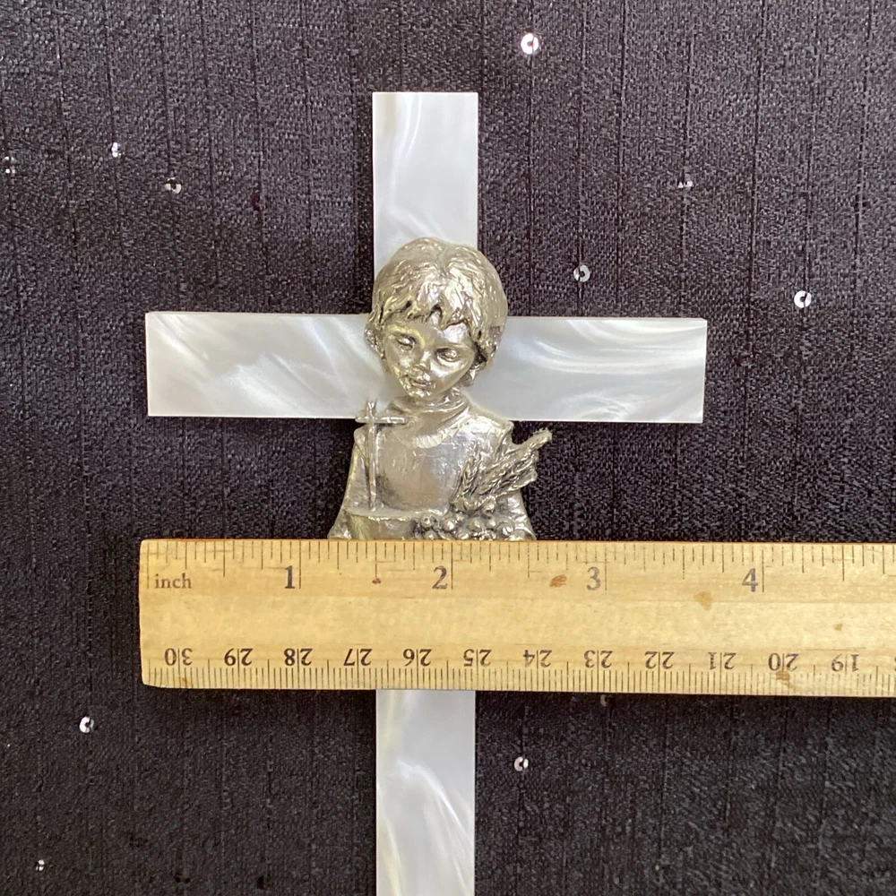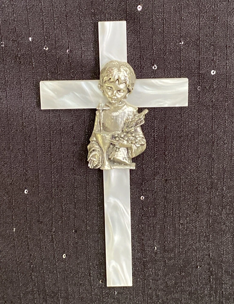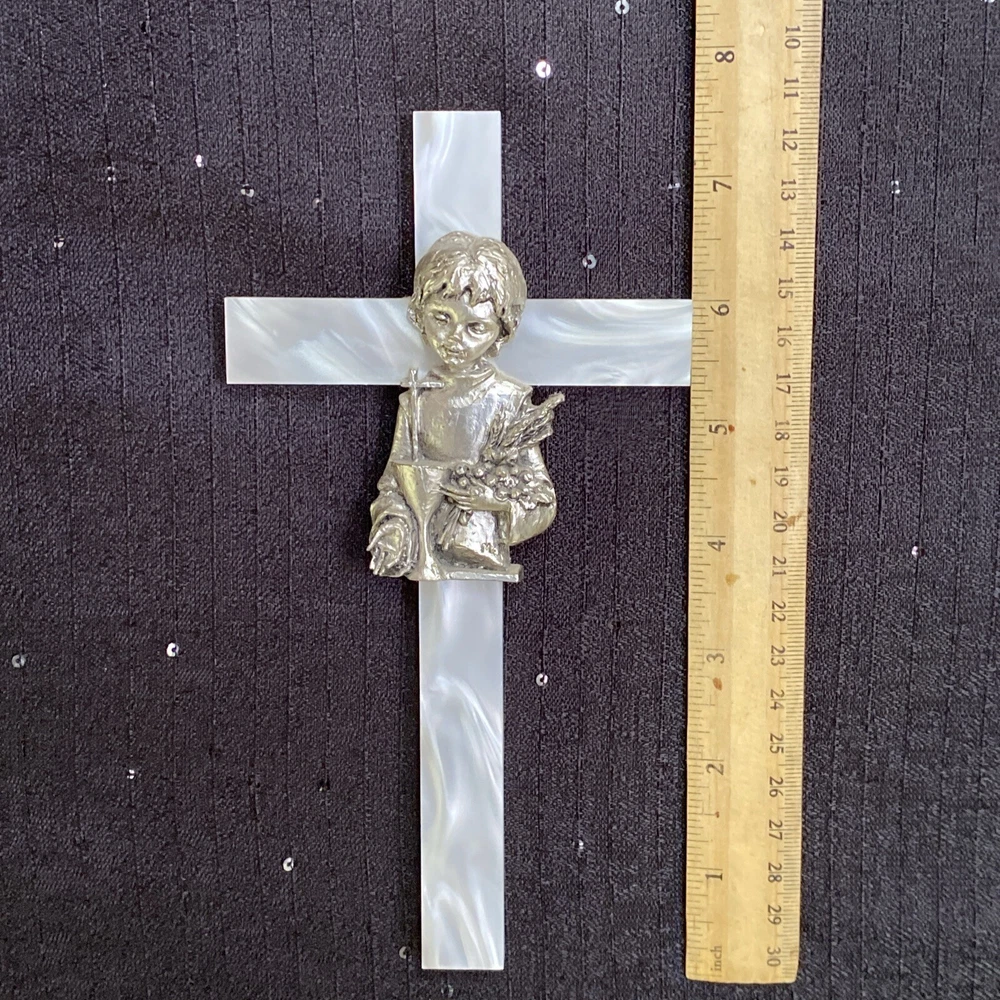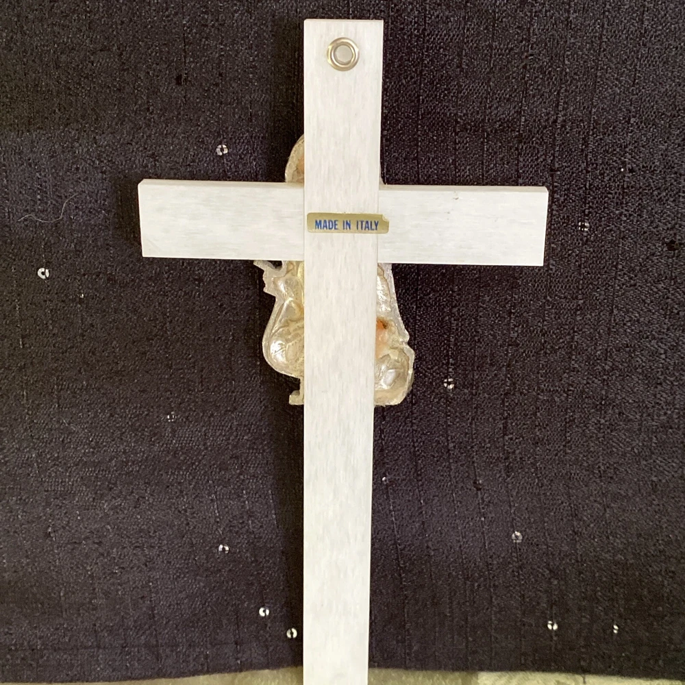 This is a beautiful piece! The cross appears to be made of wood with a mother of pearl finish, and the ornament appears to be silver. Made in Italy. This item is secondhand and sold as is. It is in wonderful condition. No blemishes or scratches. Feel free to make offer! xm-051