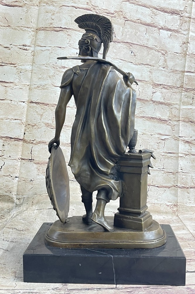 Roman Warrior Soldier Spear Shield Military Art Collector Bronze Marble Gift NR Roman Warrior Soldier Spear Shield Military Art Collector Bronze Marble Gift NR Condition : This sculpture is in perfect condition. Bronze Dimensions with Marble Base: Height 16" X Width 9.5" Marble Dimensions:9.5" X 6" Height without base:15" Weight:18 LBS Inventory:24STE64510542 Witness the powerful presence of the Roman legion soldier in this remarkable bronze sculpture. Captured in a moment of reflection on a scarred battlefield, the soldier stands with resolute determination and strength. His naked form, adorned only with select regalia, speaks to his unwavering commitment to duty and honor. The soldier wears a galea, a traditional soldier's helmet, atop his head, providing protection and symbolizing his role as a warrior. A baldric, a leather belt used for carrying weapons, rests across his chest, highlighting his readiness for battle. His paludamentum, a cloak draped over one shoulder, cascades down his back and between his legs, adding a touch of drama to the composition. This magnificent bronze sculpture is a testament to the artist's skill and attention to detail. Crafted using the ancient lost-wax casting method, each intricate feature of the soldier's form is meticulously rendered. The sculpture is finished with a rich brown patina, enhancing its timeless appeal. Mounted on a black marble base, it stands as a tribute to the artist Huzel's vision and craftsmanship. Embrace the spirit of ancient Rome with this stunning Roman legion soldier bronze sculpture. Whether displayed as a centerpiece in your home or as part of your art collection, it is sure to command attention and evoke a sense of awe. Immerse yourself in the legacy of the Roman empire and appreciate the enduring significance of this captivating artwork. Greek Spartan Warrior Roman Soldier Signed Original Bronze Sculpture Statue Sale Video will open in a new window Using the eBay App? Paste link into a browser window: [isdntekvideo] Shipping Terms : Most of our items are shipped via USPS (United States Postal Service) mail or UPS. Most orders are shipped within 24-48 hours of purchase. Please be aware that not all items are available for USPS shipping due to size and weight. We do ship to Hawaii, Alaska, Canada, Puerto Rico, APO/AE, and U.S. Virgin Islands, however, an additional charge may be required. Please contact us before making any purchases in these areas. For Non-USA customers, you may be responsible for all duty, tax, brokerage fees that may be due upon delivery (shipping costs cover freight charges only). We also ship internationally. Please refer to the "Shipping and Handling" chart for the rates for each area. Payment : We accept just about any form of payment. PayPal, Master Card, Visa or American Express credit cards. Money orders, cashiers checks, and even personal or business checks. For governmental institutions, we will also accept a purchase order. Please understand that for personal or business checks we have to wait for the check to clear (usually 7 days) before shipping. Condition : New Detailed Hand Crafted Hot Cast Bronze Satisfaction Guaranteed. This is Stock Photo, Slight Color Variation!! Listing and template services provided by inkFrog
