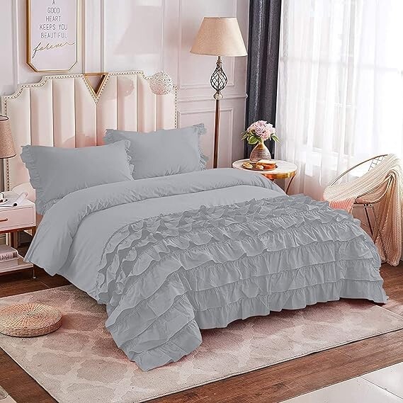 Romantic Bedding Set 100% Cotton, Princess Ruffles Duvet Cover Bedroom bed skirt Create a romantic and luxurious bedroom with this handmade 100% cotton bedding set, featuring a duvet cover with princess ruffles and a floral pattern. The set includes a duvet cover, bed skirt, and is suitable for teens, adults, and kids. The boho style with a luxury theme offers a cozy and elegant feel to any bedroom. Easy to care for with machine washable instructions, this duvet cover set is perfect for adding a touch of whimsy to your bedroom decor. Item - 1 PC Duvet Cover With 2 PC Pillow Covers Material - 100% Soft Cotton Fabric Feature - Ruffle Design Color - light gray Closure - Back Side Zip Closure Wash Care - Dry Clean SIZE CHART : Twin - 68" x 90" inches & Pillow Size is 20" x 30" inches Twin XL - 59" x 102" Inches & Pillow Size is 20" x 26" Inches Full - 80" x 90” Inches & Pillow Size is 20" x26” Inches . Queen - 90" x 90” Inches & Pillow Size is 20" x 30” Inches . King - 90" x104” Inches & Pillow Size is 20" x 36” Inches. Cl.king - 98" x104” Inches & Pillow Size is 20" x 36” Inches. We ship order order by FedEx, & Dhl Express, hence rest assured for prompt delivery of your order. NOTE : International buyers are responsible for their countries duties and taxes.