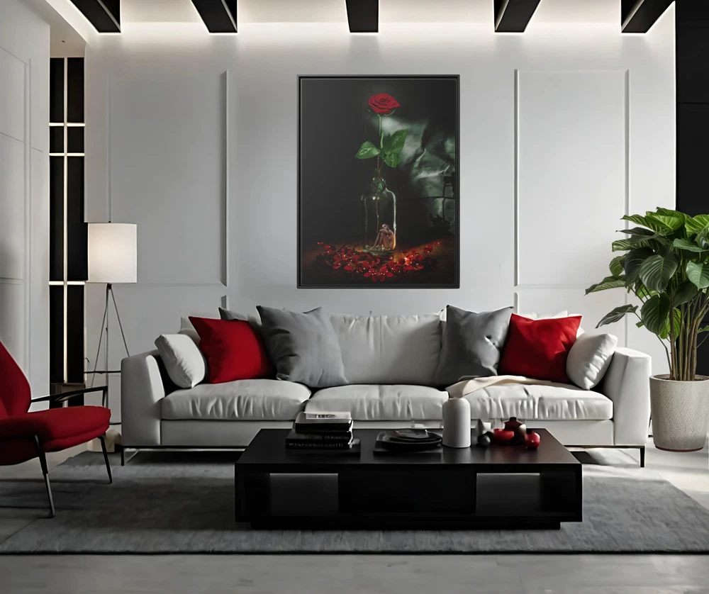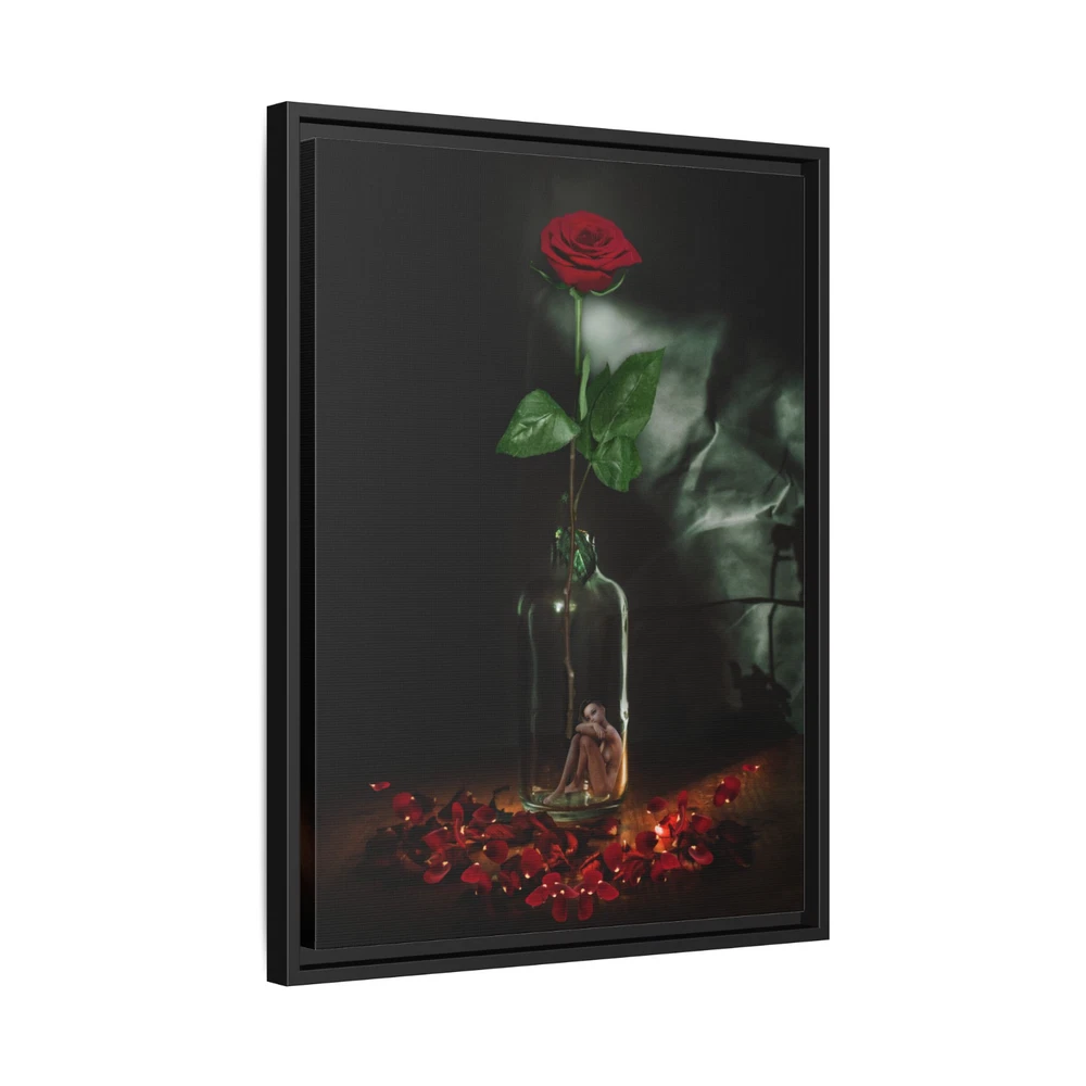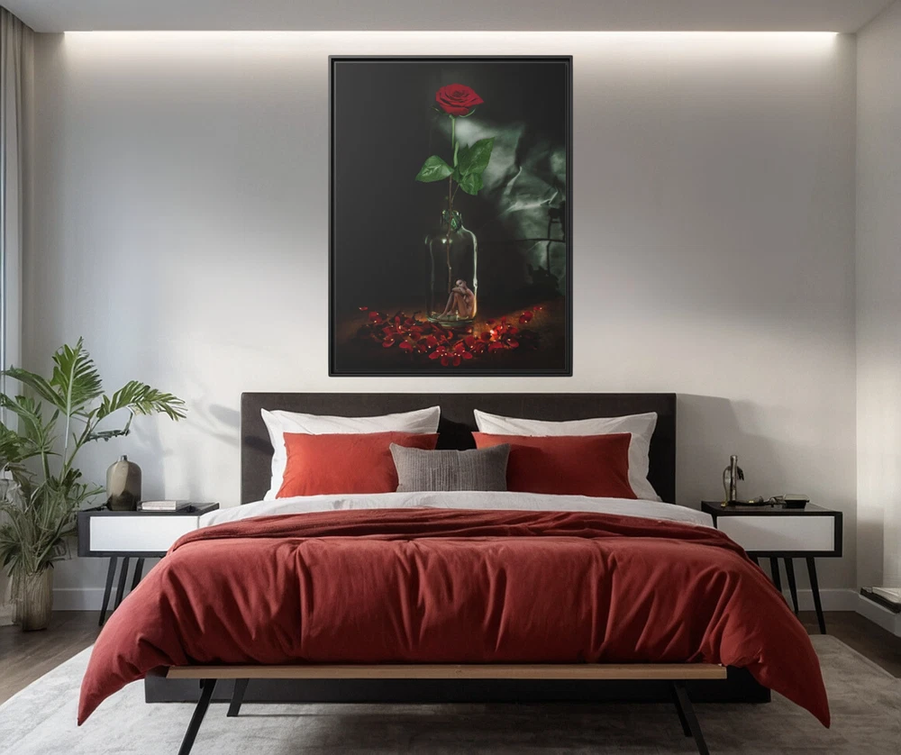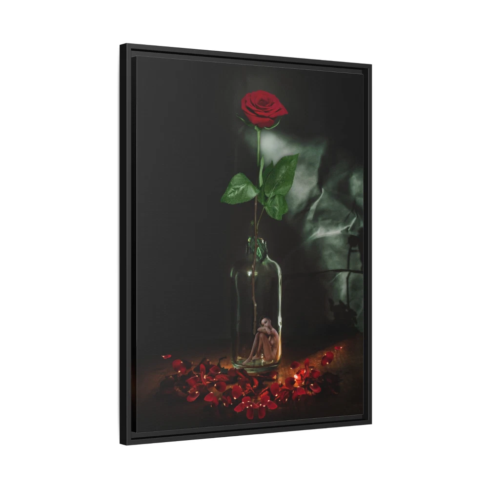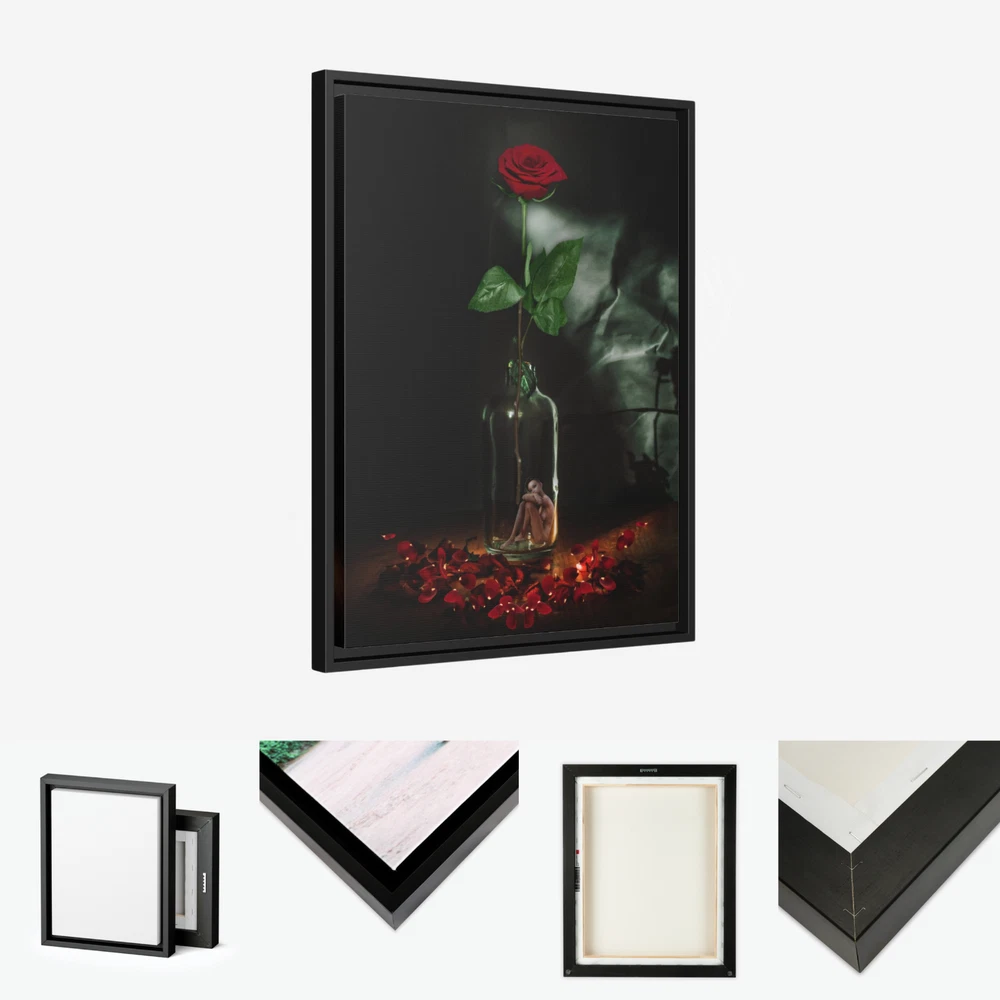 "Girl in a Vase" Abstract Illustrative Art | Framed Gallery Wrapped Canvas Transform your space with the enchanting and thought-provoking " Girl in a Vase " abstract illustrative art piece. This captivating artwork portrays a nude girl elegantly seated inside a delicate rose vase, surrounded by a tall, single-stemmed rose and scattered rose petals. The fusion of human form and floral elements evokes a sense of beauty, vulnerability, and artistic curiosity. Expertly printed on high-resolution, museum-quality canvas, this artwork showcases vibrant colors, intricate details, and a stunning interplay of light and shadow. The black-framed gallery-wrapped canvas adds depth and a modern aesthetic, making it a perfect centerpiece for any room. Key Features: Design: Abstract illustrative depiction of a girl and rose vase, blending elegance with surrealism. Material: High-resolution printing on heavy-duty gallery-quality canvas for exceptional clarity and color fidelity. Framing: Sleek black frame enhances the artwork's sophisticated look while providing a ready-to-hang solution. Durability: Fade-resistant inks and sturdy construction ensure long-lasting beauty. Versatile Size Options: Available in various sizes to suit your decor needs. Ideal for living rooms, bedrooms, or creative spaces, " Girl in a Vase " is more than just wall art—it’s a conversation starter and a piece of art that invites interpretation. Perfect for art lovers seeking a bold yet graceful addition to their collection. Product Description: Crafted with state-of-the-art technology, this gallery-wrapped canvas print elevates traditional art, embodying exceptional quality and craftsmanship. Each reproduction is elegantly framed in sleek black pinewood, designed to effortlessly enhance any interior decor. Printed on premium cotton-polyester canvas with a specialized coating, these prints maintain their vibrant colors for decades. Utilizing UL-certified Greengard Gold inks, they ensure superior image fidelity while adhering to sustainable practices certified by the Forest Stewardship Council. Available exclusively in three sizes—18x24, 24x32, and 30x40—each print includes sawtooth hanging hardware and wall bumpers. Stretched on a custom radial pine profile crafted from FSC-certified renewable forests, these prints ensure both environmental responsibility and lasting quality. Offered only here, these art prints provide a perfect blend of tradition and modern craftsmanship. Prices include production costs, shipping and handling, and artist license fees.