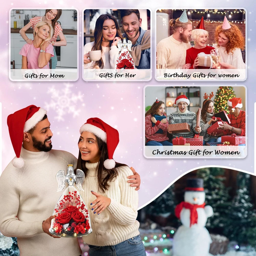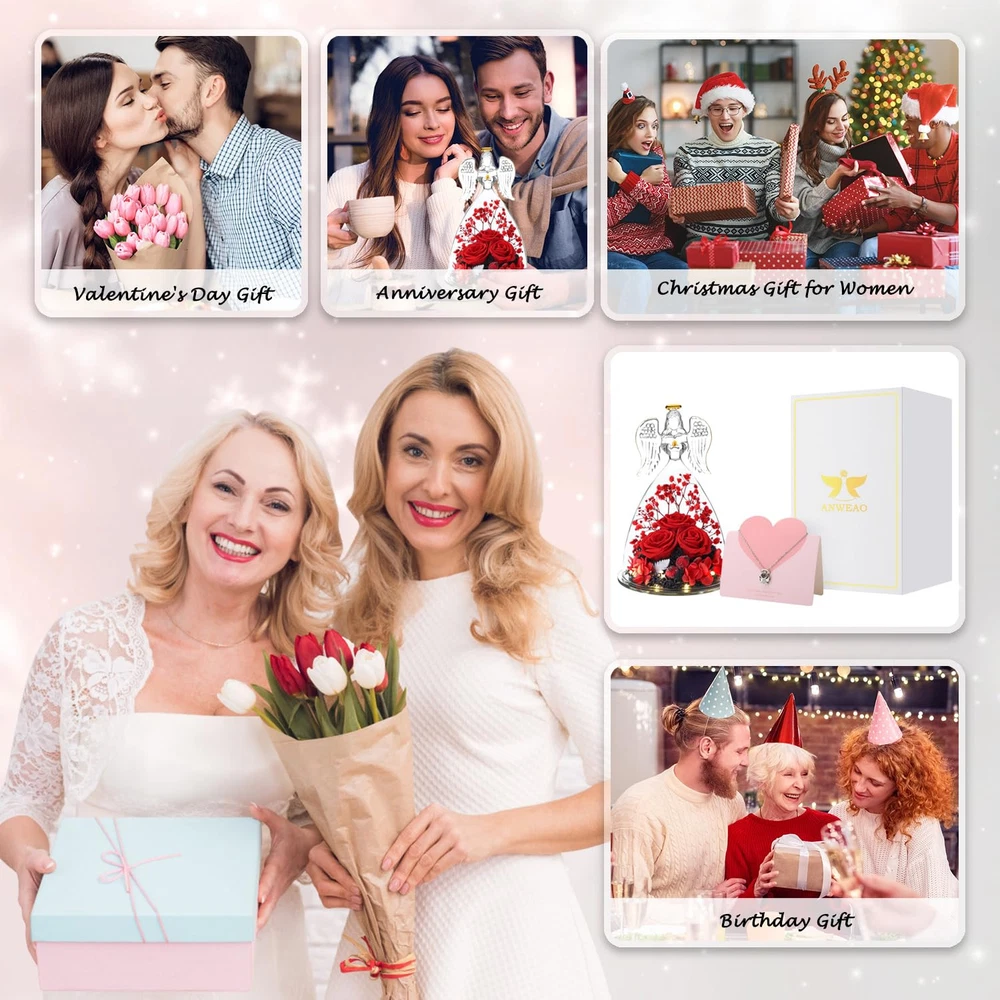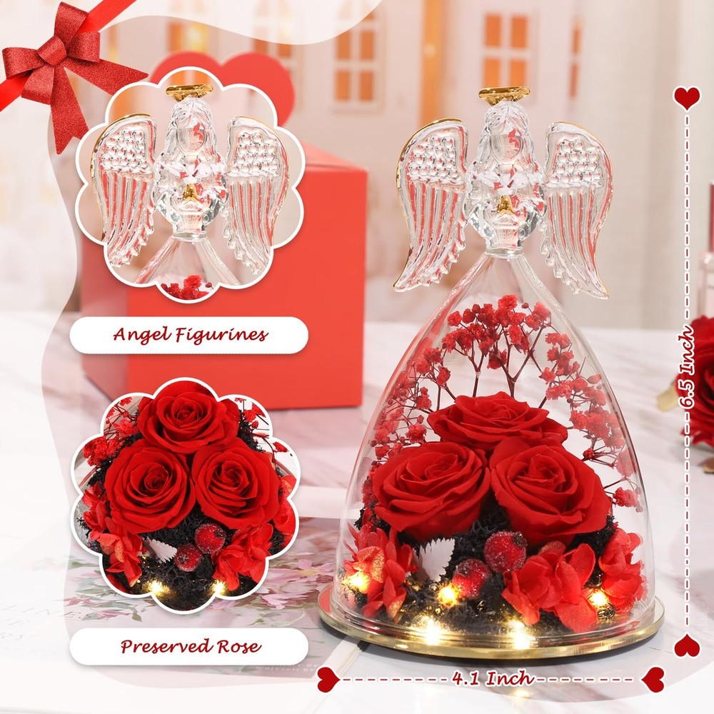 Valentines Day Flowers Glass Angels Figurines with Preserved Rose - Angel statue made of clear glass with golden outline drawing wings, halo and folded palms. Preserved Rose flower is made of natural rose with unique preservation process, most keep the same color, shape and feeling of fresh cut flower, which can last 3-5 year. Angel Gifts for Women, Unique Preserved Rose Flower Valentines Day Gifts For Mom, - The upgraded angel rose has an LED light embedded in the center of the rose, full of a romantic atmosphere. Our angel figure preserved flowers are handmade, with a variety of flowers, combined with the unique appearance of angels, delicate and surprise.It is the perfect decoration for candlelight dinners, weddings, parties, living rooms, bedrooms, offices, coffee shops. Gifts for women,mom,wife,her or friends. Making the person feel special and meaningful at birthday Christmas Thanksgiving Valentines day Mother’s day or any other important days. Valentines Day Gifts Ideas for Women, Large Angel Figurines,Exquisite packaging - The diameter of the angel is 4.10 inches and the height is 6.40 inches. The packaging contained a glass angel figurine, a angel i Love You Necklace, a beautiful gift box, and a great greeting card.guardian angel figurines with three Preserved roses come with everything needed to present it as a gift, you don't have to buy wrapping paper or a card.Preserved Real Rose great fit inside the glass angel, a beautiful way to make a person feel special and meaningful. Perfect Christmas Gifts for Women/Mom/Wife/Her/Best Friend. Valentines Day Gifts for Her - I Love You Angel Pendant Necklace - The projection necklace uses the latest nano-projection technology to express "I love you" in 100 different languages, illuminating the angel pendant with light, mapping out 100 languages of I love you.This Angel necklace is exquisite and elegant, fit for any occasions, and will make you more eye-catching and charming in the crowd. Absolutely a great gift to express your love for your mother, girlfriend, fiancee, wife, valentine, family or friends, etc. Great gifts on Mother 's Day, Wedding, Anniversary, Valentine’s Day, Christmas,birthday. Flowers Fresh Bouquet Angels Gifts For Women,Lasting Keepsake And Memory: Romantic Roses flower for Her,gifts for Mom,Grandma, Wife,Girlfriend,Christmas gift for moms from daughter son.Angel birthday gift for Mom gifts.The preserved flower rose angel is about 6.4 H x 4 W Inch,a wonderful and touching mom gifts, sympathy gift.Unique glass rose flower Angel gifts for her valentine's day, birthday gifts for women, wife, girl, girlfriend,mother, grandma,father, daughter, family, teacher, colleague, etc.Adding to memorable memories collection! Unique Birthday Gift Ideas for Women,Birthday Gifts for mom - Beautifully Packaged. Arrives completely assembled in a high quality, reusable gift box, with a Delicate heart greeting card. You do not have to worry about a thing! We make gift giving fun and easy! Elegantly designed and filled with thoughtful gifts! Make Her Feel Pampered on Mothers day, her birthday, or anniversary with this three roses guardian angel figurines luxury gift box for women! Angel Gifts for Women,Mom birthday Gifts,Birthday Gifts for her,Angel figurines for Women, birthday Gifts for Mom, gifts for grandma,gifts for her,gifts for wife,gifts for girlfriend
