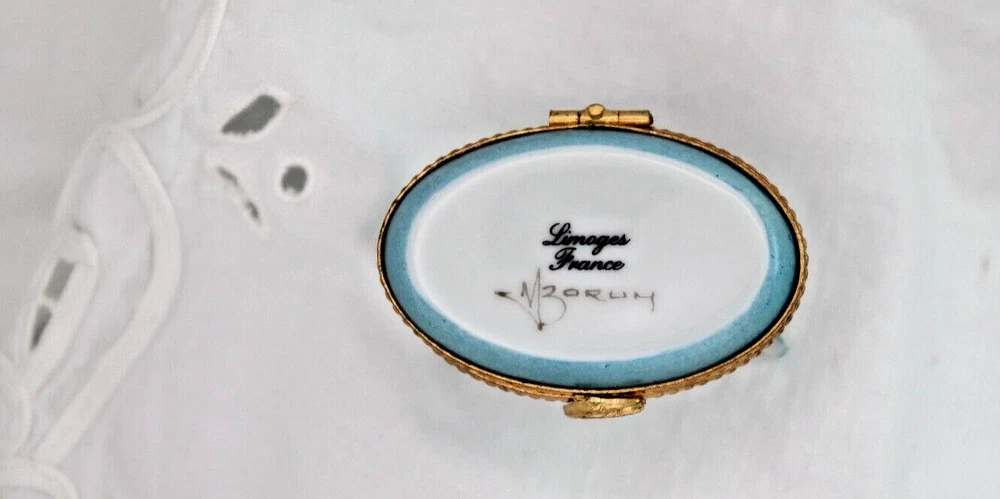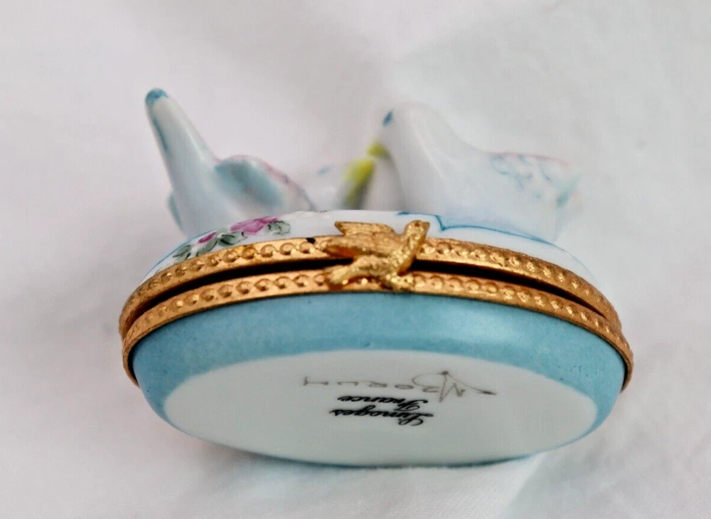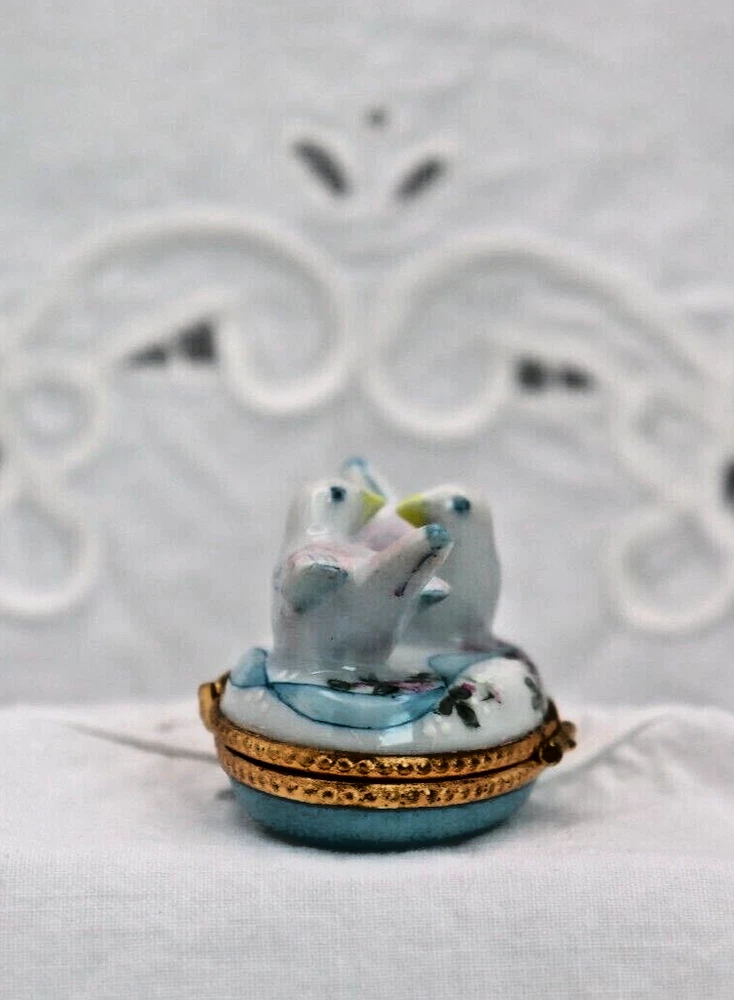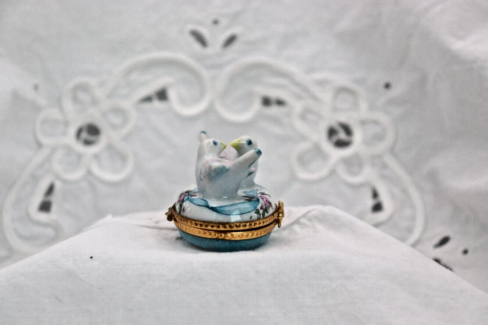 The product is a small oval-shaped Limoges trinket box featuring a design of two doves kissing, making it a fitting choice for Valentine's Day or as a symbol of love. The box is crafted from multicolored porcelain with a glossy finish, showcasing a French style. The piece is signed, adding a touch of authenticity and uniqueness to the decorative collectible. Approximate measurements: 1 1/2 H x 2 1/4 W x 1 1/2" D The box is perfect but does latch a tiny bit loosely. LBL does consider price discounts and combined shipping for multiple items. Message for inquiry. LBL no longer provides free shipping on trinket boxes as of 5/13/25. LBL does consider price discounts and combined shipping for multiple items. Inquire by messaging us!