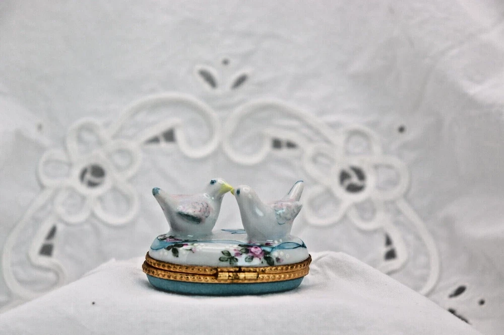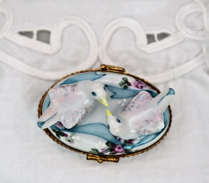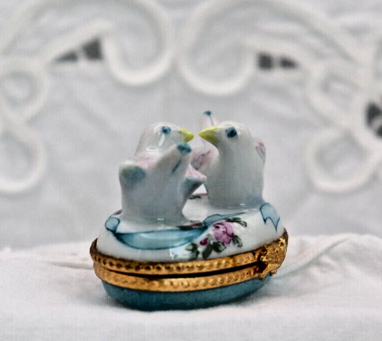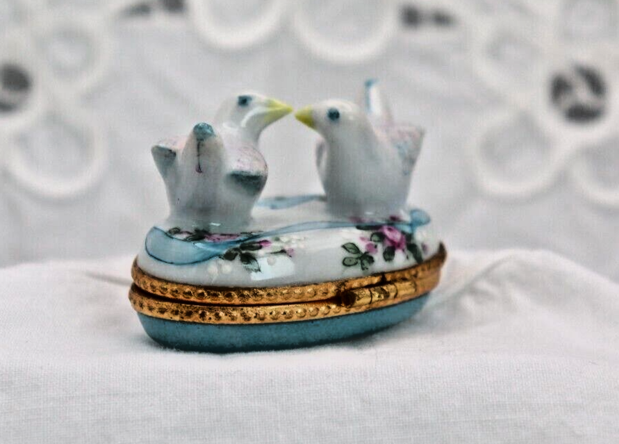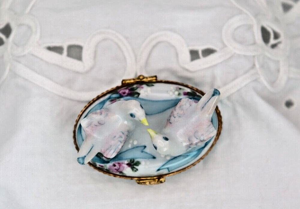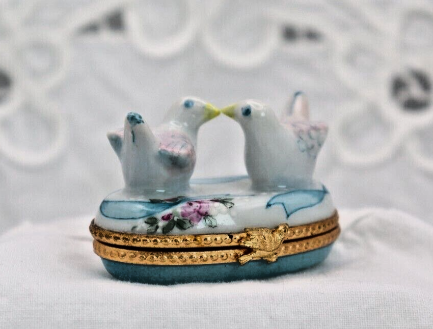 Romantic Signed Limoges Trinket Box Featuring Two Doves Kissing for Valentines Love Gift