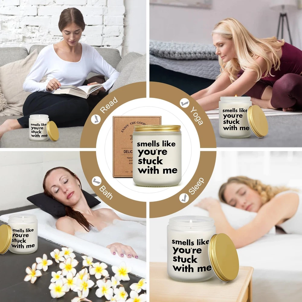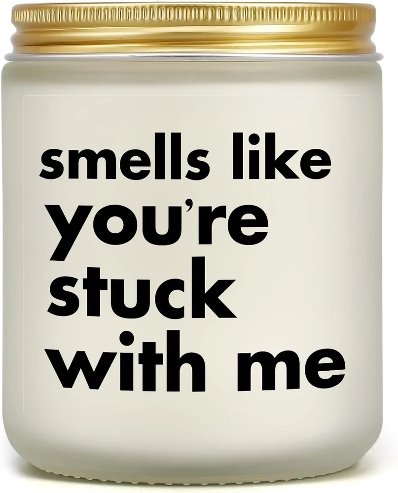 Romantic Valentines Day Gift: Best funny gift for loved woman man on coming valentine's day! With a funny label "smells like you're stucking with me" the candle can be a humorous gift for girlfriend, boyfriend, wife, husband, future wife, future husband, newly engaged lovers couples, fiance, fiancee, missing you gift for girlfriend boyfriend long distance, gag gift for pregnant wife or new mom new dad... CINGUE candle is a good surprise for loved one and saying I love you in a funny way. Unique Romantic Gifts for any Occassion: A scented candle with such funny message can be a meaningful and gag gift as valentine's day gift, birthday gift for boyfriend/girlfriend, christmas gift, Xmas gift, easter gift wedding day gift for husband/wife, engagement gift for fiance/fiancee, funny months anniversary gift, 1st 2nd 3rd ...wedding anniversary gift, dating anniversary gifts. The receiver would burst heartfelt laghter for the hilarious message and form closer relationship with you. Natural Soy Wax & 50 Hours Burn Time: This candle chooses environmentally friendly soy-based wax to provide a clean, natural, safe and smokeless burning experience. A lead-free centered cotton wick promises evenly burning and prolongs the burning time up to 50 hours. High-quality ingredients enable a sweet relaxing fragrance to spread around the room, creating a warm and calming ambiance for reading books, practicing yoga, aromatherapy, bath and sleeping. Refreshing & Relaxing Lavender Scent: Natural nervous relieving prosperity, pairing calming lavender with comforting eucalyptus essential oil, this candle disperses a warm peaceful scent, creating a cozy and calming atmosphere for a space and soothing the nerve, releasing homesick, recalling sweet memory, relaxing mind and body and helping fall asleep faster. Bringing the scented candle also brings a healing and calming nervous release for loved ones. Giftable Package & Dimensions: 1 package contains 1 scented candle weighing 14oz(7oz wax) which enables plenty of time to enjoy its relaxing effects. The candle is 2.8*2.8*3.7 inches making it a nice addition for home in daily life. CINGUE candle will be carefully packaged with pearl cotton to avoid breaking in transportation. Giftable packaging offers a sense of ritual when the receiver opens it which makes the candle a cool and awesome gift that expresses heartfelt loves. Product Description A funny and practical gift Hope to win his or hers heartfelt laugh Get closer with loved one