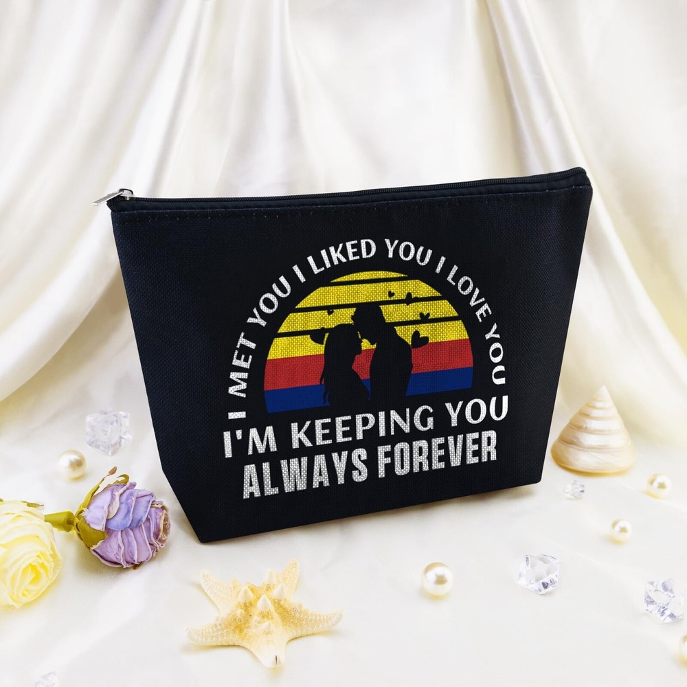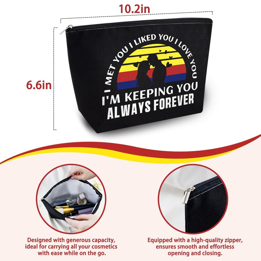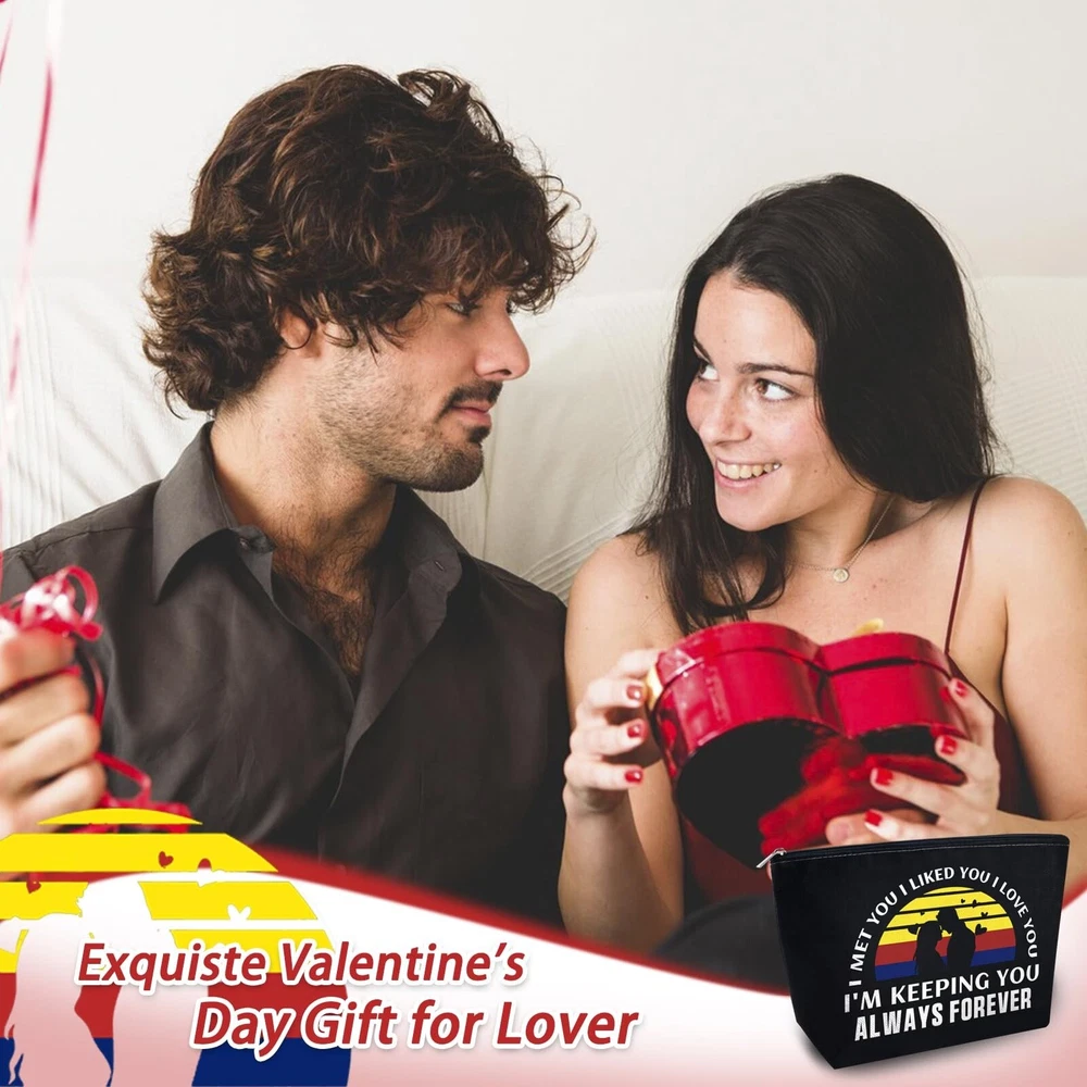 Romantic Valentines Day Gifts for Her Valentines Makeup Gift Valentines Day Gifts for Her Valentine Makeup Bag Couples Lovers for Wife Girlfriend Birthday Gifts for Gf Travel Zipper Pouch Product Details Color: black-forever Brand: Yoxiumi MPN: Does not apply UPC: Does not apply EAN: Does not apply Product Dimensions: 2 x 0.5 x 0.5 inches Item Weight: 0.018 ounces Department: Women Country of Origin: China 1.Valentines Day Gifts for Her: Surprise your special someone with this chic and romantic "I met you, I liked you, I love you, I'm keeping you, Always Forever makeup bag, the perfect sentimental Valentines Day gifts for girlfriend 2.Valentines Gifts for Gf: Ideal for girlfriends, wives, moms, sisters, and daughters, this cute and funny makeup pouch is a delightful choice for birthdays, Mother's Day, Christmas gift bags, or as a graduation present 3.I Love You Gifts for Her: This girlfriend/wife makeup bags is double-sided printed, made from natural linen, soft, hardy & durable, collapsible, easy to compress and store, the cosmetic bag is very high quality and waterproof. The sliver zipper is high quality with an anti-slip function flimsy 4.Valentine Bags Female: Measuring 10.2 x 6.6 inches, It's great as a travel toiletry bag, for organizing cosmetics, or as a handy clutch for small essentials. Wonderful girlfriend/wife gift ideas 5.Valentines Gift Bags: These romantic gifts for girlfriend, wife are the anniversary couple gift, long distance relationship gift. It also makes heartfelt gifts for her, him, a gift for husband and wife, a date night gift idea Inspired by the timeless phrase "I met you, I liked you, I love you, I'm keeping you, Always Forever," this bag captures the essence of your love story. The adorable penguin couple design adds a charming and whimsical touch to her beauty routine, making it a joy to use every day.Crafted from high- quality, durable fabric, this bag is built to last. The sturdy zipper ensures easy and secure access to her makeup, skincare products, and toiletries, while the spacious interior offers plenty of room for all her essentials. Multiple compartments keep everything organized and easy to find.Whether she's traveling for business or pleasure, heading to the gym, or just needs a stylish way to carry her daily essentials, this penguin makeup bag is perfect for any occasion. It's not just a bag; it's a symbol of your love and commitment to her.Surprise her with this heartfelt and romantic gift. Our Makeup Cosmetic Bag is a keepsake she'll cherish forever. Order now and make her feel special on Valentine's Day, an anniversary, birthday, or any special occasion. Show her how much you love her with this charming and practical gift!