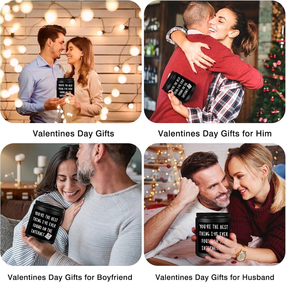 Valentine's Day Gifts for Him: Premium quality black cedar juniper sandalwood scented candles make great gifts for men. This funny scented candle features a witty and meaningful phrase to make him smile: "You're the best thing I've ever found on the internet!" Gifts for men, gifts for him, best friends, boyfriends, husband, fiancé, couples, teacher, coworker, boss, neighbor, classmate, brother, dad, or anyone else. Warm and humorous candles have a unique way of making him laugh. Relaxing Gift for Men: A premium black cedar juniper sandalwood scented candle is great for sleep promotion and relief from anxiety, depression, and stress. A good addition to the bathroom, bedroom, kitchen, living room, office, etc. Funny gifts for men in your life to create a stress-free, relaxed, and comfortable environment. Funny Valentine's Day Gifts for All Occasions: This candle is a great gift for most occasions, including birthdays, Valentine's Day, new jobs, housewarming, graduations, weddings, Christmas, Thanksgiving, anniversaries, funny stocking stuffers, secret Santa exchanges, quarantine gifts, and holidays. Warm and humorous candle gifts have a unique way of making him laugh, and they will love them very much. All-Natural Scented Candle: This funny scented candle is made of all-natural wax, a cotton wick, and natural essential oils, which burn for a long time, sufficiently, and cleanly, with no black smoke. Helps you fully relax your body and enjoy downtime, work, reading, meditation, bathing, yoga, or date nights. Valentine's Day Birthday Gifts for Men: This candle is a funny birthday, anniversary, or Christmas gift for best friends, boyfriend, husband, fiancé, coworker, employee, boss, buddy, partner, men, your guy, couple, lover, forever friends, separated friends, new friends, old friends, or anyone else to show them how much you care and tell them how much you love them.