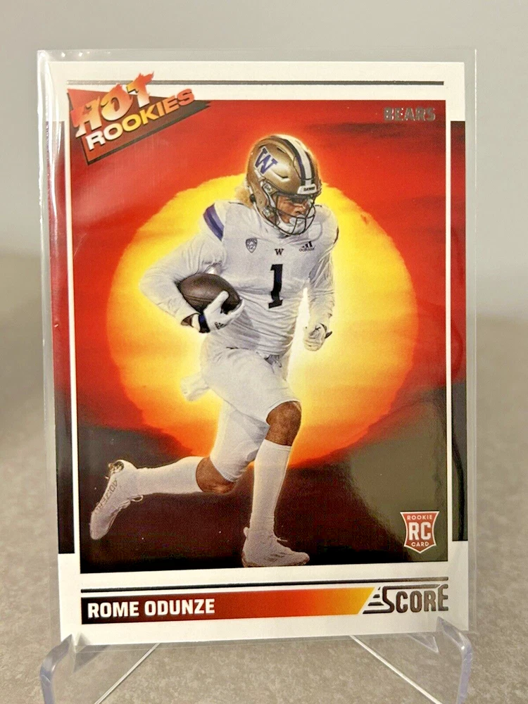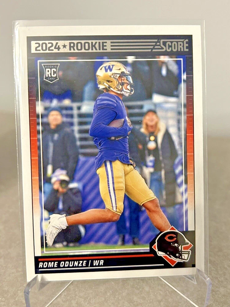 This Panini Score (3) Rookie Cards Hot Rookies & Emerged Inserts features Rome Odunze, a rising star in the National Football League (NFL) playing for the Chicago Bears. The cards are a must-have for any football fan or sports trading card collector, showcasing Odunze's talent and potential. The cards are manufactured in the United States and are in English language. They include features such as Rookie and Insert, making them a unique addition to any collection. With a standard card size, these sports trading cards are perfect for display or storage. Get your hands on this exclusive set of cards and add them to your collection today!