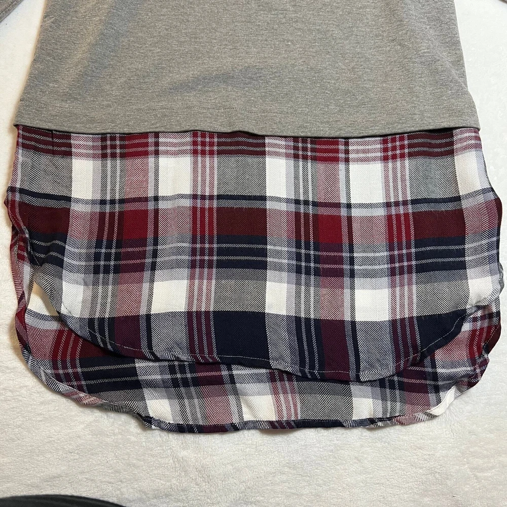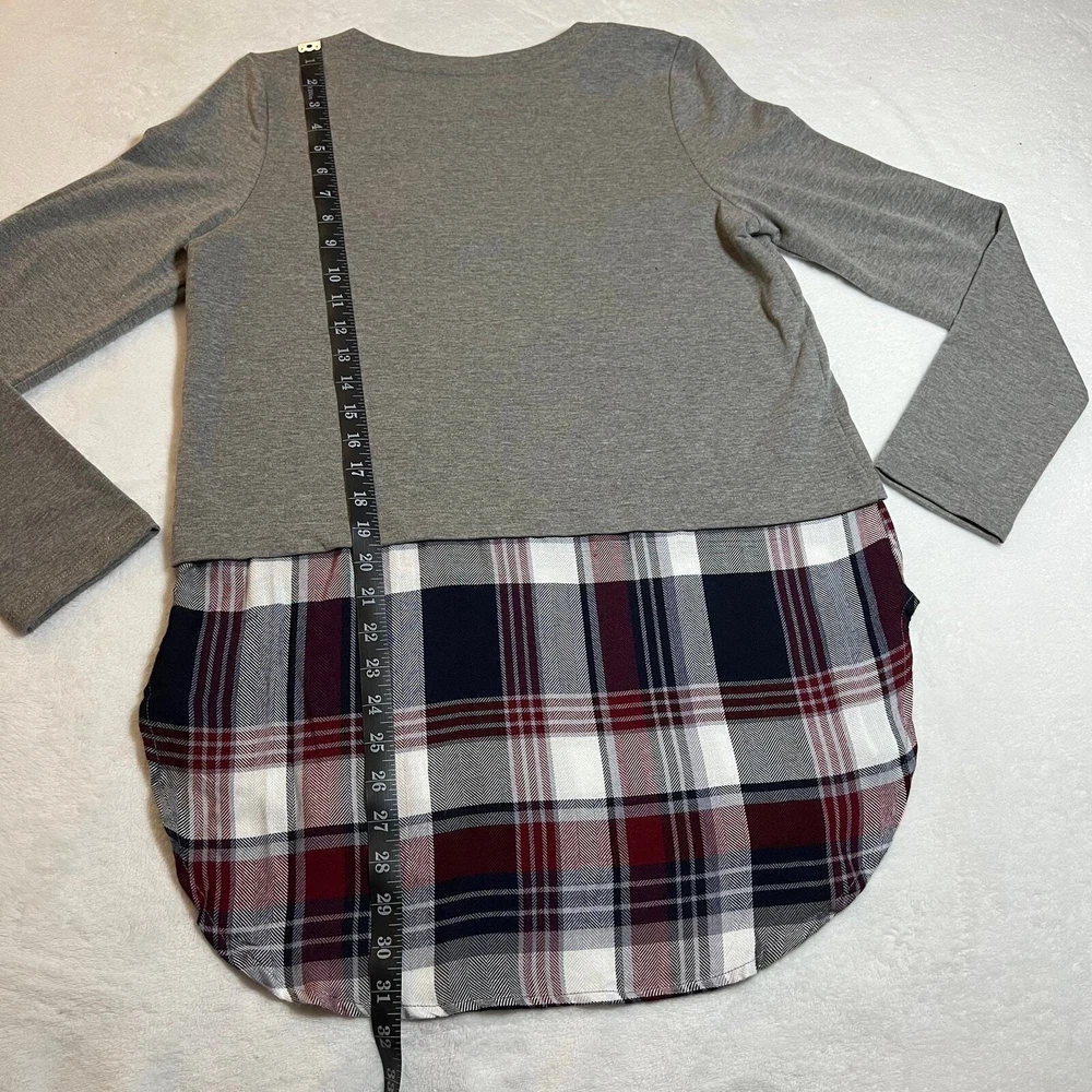 Romeo & Juliet Couture Crewneck Plaid Flannel Tunic Top Size Small 90s Preppy CONDITION: Pre-Owned. Excellent Used Condition. FLAWS/ALTERATIONS: No flaws. COLOR: Grey/White/Red/Blue SIZE: Women’s Size Small DETAILS: Crewneck Long sleeve Pull over Mixed media Sweatshirt bodice/Plaid lightweight flannel attached Faux layered look (fabric is sewn together to make 1 piece) Tunic length Slight high low hem MEASUREMENTS: Chest: 19.5" Front Length: 29" Back Length: 31.5" **All measurements are approximate and are taken flat** MATERIAL: **NO MATERIAL TAG** Bundle 2 OR MORE items to save more! Reasonable offers are welcomed! TAGS: Casual Comfy Fall Winter Maximalist Preppy Academia Boho Bohemian 90s Y2K 2000s Punk Grunge
