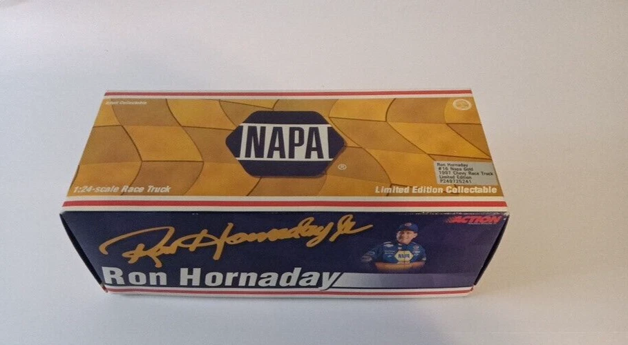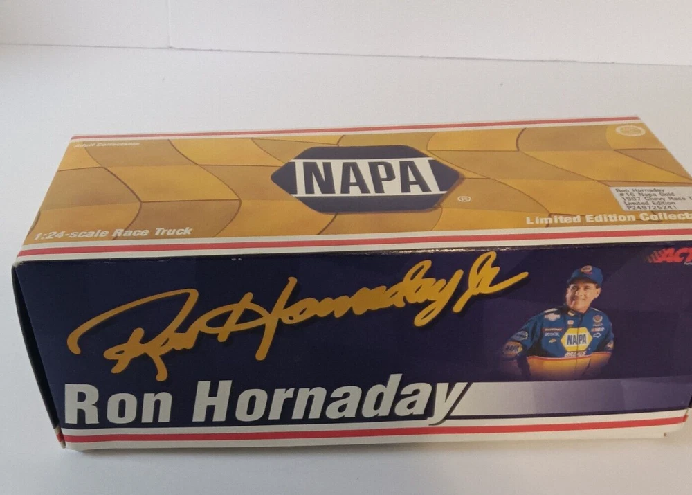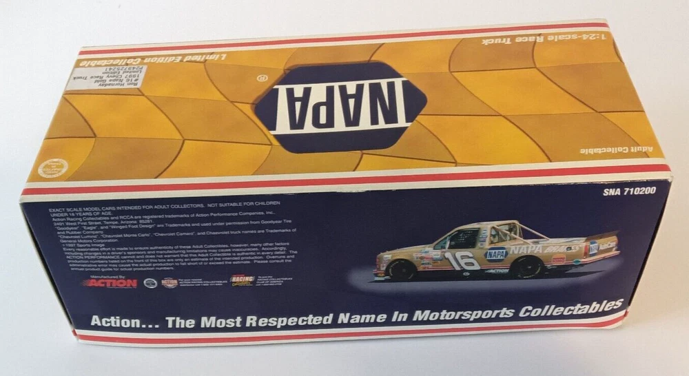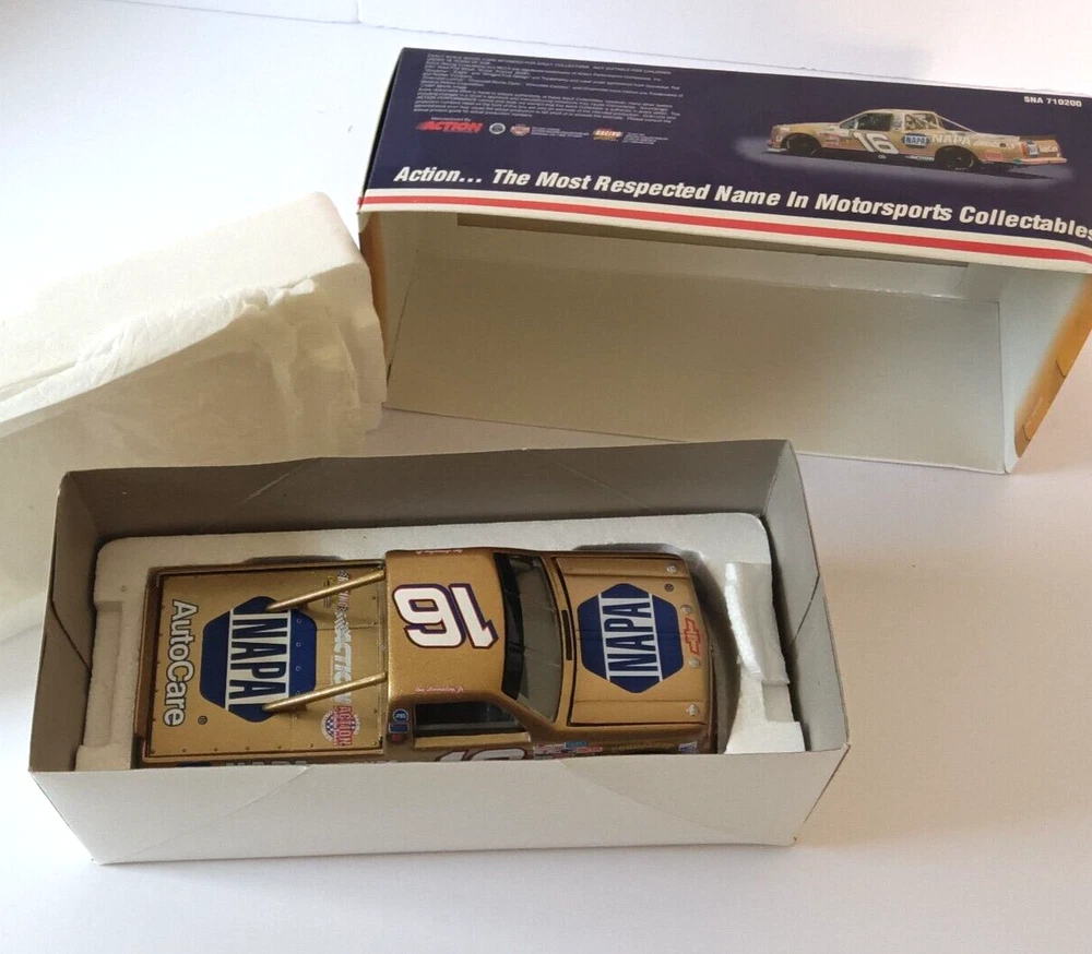 Series:NASCARScale:1:24Seller Notes:“used open box as shown”Material:DiecastColor:Goldgtin13:Does not applyRace series:NASCAR Truck SeriesBrand:ActionRacing Team:Dale Earnhardt, Inc.UPC:Does not applyOrganization:NASCARMPN:Does Not ApplyModel:# 16 NAPAVehicle Year:1997Vehicle Type:NASCAR RacecarVehicle Make:ChevroletDriver:Ron HornadayCountry/Region of Manufacture:China