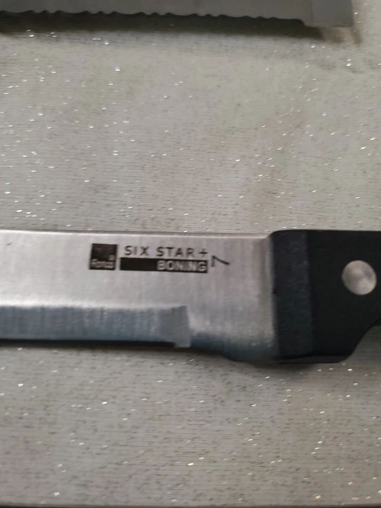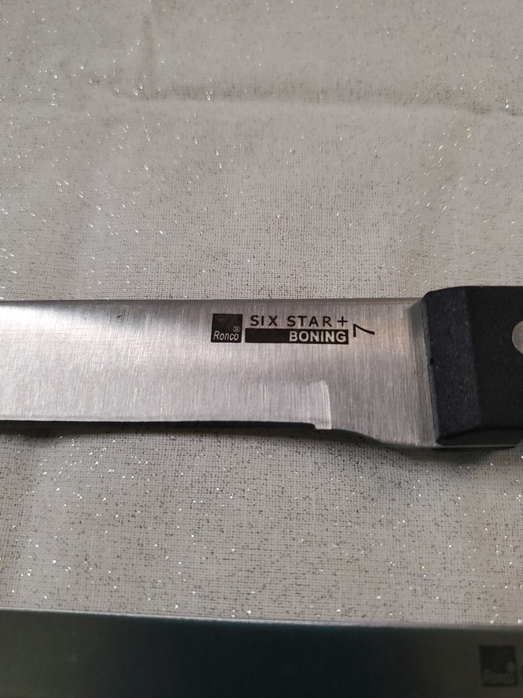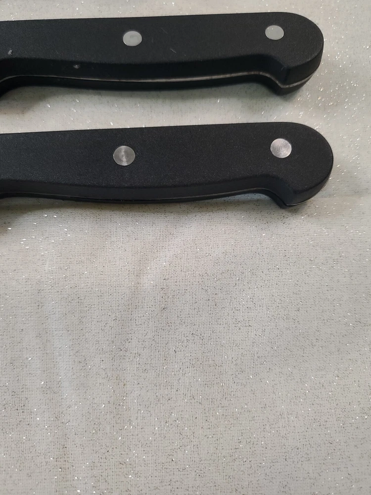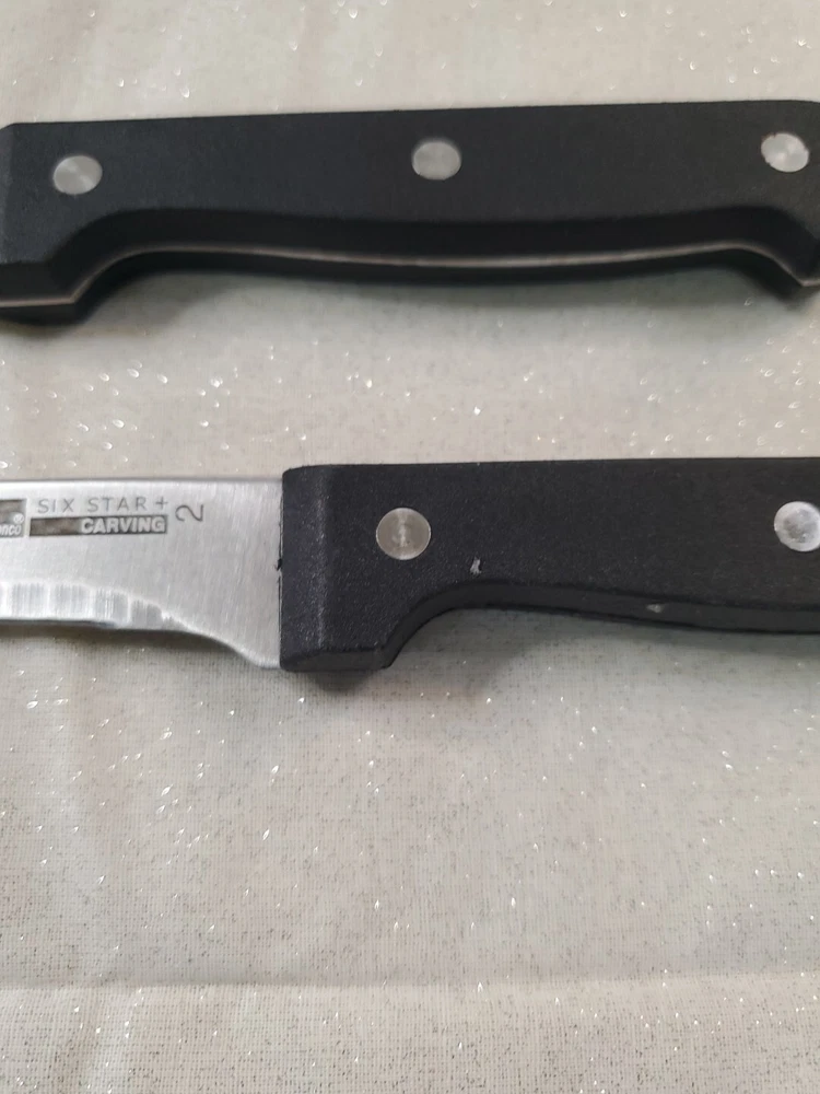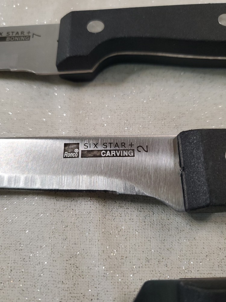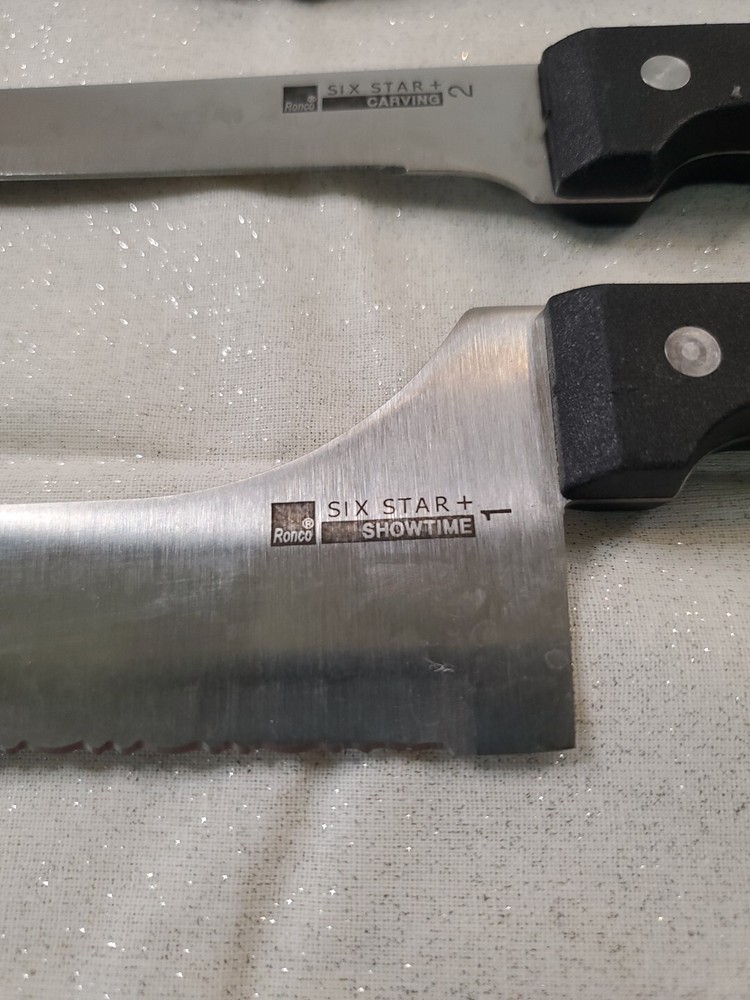 THANK YOU FOR VISITING OUR STORE. WE SHIP 6 DAYS A WEEK (UNLESS THERE IS A FEDERAL HOLIDAY). MOST ITEMS WILL SHIP IN A STURDY BOX AS NEEDED. PLEASE FEEL FREE TO REACH OUT IF YOU HAVE ANY QUESTIONS. WE WILL COMBINE SHIPPING WHEN AVAILABLE. Introducing the Ronco Showtime 3-Pc Six Star Knives set, perfect for any kitchen enthusiast. This set includes a carving knife, a boning knife, and a showtime knife, all made of durable stainless steel and featuring a comfortable plastic handle. The black color of the knives adds a sleek touch to any kitchen decor. Whether you're a professional chef or a home cook, this set is sure to meet all your knife needs. The Ronco brand is known for its quality products, and this set is no exception. Upgrade your kitchen with this must-have set of chef's knives.