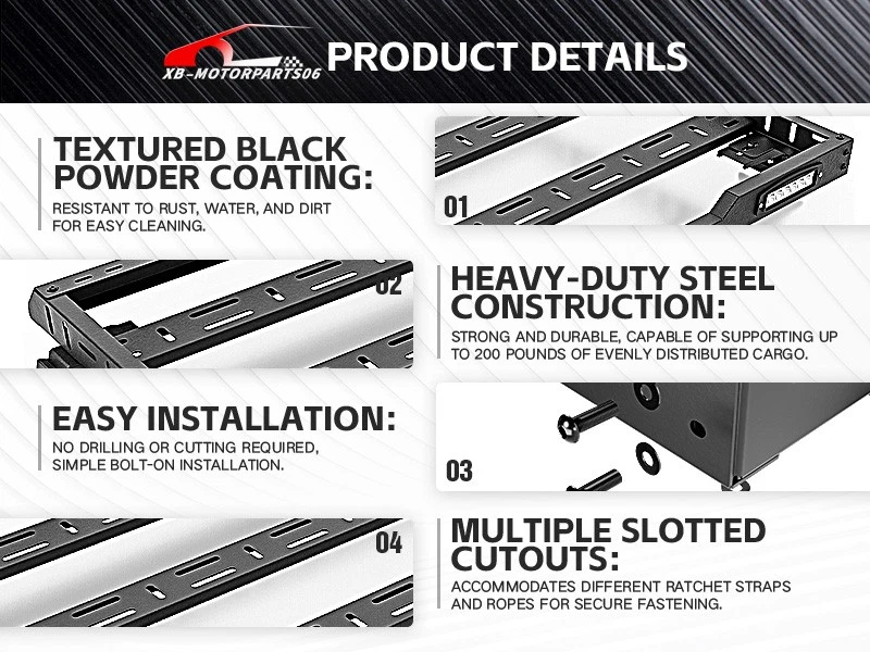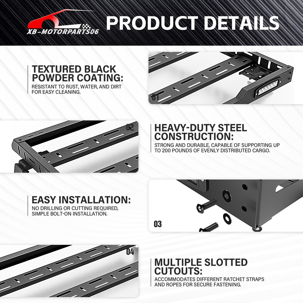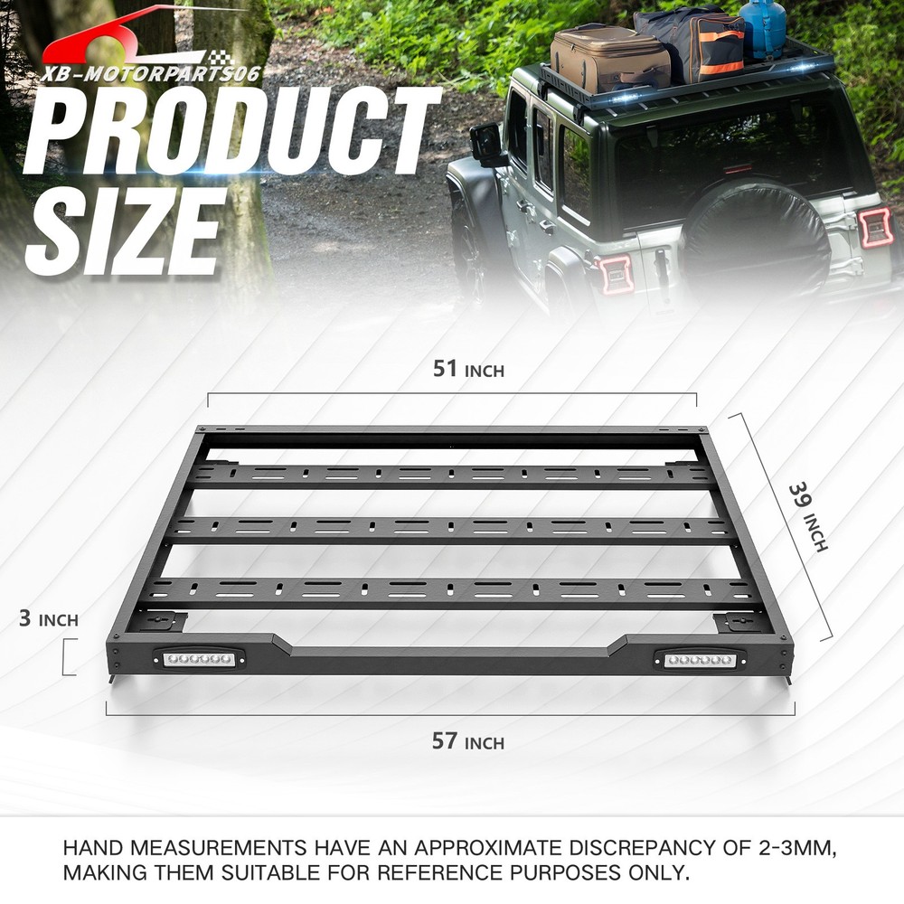 Roof Rack Cargo Basket For 2007-2026 Jeep Wrangler JK JL & 2020-2026 JT Hardtop For safety reasons, we strongly recommend that you seek professional installation services; Regularly check the rack's hardware for any loosening and ensure that the cargo is securely fastened before driving. Suitable Models : Compatible with 2007-2026 Jeep Wrangler JK JL Unlimited & Gladiator JT 2/4 Door Hardtop Package Includes : One set of Roof Rack Cargo Basket, 2 × LED Lights, installation screws, bolts. Product Information : Package Dimensions: 54.33'' x 9.84'' x 4.72'' Installation mode : Bolt-On Load Capacity : 2 0 0 LBS Mounting Type : Easy Snap Placement on Vehicle : Upper Item Weight : 52.14 Pounds Material : Carbon Steel Color : Black (hand measurements may have an error of 2-3 mm/0.078-0.118 in) Feature : ① Provides additional cargo space for your vehicle with a load capacity of 200 pounds, catering to various carrying needs such as camping gear, off-road equipment, bicycles, travel cargo, and more; ② Features an aerodynamic and streamlined front-end design, effectively reducing wind resistance and noise. The overall design is sleek and minimalistic, enhancing the overall appearance of your vehicle with an off-road look; ③ The overall surface is coated with black powder for durability, while the interior utilizes advanced electroplating technology for waterproofing and rust resistance. The metal parts are made of heavy-duty steel, ensuring sturdiness and durability; ④ Roof Rack Cargo Basket can be easily installed using simple bolt-on mounting. No drilling or modifications are required. Simply assemble the components and connect the mounting brackets to the cargo basket and rain gutters. We recommend ensuring a secure installation before driving and regularly checking for any loosening of the installed parts; Warranty Period : 1 year Standard Shipping (FedEx Ground or FedEx Home Delivery) Will usually ship within 3 business days of receiving cleared payment For safety reasons, we strongly recommend that you seek professional installation services; Regularly check the rack's hardware for any loosening and ensure that the cargo is securely fastened before driving. Suitable Models : Compatible with 2007-2026 Jeep Wrangler JK JL Unlimited & Gladiator JT 2/4 Door Hardtop Package Includes : One set of Roof Rack Cargo Basket, 2 × LED Lights, installation screws, bolts. Product Information : Package Dimensions: 54.33'' x 9.84'' x 4.72'' Installation mode : Bolt-On Load Capacity : 2 0 0 LBS Mounting Type : Easy Snap Placement on Vehicle : Upper Item Weight : 52.14 Pounds Material : Carbon Steel Color : Black (hand measurements may have an error of 2-3 mm/0.078-0.118 in) Feature : ① Provides additional cargo space for your vehicle with a load capacity of 200 pounds, catering to various carrying needs such as camping gear, off-road equipment, bicycles, travel cargo, and more; ② Features an aerodynamic and streamlined front-end design, effectively reducing wind resistance and noise. The overall design is sleek and minimalistic, enhancing the overall appearance of your vehicle with an off-road look; ③ The overall surface is coated with black powder for durability, while the interior utilizes advanced electroplating technology for waterproofing and rust resistance. The metal parts are made of heavy-duty steel, ensuring sturdiness and durability; ④ Roof Rack Cargo Basket can be easily installed using simple bolt-on mounting. No drilling or modifications are required. Simply assemble the components and connect the mounting brackets to the cargo basket and rain gutters. We recommend ensuring a secure installation before driving and regularly checking for any loosening of the installed parts; Warranty Period : 1 year On Dec 10, 2025 at 05:13:51 PST, seller added the following information:
