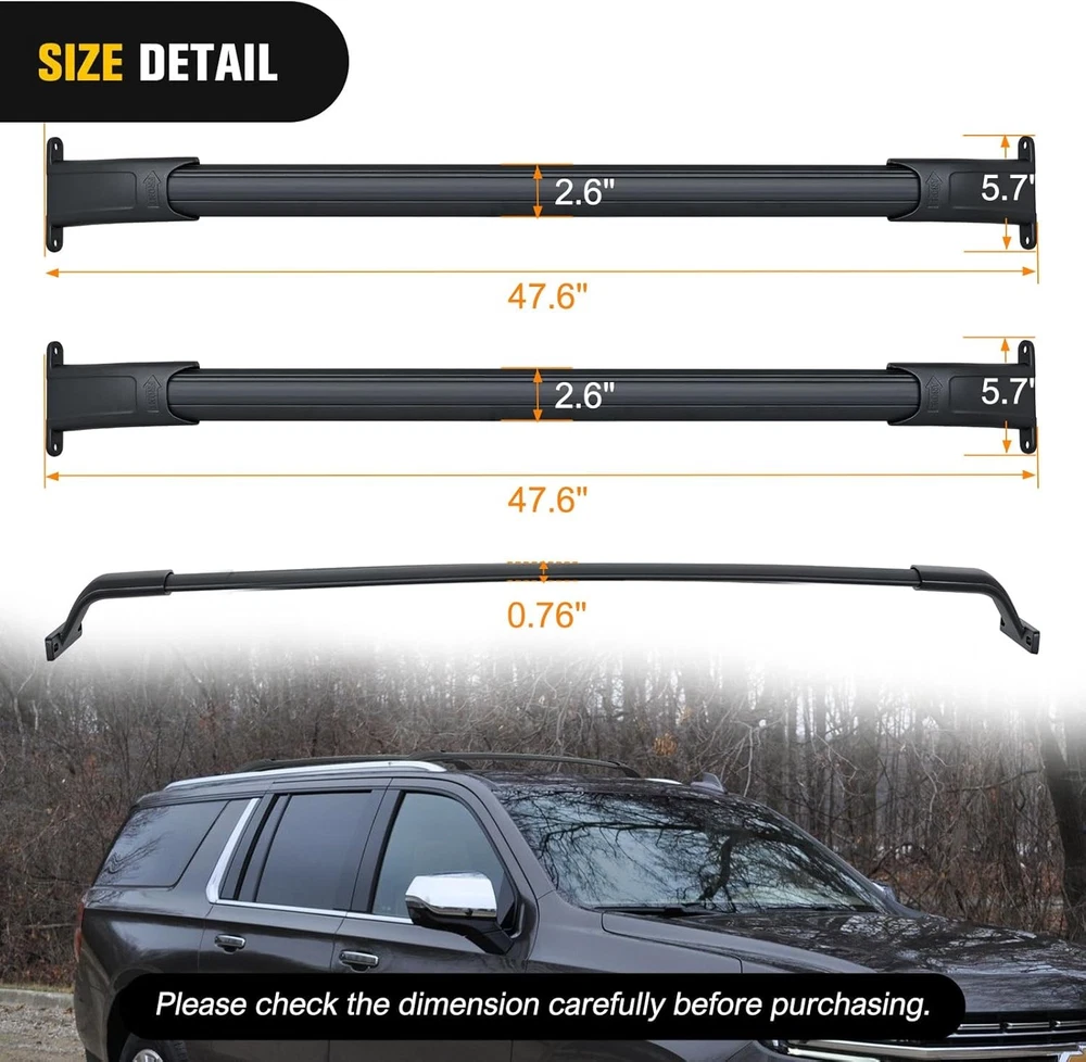 Features: 【Premium Quality】- Made from high-quality aluminum alloy ONLY, our cross bars are durable and can withstand a load capacity of up to 220lbs (99kg) when evenly distributed. 【Easy Installation】 - Assembly and disassembly is a breeze, requiring no drilling or cutting. We provide all necessary tools, hardware, and instructions for a quick installation. Our tech support is also available to answer any questions you may have. Fitment: For Cadillac Escalade 2015-2020 For Cadillac Escalade ESV 2015-2020 For Chevy Suburban 2015-2020 For Chevy Tahoe 2015-2020 For GMC Yukon 2015-2020 For GMC Yukon XL 2015-2020 This is after-market, NOT OEM ONE. Package: 2pcs Cross Bars Install hardware Roof Rack Cross Bar For Chevy Tahoe Suburban GMC Yukon XL Escalade 2015-2020 Business & Industrial ATV & UTV Parts Windshields Doors&Door Panel Roof Bumper&Grab Bars&Guards Fenders & Mud Flaps Skid Plate & A-Arms Guards Nerf Bars Other Car & Truck Parts& Accessories Interior Exterior Lighting & Lamps Bumpers & Reinforcements Grilles Seats & Seats Cover Racks Body Moldings & Trims Exhaust System Suspension & Steering Radiators Fenders & Mud Flaps Dash Parts Body Kits Snow Plows & Parts Mirrors Other Golf Cart Parts & Accessories Home & Garden Lawn Mower Parts Refrigerator & Freezer Parts Tools Ladders&Holders Rack Other Sporting Goods Electric Bicycles Others Motorcycle Accessories Backrests & Sissy Bars Fairings & Body Work Foot Pegs & Pedal Pads Intake Ducts & Scoops Seat Parts Saddlebags & Accessories Windshields Crash Bar&Racks Other Other Product Description Fit 15-20 Chevy Tahoe Suburban GMC Yukon XL Escalade Black Roof Rack Cross Bar Feature Condition: 100% Brand New Model: AT-64 Surface Finish: Black Adds style and carrying capacity to your vehicle Good Maintenance Practices Before purchasing and installing a roof rack, roof carrier cross or side rails, make sure they are the correct size and fit for your vehicle. It is also important to check the required items your vehicle needs to attach it. Make sure that all rails are properly and securely attached to your vehicle before use. WARNING/LIMITATION : The load you are carrying plus the weight of the rack must not exceed the maximum weight limitation of 220 lbs.of the rails. Fits 2015 2016 2017 2018 2019 2020 Chevrolet Tahoe. 2015 2016 2017 2018 2019 2020 Chevrolet Suburban. 2015 2016 2017 2018 2019 2020 GMC Yukon & Yukon XL. 2015 2016 2017 2018 2019 2020 Cadillac Escalade & Escalade ESV. Package Include 1 Set Roof Rack Cross Rail (As pics show) Shipping Policy Contact us Shipping Policy All items will be shipped out in 1 business day,no expedited service available. We ship our items to USA only(Does NOT include Hawaii,Alaska or Puerto Rico, PO Boxes/APO's ). Contact us Any Questions,Just feel free to contact us on eBay.We will reply you in 24 hours. Features : 【Premium Quality】- Made from high-quality aluminum alloy ONLY, our cross bars are durable and can withstand a load capacity of up to 220lbs (99kg) when evenly distributed. 【Easy Installation】 - Assembly and disassembly is a breeze, requiring no drilling or cutting. We provide all necessary tools, hardware, and instructions for a quick installation. Our tech support is also available to answer any questions you may have. 【Style and Design】- Our roof rack for your car is sleek and aerodynamic, complementing the lines of your vehicle. It's available in a range of finishes to match your vehicle's color or add a unique touch of personalization. 【Versatile Usage】- Ideal for weekend getaways or long-distance cross-country adventures, this rack provides ample storage space for skis, bicycles, sails, and other sports gear. Enjoy your sports while confidently facing any challenge. Fitment : For Cadillac Escalade 2015-2020 For Cadillac Escalade ESV 2015-2020 For Chevy Suburban 2015-2020 For Chevy Tahoe 2015-2020 For GMC Yukon 2015-2020 For GMC Yukon XL 2015-2020 This is after-market, NOT OEM ONE. Package: 2pcs Cross Bars Install hardware Payment Delivery details Terms of sales About us Contact us Payment We accept major credit card payments via Paypal. Payment must be received within 7 days of auction closing date. If you do not contact us or respond to our email within 7 days of auction closing date, we do not guarantee the item availability. We reserve the right to cancel any unwanted bids. Delivery details Flat rate shipping charge will be applied to the 48 continental USA States. Extra shipping fee will be charged to ship item(s) to HI, AK, PR, GU, VI, APO, FPO . Item(s) will be shipped via UPS Ground or USPS or Fedex within 3 Business days after payment is received. A Tracking Number will be upload on platform as soon as item(s) is shipped. International buyers please note, we are not responsible for any custom duties, taxes and brokerage fees. For some oversize packages, we may not be able to ship via USPS. Terms of sales All of our items are professionally made and guaranteed to fit. A professional installation is always recommended. Please send a message over eBay if you have any questions. We accept returns within 30 or 60 days after you received the item(s). All returned items must be new and in original package. The buyer will pay return shipping fees. No refund will be made for damaged parts. Shipping and handling fees and insurance fee are not refundable. About us Our warehouses are located in CA and NJ The transportation time is approximately 3-5 working days Contact us Your satisfaction is our top priority. We stand behind all products that we sell. If you have a problem with any of our listings, please allow us to work it out. Our business times are Monday-Friday 9:00- 5:00 Pacific Time. Office closes on weekends and holidays. We are striving to earn a 5- star rating with every purchase. Please take a moment to leave us a positive feedback when you receive your order. If you are not satisfied, please let us know before you leaving feedback. Please always include you