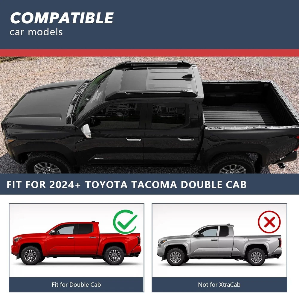 Specification: Durable and Long-Lasting: The black powder coating ensures its longevity and can endure harsh weather conditions. It can carry up to 220 lbs (100 kg) of load capacity, making it a great solution for transporting various oversized items. Versatile and Convenient: The set of two OE-style roof racks is an aftermarket product that can accommodate kayaks, canoes, snowboards, bikes, luggage, fishing poles, and more. Customize the perfect fit for your car's roof items with adjustable cross bars that can be easily moved and freely positioned to your desired distance. Fits: For Tacoma Double Cab 2024 2025 2026 .(With 4 Full Size Door) Pls Note: This is aftermarket, Not OEM one. Package Included: As pics show All necessary hardware is included Roof Rack & Platform with Movable Cross Bars for 2024 + Toyota Tacoma Double Cab Specification : Durable and Long-Lasting: The black powder coating ensures its longevity and can endure harsh weather conditions. It can carry up to 220 lbs (100 kg) of load capacity, making it a great solution for transporting various oversized items. Versatile and Convenient: The set of two OE-style roof racks is an aftermarket product that can accommodate kayaks, canoes, snowboards, bikes, luggage, fishing poles, and more. It provides ample space for all your adventure gear. Easy Installation: The package comes with all the necessary installation hardware making it a breeze to install. If you have any questions, our team is always available to assist you. Premium Quality and Affordability: Our product is a reliable solution for all your transportation needs. It's aftermarket and not OEM, which means you can get the same quality at an affordable price. Transport your gear in style with our roof rack! Customize the perfect fit for your car's roof items with adjustable cross bars that can be easily moved and freely positioned to your desired distance. Experience a peaceful and quiet ride with our roof platform featuring a windshield fairing at the front that effectively blocks wind noise. Say goodbye to distracting wind sounds and focus on enjoying the journey. Fits : For Tacoma Double Cab 2024 2025 2026 .(With 4 Full Size Door) Pls Note: This is aftermarket, Not OEM one. Package Included: As pics show All necessary hardware is included Payment Delivery details Terms of sales About us Contact us Payment We accept major credit card payments via Paypal. Payment must be received within 7 days of auction closing date. If you do not contact us or respond to our email within 7 days of auction closing date, we do not guarantee the item availability. We reserve the right to cancel any unwanted bids. Delivery details Flat rate shipping charge will be applied to the 48 continental USA States. Extra shipping fee will be charged to ship item(s) to HI, AK, PR, GU, VI, APO, FPO . Item(s) will be shipped via UPS Ground or USPS or Fedex within 3 Business days after payment is received. A Tracking Number will be upload on platform as soon as item(s) is shipped. International buyers please note, we are not responsible for any custom duties, taxes and brokerage fees. For some oversize packages, we may not be able to ship via USPS. Terms of sales All of our items are professionally made and guaranteed to fit. A professional installation is always recommended. Please send a message over eBay if you have any questions. We accept returns within 30 or 60 days after you received the item(s). All returned items must be new and in original package. The buyer will pay return shipping fees. No refund will be made for damaged parts. Shipping and handling fees and insurance fee are not refundable. About us Our warehouses are located in CA and NJ The transportation time is approximately 3-5 working days Contact us Your satisfaction is our top priority. We stand behind all products that we sell. If you have a problem with any of our listings, please allow us to work it out. Our business times are Monday-Friday 9:00- 5:00 Pacific Time. Office closes on weekends and holidays. We are striving to earn a 5- star rating with every purchase. Please take a moment to leave us a positive feedback when you receive your order. If you are not satisfied, please let us know before you leaving feedback. Please always include your purchase eBay item number in the mail whenever you have any questions.