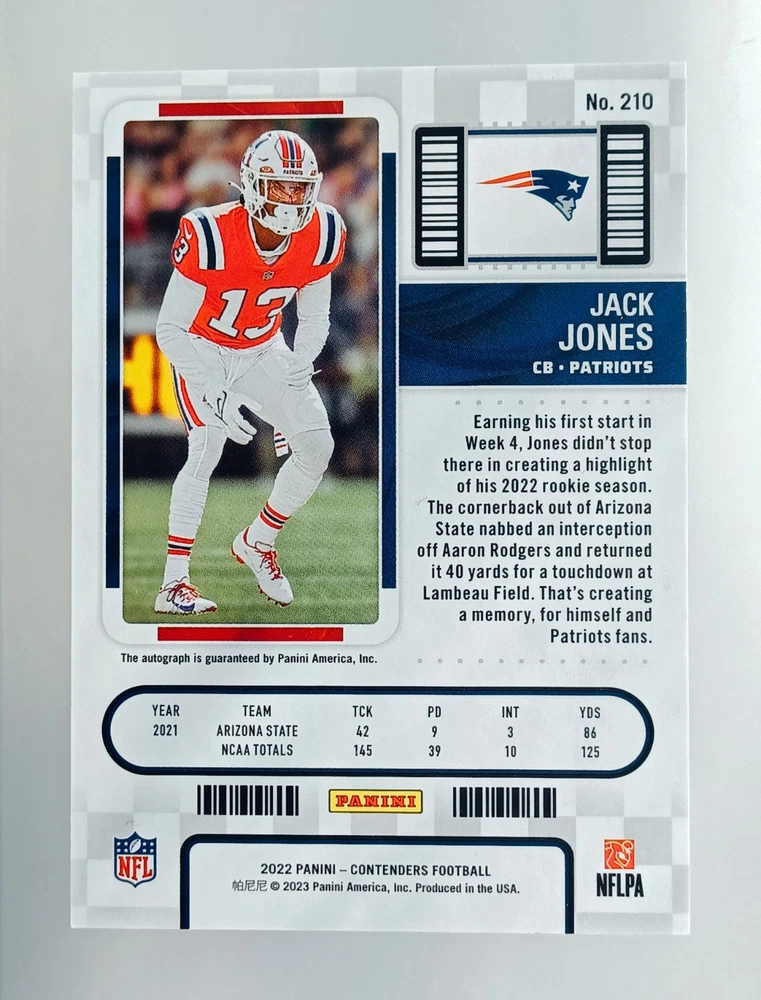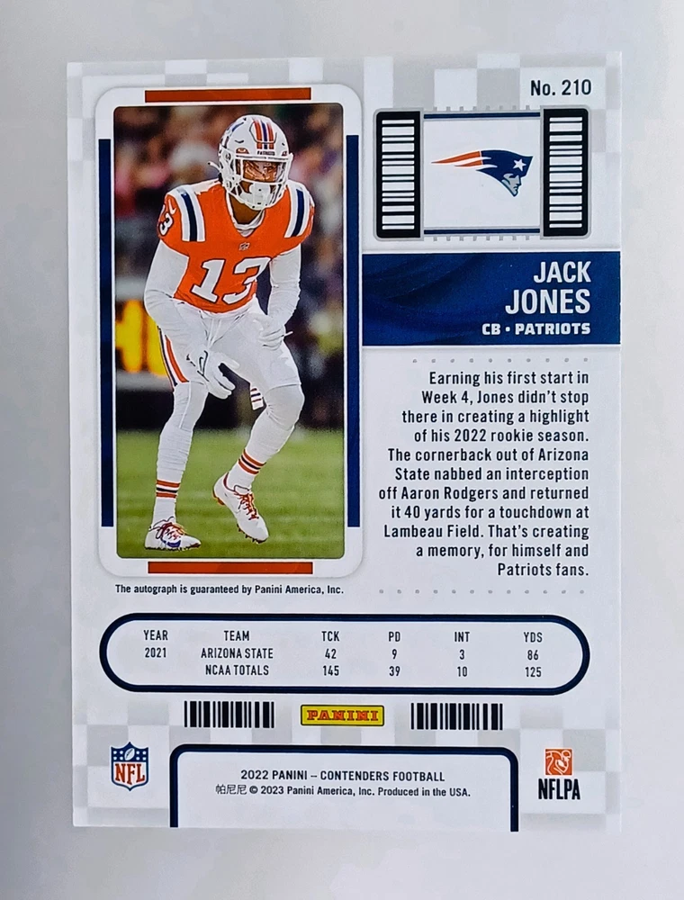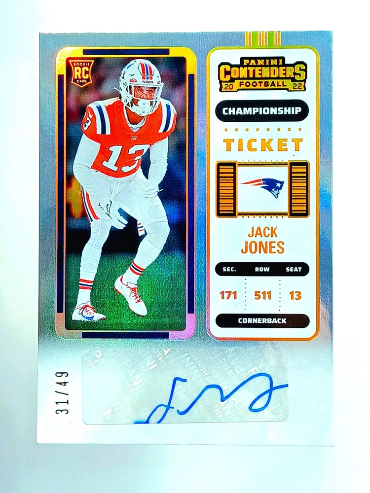 Daily auctions starting at $0.01 free shipping The Rookie Auto RC 2022 Contenders Prizm Jack Jones SSP Football Card is a highly sought-after trading card featuring an autograph from Jack Jones, a promising player in the National Football League. This limited edition card is from the 2022 Panini Contenders set and is part of a print run of only 49. With its exclusive features such as being serial numbered, a collector's edition, and a parallel variety, this card is a valuable addition to any football card collection. The autograph authentication by Panini Authentic adds to its authenticity, making it a prized possession for fans and collectors alike.