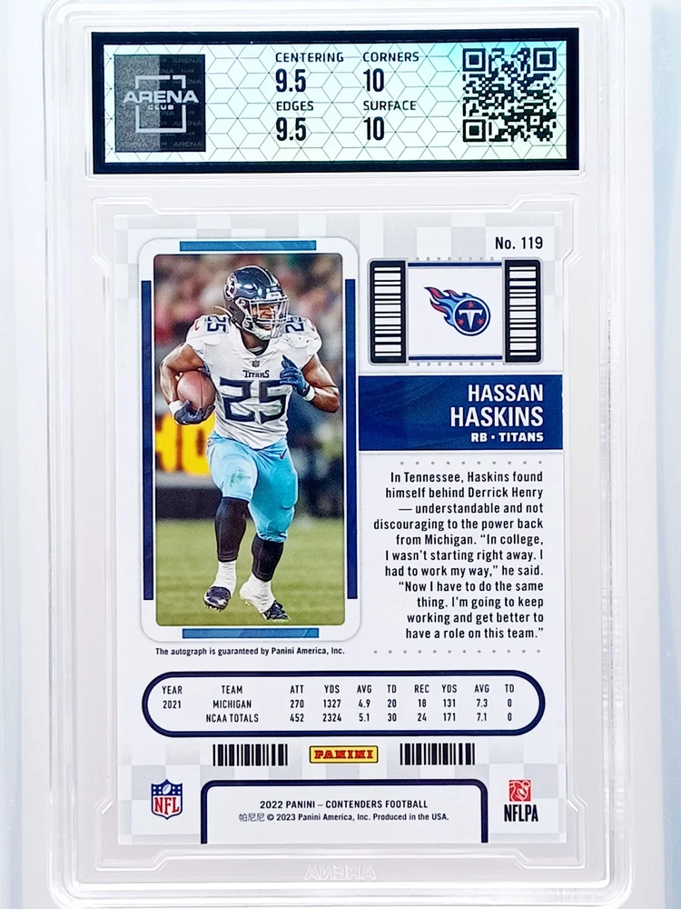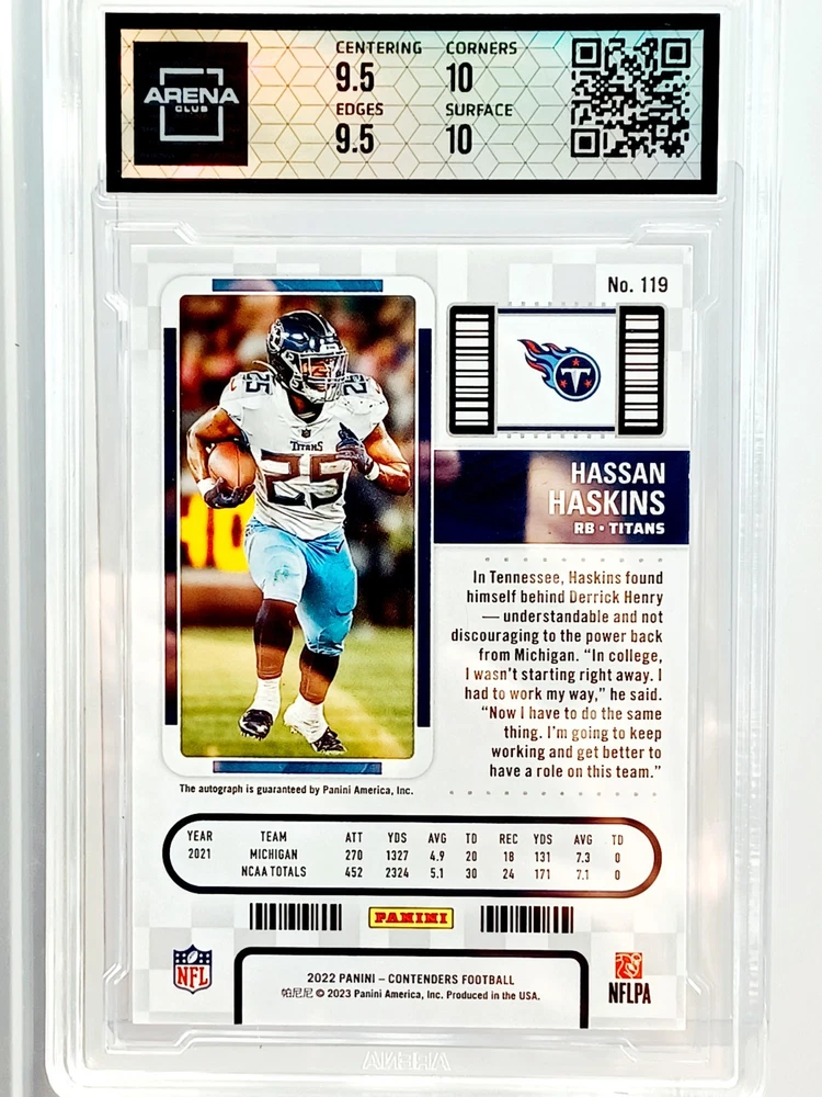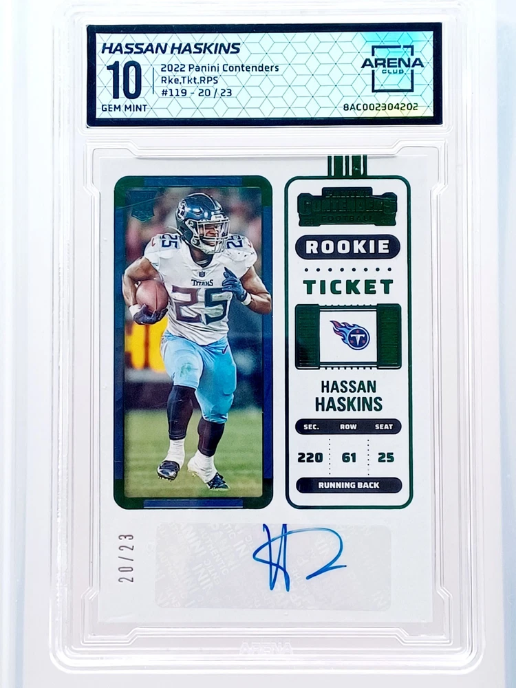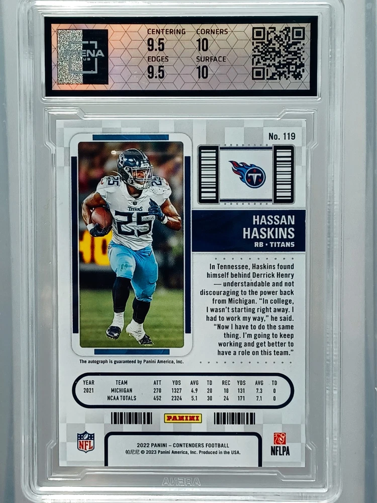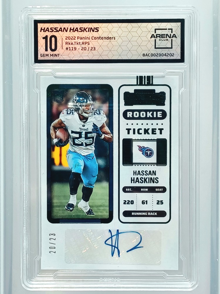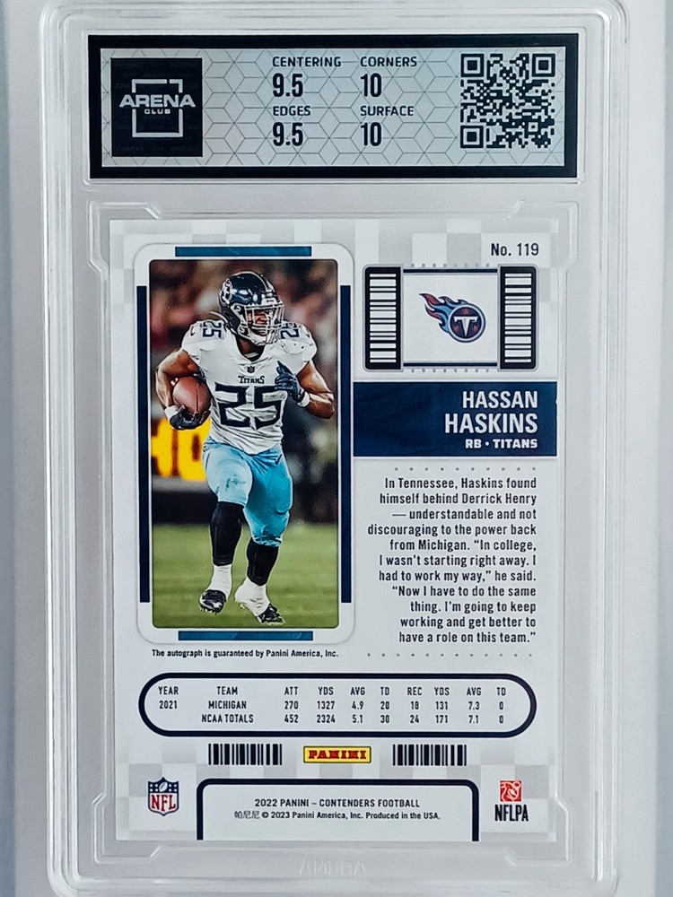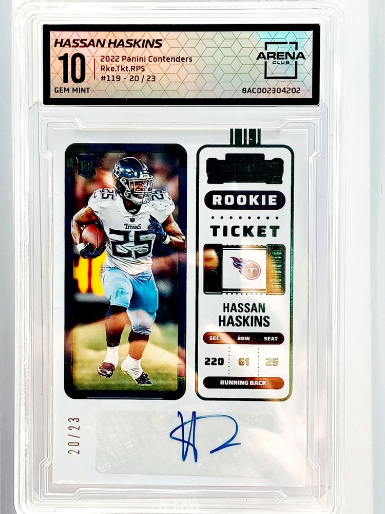 Daily auctions starting at $0.01 free shipping The product is a 2022 Panini Contenders trading card featuring an autograph from Hassan Haskins, a player from the National Collegiate Athletic Association (NCAA) and the Michigan Wolverines team. This Black Prizm parallel variety card is a limited edition rookie insert that is exclusive and highly sought after by collectors. The hard-signed autograph is authenticated by Panini Authentic and the card is numbered 23 out of the total print run. It is a valuable addition to any football card collection, especially for fans of the Michigan Wolverines and collectors of rookie cards.