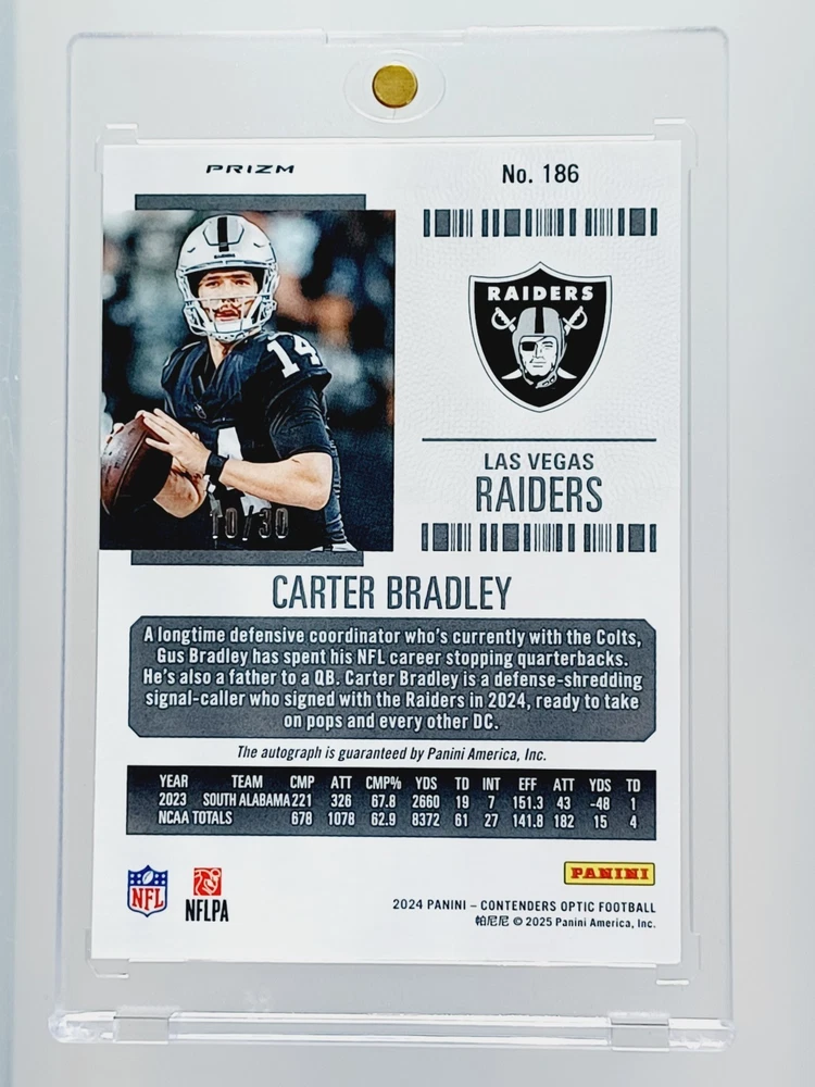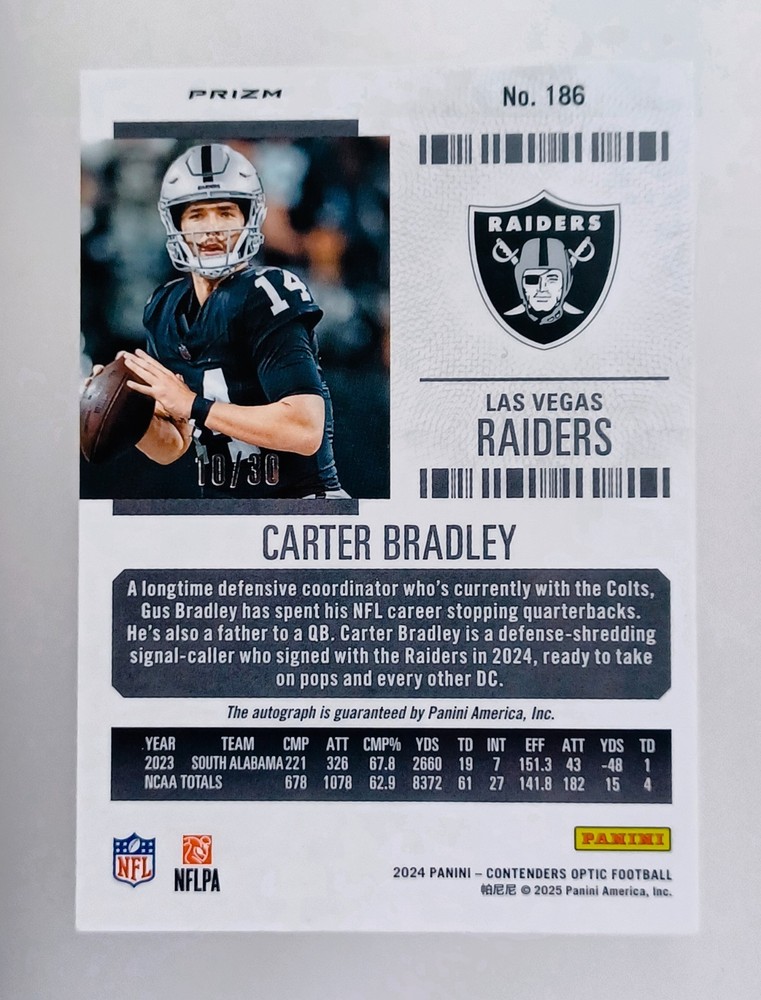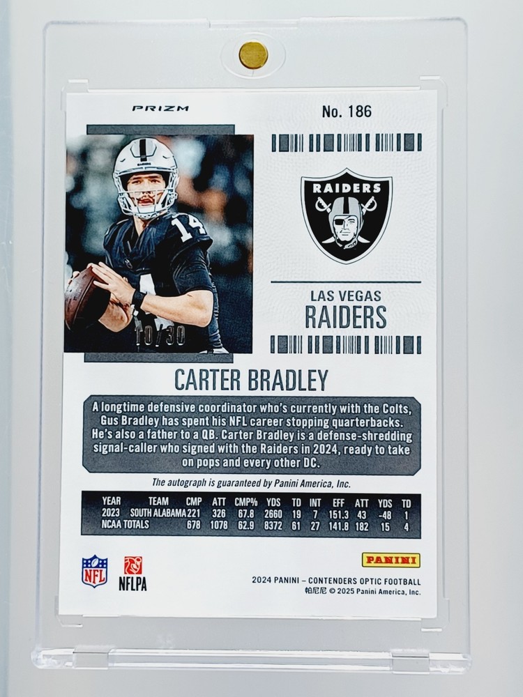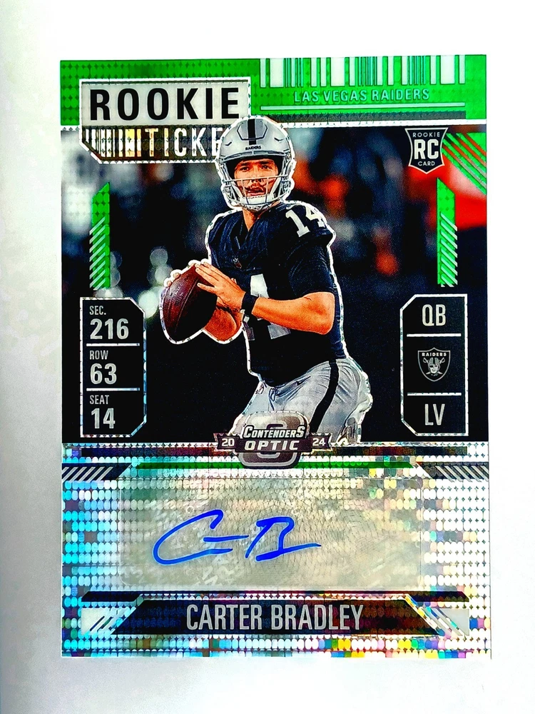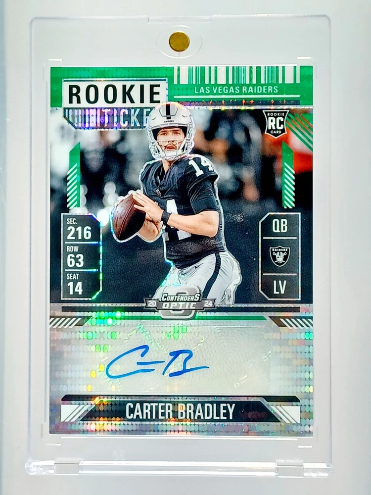Daily auctions starting at $0.01 free shipping The product is a highly sought-after 2024 Prizm Contenders Case Hit trading card featuring an autograph from NFL player Carter Bradley. This limited edition card is signed in hard format and comes with a print run of only 30. Authenticated by Panini Authentic, the card is a valuable addition to any football card collection, showcasing both the player's autograph and serial number. With a unique parallel variety and rookie designation, this card is a must-have for collectors looking to chase after rare and special memorabilia items in the sports trading card market.