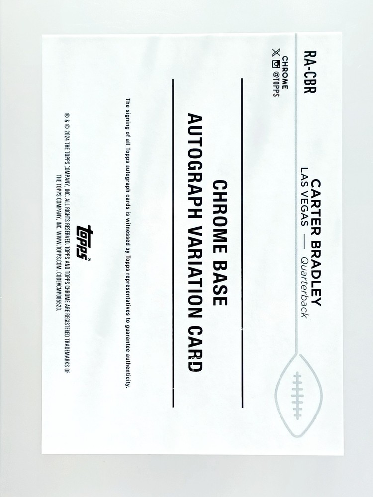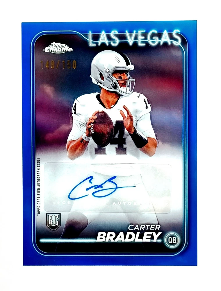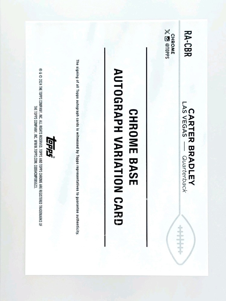 Daily auctions starting at $0.01 free shipping The Rookie Auto RC 2024 Prizm Topps Chrome 10 Carter Bradley /150 football card is a highly sought-after collectible item for football fans and card enthusiasts. This limited edition card features an autograph from Carter Bradley, a rising star in the National Football League, making it a valuable addition to any collection. Produced by Topps, this card is part of the 2024 Topps Chrome set and is authenticated by Topps, ensuring its authenticity and quality. With only 150 copies in existence, this card is a rare find for fans looking to own a piece of football history.