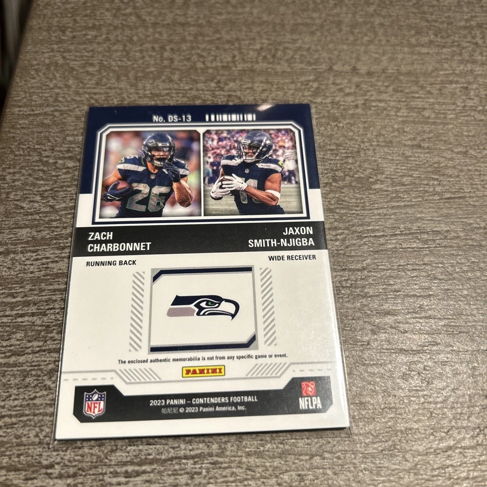 Season: 2023 Insert Set: Rookie Ticket Dual Swatches Card Number: DS-13 Team: Seattle Seahawks Features: Rookie, Insert, Memorabilia Manufacturer: Panini Sport: Football League: National Football League (NFL) Type: Sports Trading Card Parallel/Variety: Patch Set: 2023 Panini Contenders Player/Athlete: Jaxon Smith-Njigba, Zach Charbonnet