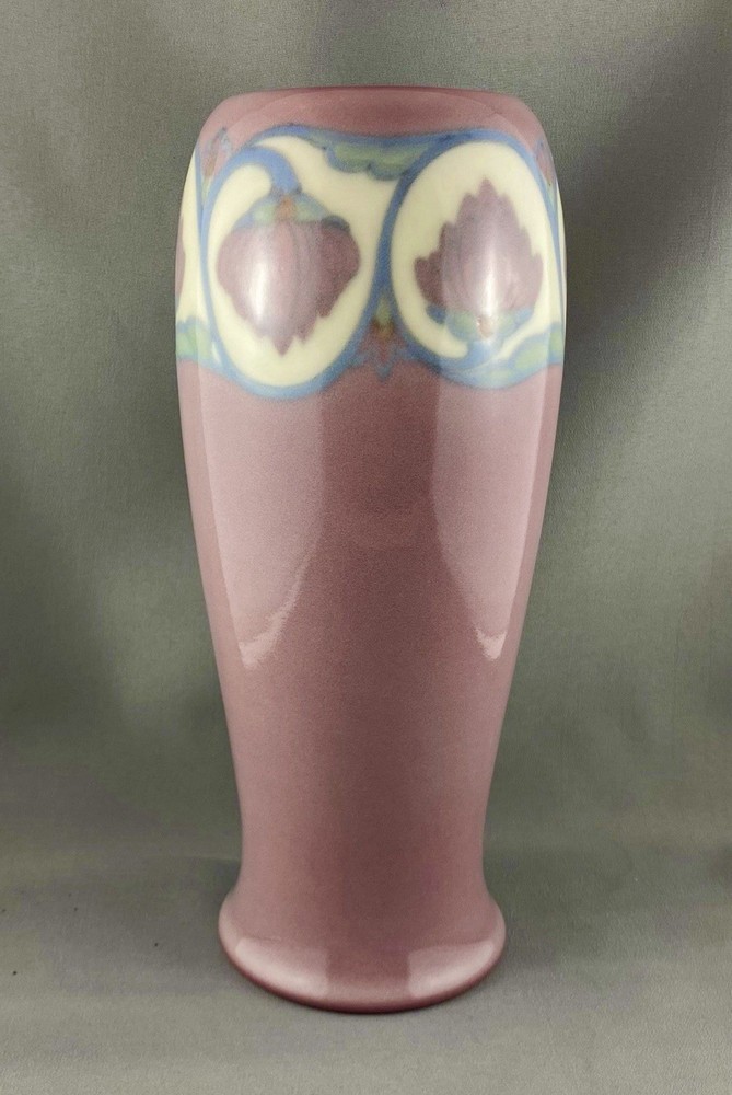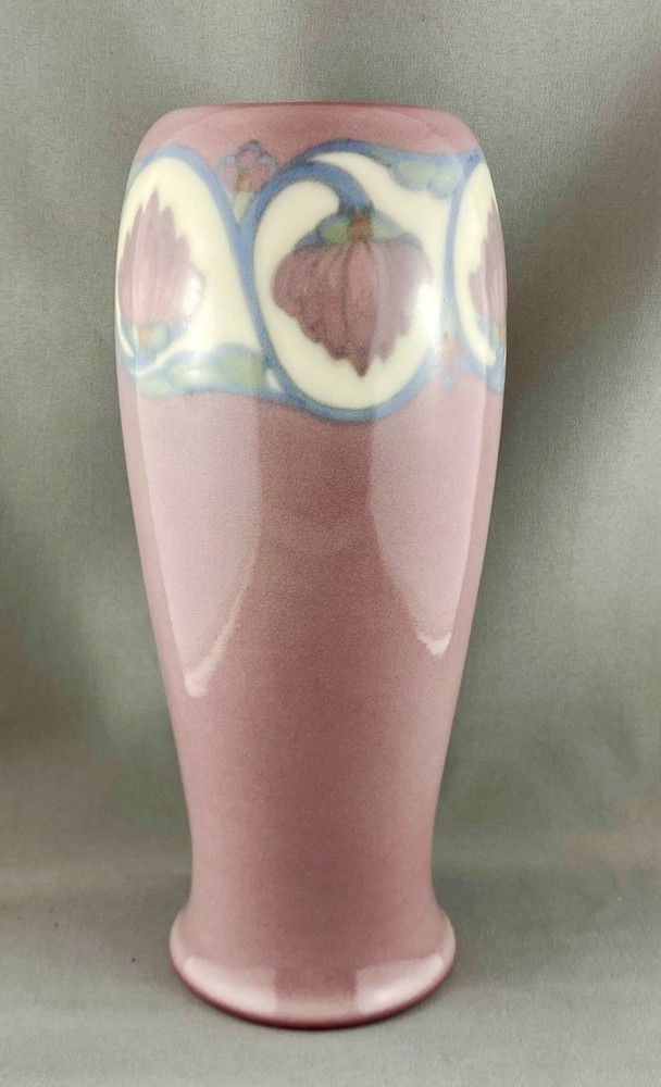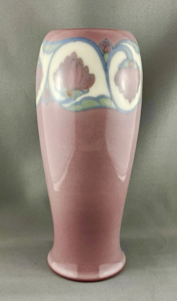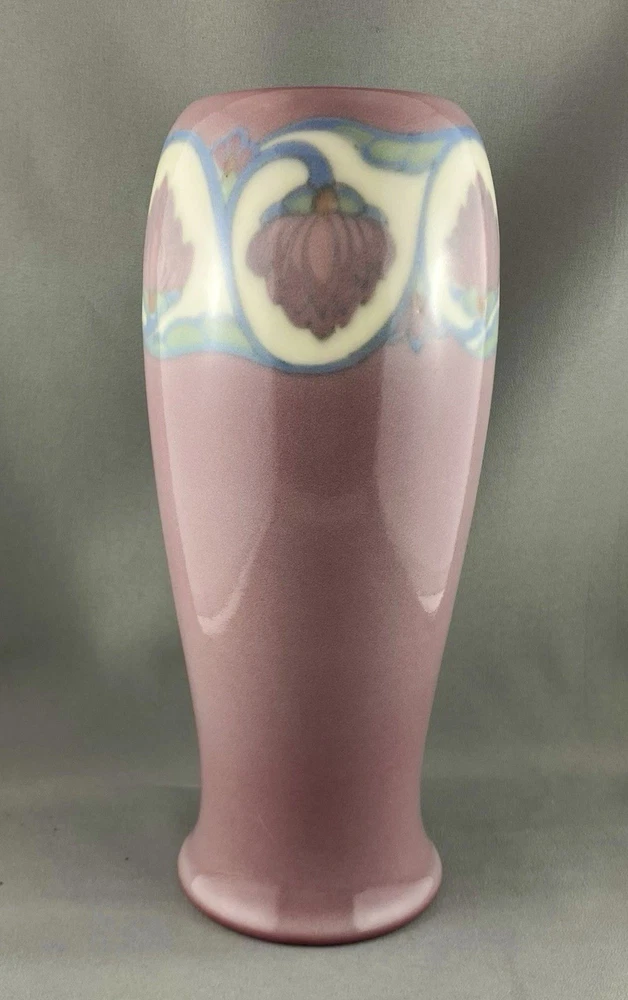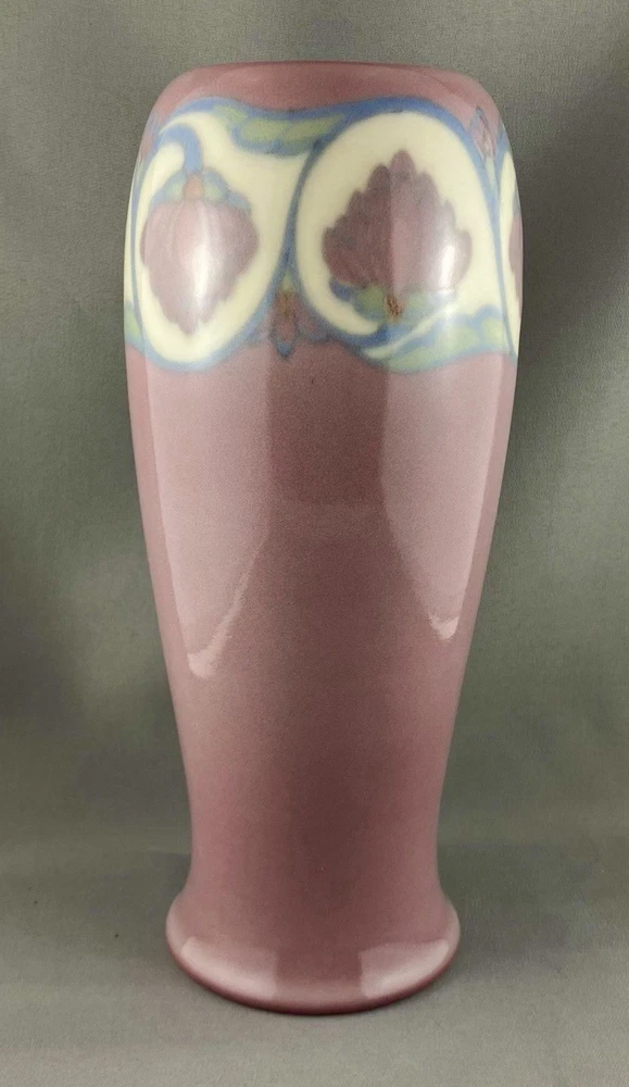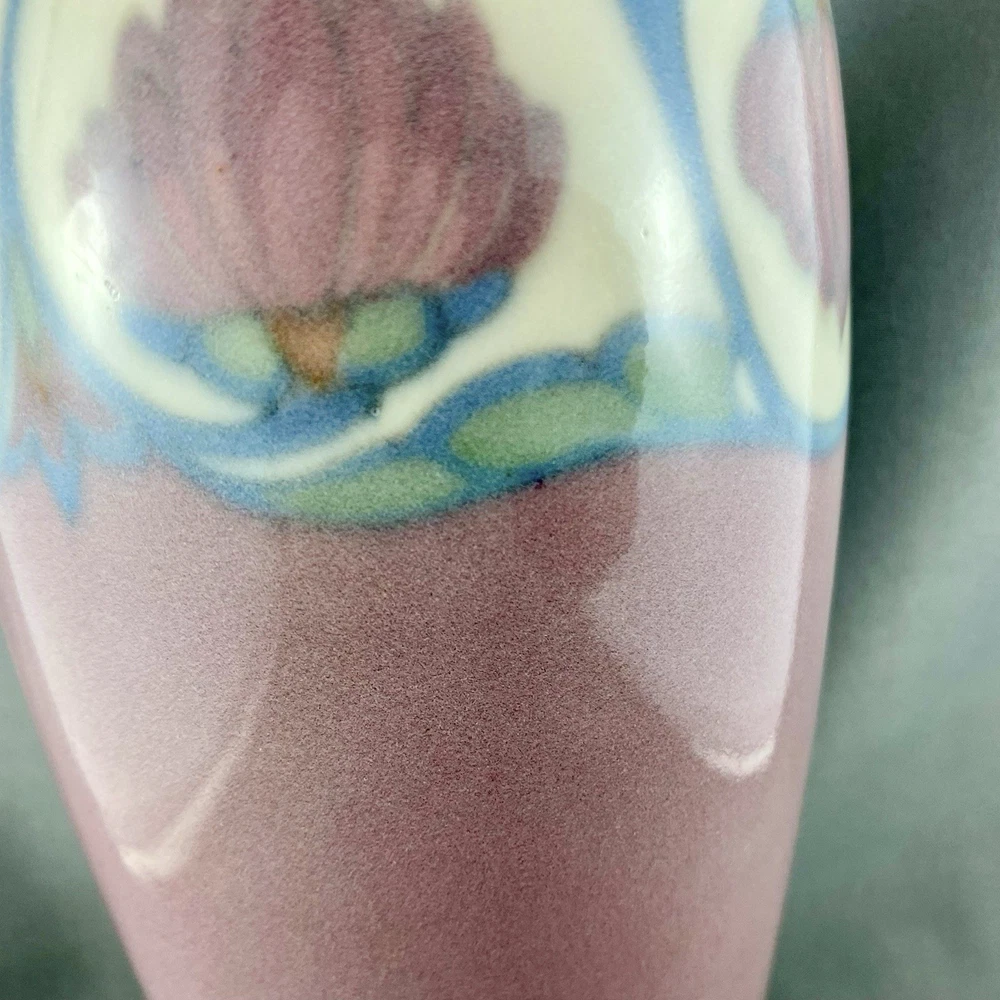 This lovely vase is an antique gem from Cincinnati, Ohio, USA and dates to 1919. Painted by Lorinda Epply, this vase features a rich deep pink hue and is beautifully accented with delicate white lotus flowers around the rim, making it a striking and uncommon Rookwood piece. Crafted from soft-bodied porcelain—a material Rookwood began using in 1915—this piece stands out from the company’s more common earthenware works. It is finished with Rookwood's Jewel Glaze, a high-gloss, translucent coating first officially introduced in 1920, though some records suggest it may have been in use as early as 1916. If so, this vase could be an early example of that experimentation. The glaze features delicate, bubble-like textures beneath the surface, visible only upon close inspection of the colored areas, creating a luminous, jewel-like effect with a soft, hazy finish. Typically applied to porcelain or white-bodied clay, the glaze lends the vase an ethereal, dreamlike aura—its misty surface veiling the pink body like a whisper of fog, imbuing the piece with a quiet, almost magical allure. This vase is a perfect addition to any collection, making it ideal for Rookwood enthusiasts, fine art collectors, interior designers seeking a timeless piece, or as a thoughtful gift for a special occasion or loved one. Condition – The vase has age-related wear but is structurally sound, with no visible cracks, chips, or crazing. Overall, it is in remarkable condition for an antique Rookwood vase. There is a hairline fracture that has been professionally restored and sealed to maintain the vase's structural integrity and preserve its appearance. Please refer to the photos for more details about the item's condition. The vase measures 4" (L) x 4" (W) x 9.5" (H). The shape of the vase #2305 was a variation of Shape 1667 with the top removed and was used on both porcelain and vellum-glazed vases. The vase weighs 1 pound and 15 ounces and has the traditional Rookwood markings. Rookwood Pottery, founded in 1880 by Maria Longworth Nichols Storer in Cincinnati, Ohio, is celebrated for its exceptional ceramic works and innovative glazes. The company became renowned for developing a variety of unique glazes, notably including its iconic Standard Glaze, Sea Green Glaze, Iris Glaze, and Vellum Glaze, among others, which contributed to its distinctive aesthetic. Noteworthy artists associated with Rookwood include Kataro Shirayamadani, known for his intricate designs, as well as Artur Van Briggle, Carl Schmidt, and Sara Sax, whose work played a significant role in shaping the company's artistic legacy. Rookwood’s commitment to fine craftsmanship and artistry established it as a leading American pottery manufacturer, with its vases, tiles, and sculptures remaining highly prized by collectors. Lorinda Epply (1874–1951) was a prominent American ceramic artist who contributed significantly to Rookwood Pottery from 1904 to 1948. Educated at the Cincinnati Art Academy and Columbia University, she became renowned for her mastery of glazes, particularly the soft pastels of the Jewel porcelain glaze . Her work, characterized by natural motifs and innovative forms, remains highly collectible and is featured in major museum collections, including the Saint Louis Art Museum and the Brooklyn Museum. Please note that all our vintage items are pre-loved and may show signs of wear and age. We strive to accurately describe each item's condition and any flaws, but please keep in mind that vintage items are not always in perfect condition. Our eco-friendly packaging ensures that your order arrives safely while minimizing its impact on the environment! If you have any questions, please don't hesitate to contact us. W e want you to be completely satisfied with your purchase and will do our best to provide you with all the information you need to make an informed decision.