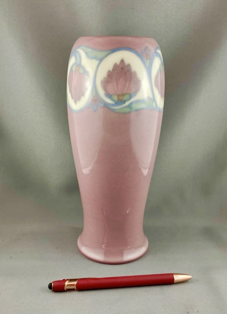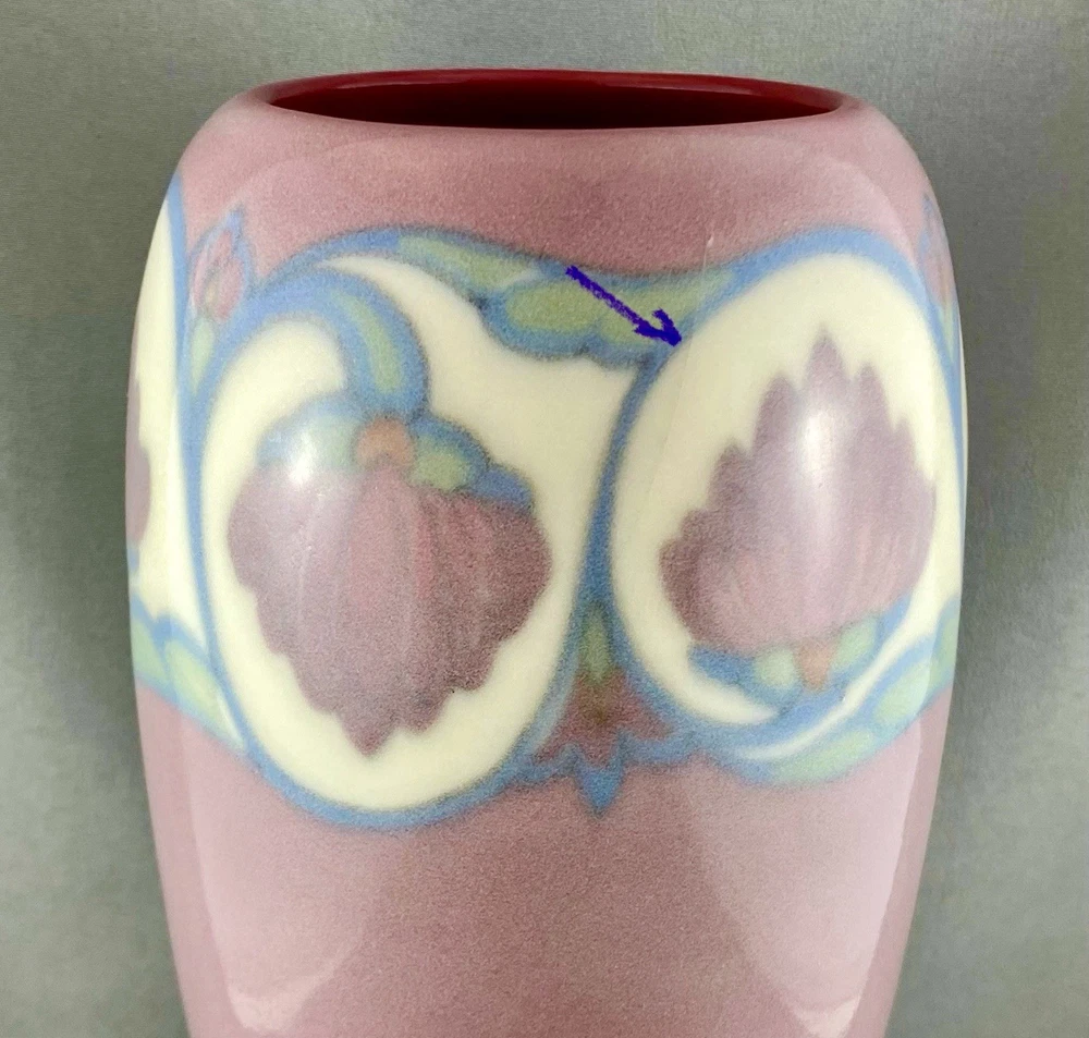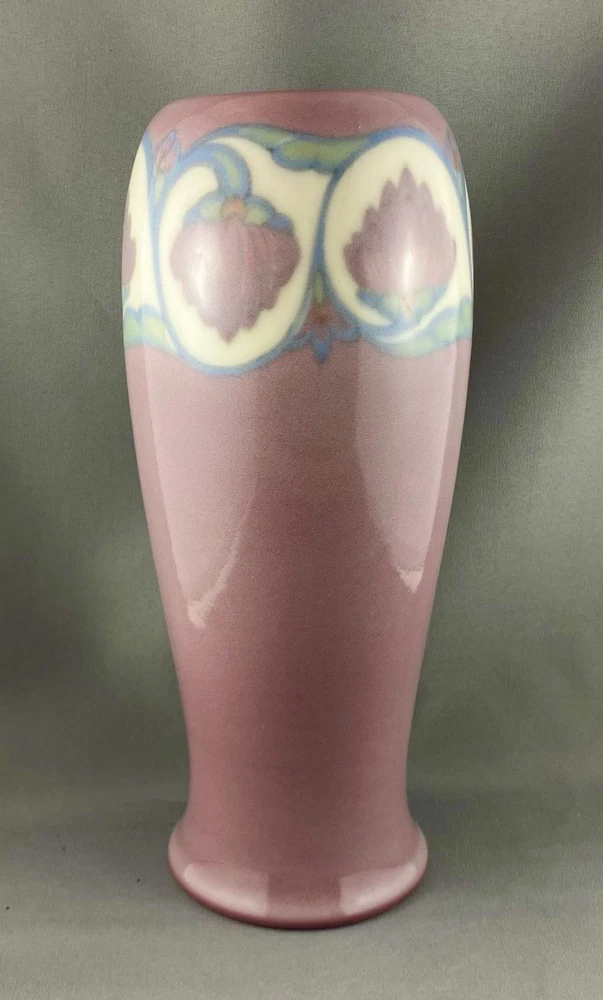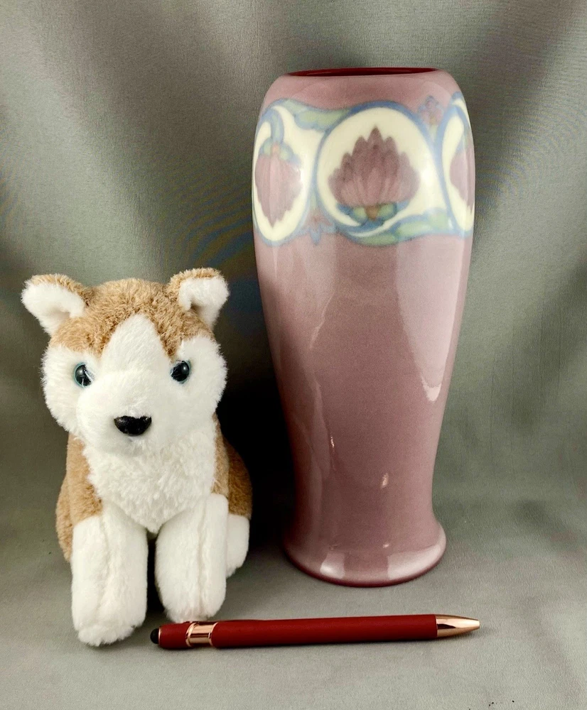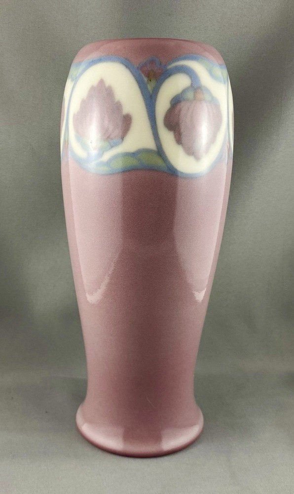 This lovely vase is an antique gem from Cincinnati, Ohio, USA and dates to 1919. Painted by Lorinda Epply, this vase features a rich deep pink hue and is beautifully accented with delicate white lotus flowers around the rim, making it a striking and uncommon Rookwood piece. Crafted from soft-bodied porcelain—a material Rookwood began using in 1915—this piece stands out from the company’s more common earthenware works. It is finished with Rookwood's Jewel Glaze, a high-gloss, translucent coating first officially introduced in 1920, though some records suggest it may have been in use as early as 1916. If so, this vase could be an early example of that experimentation. The glaze features delicate, bubble-like textures beneath the surface, visible only upon close inspection of the colored areas, creating a luminous, jewel-like effect with a soft, hazy finish. Typically applied to porcelain or white-bodied clay, the glaze lends the vase an ethereal, dreamlike aura—its misty surface veiling the pink body like a whisper of fog, imbuing the piece with a quiet, almost magical allure. This vase is a perfect addition to any collection, making it ideal for Rookwood enthusiasts, fine art collectors, interior designers seeking a timeless piece, or as a thoughtful gift for a special occasion or loved one. Condition – The vase has age-related wear but is structurally sound, with no visible cracks, chips, or crazing. Overall, it is in remarkable condition for an antique Rookwood vase. There is a hairline fracture that has been professionally restored and sealed to maintain the vase's structural integrity and preserve its appearance. Please refer to the photos for more details about the item's condition. The vase measures 4" (L) x 4" (W) x 9.5" (H). The shape of the vase #2305 was a variation of Shape 1667 with the top removed and was used on both porcelain and vellum-glazed vases. The vase weighs 1 pound and 15 ounces and has the traditional Rookwood markings. Rookwood Pottery, founded in 1880 by Maria Longworth Nichols Storer in Cincinnati, Ohio, is celebrated for its exceptional ceramic works and innovative glazes. The company became renowned for developing a variety of unique glazes, notably including its iconic Standard Glaze, Sea Green Glaze, Iris Glaze, and Vellum Glaze, among others, which contributed to its distinctive aesthetic. Noteworthy artists associated with Rookwood include Kataro Shirayamadani, known for his intricate designs, as well as Artur Van Briggle, Carl Schmidt, and Sara Sax, whose work played a significant role in shaping the company's artistic legacy. Rookwood’s commitment to fine craftsmanship and artistry established it as a leading American pottery manufacturer, with its vases, tiles, and sculptures remaining highly prized by collectors. Lorinda Epply (1874–1951) was a prominent American ceramic artist who contributed significantly to Rookwood Pottery from 1904 to 1948. Educated at the Cincinnati Art Academy and Columbia University, she became renowned for her mastery of glazes, particularly the soft pastels of the Jewel porcelain glaze . Her work, characterized by natural motifs and innovative forms, remains highly collectible and is featured in major museum collections, including the Saint Louis Art Museum and the Brooklyn Museum. Please note that all our vintage items are pre-loved and may show signs of wear and age. We strive to accurately describe each item's condition and any flaws, but please keep in mind that vintage items are not always in perfect condition. Our eco-friendly packaging ensures that your order arrives safely while minimizing its impact on the environment! If you have any questions, please don't hesitate to contact us. W e want you to be completely satisfied with your purchase and will do our best to provide you with all the information you need to make an informed decision.