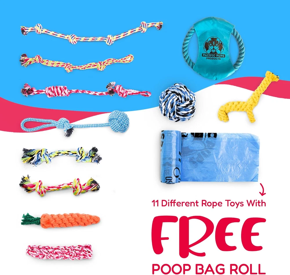 A Variety of Heavy Duty Dog Rope Toys for Dogs: Come in this 11-piece dog toy pack, dog rope toys include: dog tug of war toys, flossie dental toys for dogs (giraffe & carrot), dog rope toys for small dogs, Dog rope toys for large dogs & medium dogs, and these are all interactive toys for dogs that will entertain your dog for hours. There are durable dog toy ropes for all-size pups in this dog toy pack Durable Dog Toys for Aggressive Chewers of All Life Stages- Our strong dog ropes for aggressive chewers are great for all ages and sizes from puppy rope toys, and puppy teething toys to super chewer dog toy ropes and adult dog tug of war toys While these are best suited as dog rope toys for medium dogs, they also make great big dog toys ropes toys for small dogs, and dog toys for large dogs. See measurements of all rope toys in the photo for more detail Our Dog Tug of War Toy Ropes are all Safety Tested - Puppy chew toy ropes have all passed rigorous safety testing and are made from only safe materials. No plastic dog toy ropes in this dog toy set! Our dog ropes toys are made of Cotton Dog Toys Benefit Our Non-Profit Animal Rescue - Pacific Pups Products dog toys are made to support Pacific Pups Rescue, our dog rescue in California. Every purchase of our dog toys helps save the life of a homeless dog Interactive Dog Toys Help to Reduce Anxiety in Dogs - These pet toys for dogs will help keep your aggressive chewer busy, so they do not become destructive in the home. Your dog can enjoy playtime with other dogs with the dog tug toy; play tug of war with their human; or use the dog rope toys as a dog chew toy to fight boredom when home alone. All of the dog rope toys are durable dog toys and can withstand hours of chewing, shaking and tugging Product Description Your Dog's Favorite Rope Toys! with 11 Stunning Dog Ropes to Choose From Your pup will have 11 different dog rope toys to choose from in this pack of interactive dog toys! Which one will be your pup's top rope toy for dogs? Keep your small or medium dog entertained with our rope toys for aggressive chewers dog rope toys for medium dogs and small aggressive dogs Check this video of 11pcs Dog Rope Toys Unboxing! by Consumer Quest The video showcases the product in use. The video guides you through product setup. The video compares multiple products. The video shows the product being unpacked. Check out this video by Consumer Quest for Pacific Pups exploring every toy in the 11pcs Dog Rope Toy set: Showing why choosing 11pcs Dog Rope Toy Pack is the better choice for your dog, for unmatched fun time and quality! Supporting Pacific Pups Rescue. #ChooseToSupport #PacificPups Rescue Noble Cause over Paws! Every Purchase Supports Pacific Pups Rescue Every purchase you make echoes the wagging tail of another dog. How? Your every purchase contributes to Pacific Pups Rescue, which benefits in the rescue of our dogs in distress. Feel good knowing that your purchase benefits in rescuing dogs in need. Celebrate in style and make a difference! Variety of Flossy Tug Toys for Dogs! Flossy Dog Rope Toys for Dogs Comes with Numbers of Dog Toy Ropes to Choose from We know its hard to find rope dog toys for aggressive chewers! We have given our toys to the toughest chewers in our rescue to try the durability of these tough dog toys. They hold up to the toughest of chewers! 11-Piece Pacific Pups Products for dogs, Dog Toy Ropes for Aggressive Chewers These Dog Toy Ropes are made with durable & and high-quality materials. Popular dog toys for Christmas gifts for dogs: a complete set of toys for large breeds and dog chew toys for aggressive chewers medium breeds. Our 11 pc bulk dog toys ropes promote dental health and reduce destructive behavior. Please Consider adding these Products from Pacific Pups, Supporting Dog Rescue Add to Cart Add to Cart Add to Cart Add to Cart Add to Cart Add to Cart Add to Cart Customer Reviews 4.6 out of 5 stars 23 4.5 out of 5 stars 38 4.5 out of 5 stars 38 4.5 out of 5 stars 38 4.5 out of 5 stars 38 4.3 out of 5 stars 10,024 4.4 out of 5 stars 60 Price $11.99 $ 11 . 99 $12.99 $ 12 . 99 $12.99 $ 12 . 99 $12.99 $ 12 . 99 $12.99 $ 12 . 99 — $13.98 $ 13 . 98 Purpose For Pet Cleaning and hygiene Celebration dog party supplies Celebration dog party supplies Celebration dog party supplies Celebration dog party supplies Dog dental care toys Small dogs tennis balls toys Support Pacific Pups Rescue ✔ ✔ ✔ ✔ ✔ ✔ ✔ Recommended Age/Size For All Pet Size For All Dog Size For All Dog Size For All Dog Size For All Dog Size For All Dog Size For small dogs Made of Pet Friendly Material ✔ ✔ ✔ ✔ ✔ ✔ ✔ Variety Pet Wipes for different uses Birthday-themed toys and items Birthday-themed toys and items Birthday-themed toys and items Birthday-themed toys and items 18 different types of dog toys 6 Squeaky dog ball Safety Tested Material ✔ ✔ ✔ ✔ ✔ ✔ ✔ Durability Tested ✔ ✔ ✔ ✔ ✔ ✔ ✔ Pet Friendly ✔ ✔ ✔ ✔ ✔ ✔ ✔ Indoor & Outdoor Use ✔ ✔ ✔ ✔ ✔ ✔ ✔ Helps Homeless Dogs ✔ ✔ ✔ ✔ ✔ ✔ ✔ Help with Boredom ✔ ✔ ✔ ✔ ✔ ✔ ✔ Value for money ✔ ✔ ✔ ✔ ✔ ✔ ✔ Please Also Consider These Products from Pacific Pups Products - Supporting Dogs Add to Cart Add to Cart Add to Cart Add to Cart Add to Cart Add to Cart Customer Reviews 4.3 out of 5 stars 14,904 4.5 out of 5 stars 3,036 4.2 out of 5 stars 3,594 4.5 out of 5 stars 1,127 4.3 out of 5 stars 3,855 4.2 out of 5 stars 3,594 4.3 out of 5 stars 3,855 Price $21.99 $ 21 . 99 $15.99 $ 15 . 99 $10.99 $ 10 . 99 — $15.99 $ 15 . 99 $10.99 $ 10 . 99 $12.99 $ 12 . 99 Durability Tested ✔ ✔ ✔ ✔ ✔ ✔ ✔ Support Pacific Pups Rescue ✔ ✔ ✔ ✔ ✔ ✔ ✔ Recommended Age/Size For All Dog Size For XL Dogs For Medium, Large, XL Dogs For Small Dogs For Medium, Large, XL Dogs For Medium, Large, XL Dogs For Medium, Large, XL Dogs Safety Tested ✔ ✔ ✔ ✔ ✔ ✔ ✔ Number of Dog Toys 11pcs 1pc 1