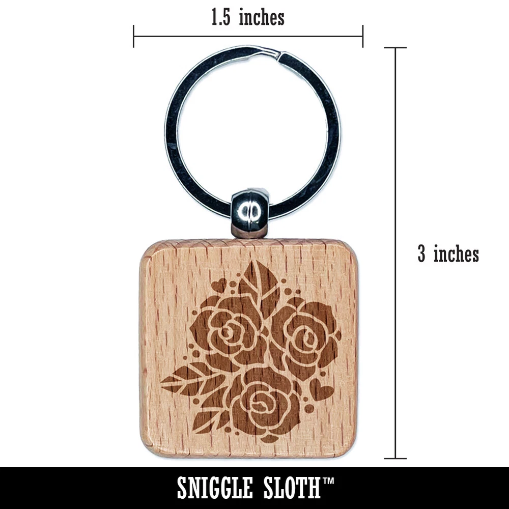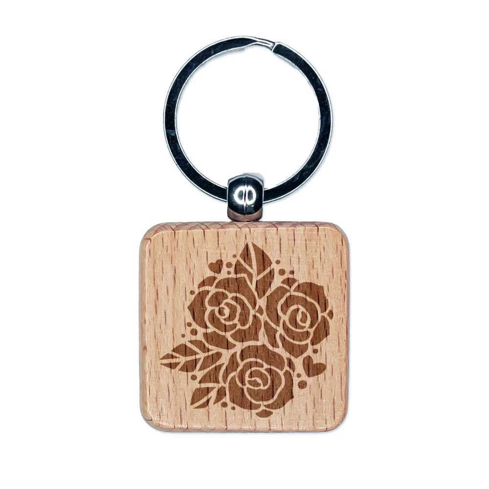 Rose Bundle Wedding Bouquet Engraved Wood Square Keychain Tag Charm