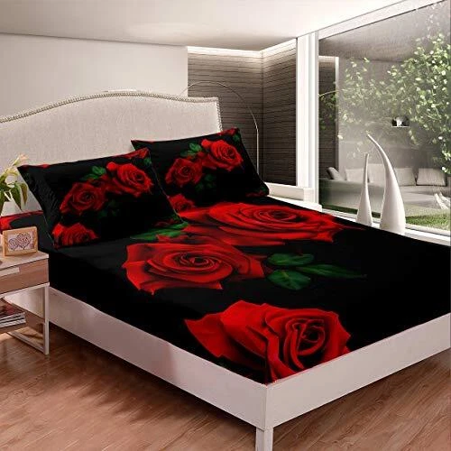 Rose Fitted Sheet Red Floral Print Bed Sheet Set Romantic Flower Twin Multi 24