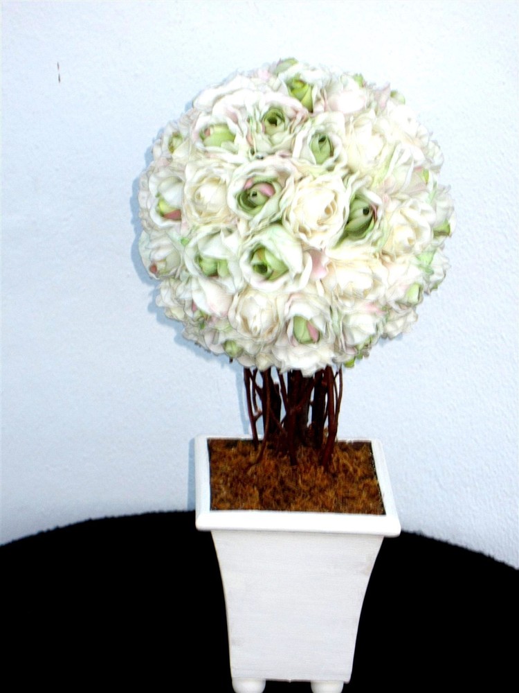 Rose Flower Topiary Tree in Wooden Planter Home Decor Colors: Off White, green and Pink Faux Silk Roses Tree is in a Wooden Planter Measures: 15 1/2 inches High 8 1/2 inches Wide This is a very unique Tabletop Topiary Tree Goes with so many colors In Very good condition Please see Photos for more Description COMES FROM A SMOKE FREE HOME Any questions please feel free to ask me. Thanks for looking COME AND SEE MY other items Powered by SixBit's eCommerce Solution