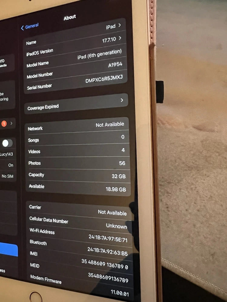 Apple Ipad 6th generation 32GB (2018) model A1954 Wifi cellular Rose Gold color. pre owned. slightly scratched on corners wear and tear (see pics) but its been in case remainder of time. Rosegold case will come with it. Has the ipadOS version 17.7.10