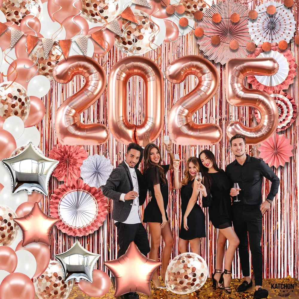 HUGE PACK OF 149 | ALL IN ROSE GOLD 2025 ARCH SET - Save your time with our this rose gold new years decorations 2025 that is a complete package that includes everything from 2025 balloons numbers to foil fringes. This happy new year decorations 2025 rose gold will be unique factor to your new year decorations. This huge 2025 rose gold balloons numbers set are best for new years decorations, senior night decorations 2025 or even for graduation decorations 2025. GIANT 40 INCH : 2025 BALLOON WITH ROSE GOLD FRINGE AND ASSORTED PAPER FANS - This 2025 new years eve party supplies rose gold set includes all from 40-inch rose gold 2025 balloons, rose gold fringe curtain (pack of 3), 8 assorted paper fans, rose gold/white/confetti balloons (pack of 110), 4 silver/rose gold star balloons, 12 silver, and rose gold swirls, 2 garlands (6.5ft), Plus, other supporting accessories like balloon strip, glue dots etc. DECORATE WITH 40 INCH 2025 BALLOON NUMBER - Elevate your nye decorations 2025 rose gold kit with mesmerizing huge 40 inch 2025 Balloon Backdrop set. Dive into the joy of new year with premium new years eve party supplies 2025 and a captivating rose gold streamer backdrop. Make every moment shine with our curated decoracion de año nuevo 2025 which includes rose gold star balloon, paper fans, shinny swirls, latex and confetti balloons etc. HELIUM SUPPORTED | HIGH QUALITY | REUSABLE - Unleash the with our exceptional new years eve party supplies 2025 pink. Crafted for durability and elegance, our high-quality and sturdy new years balloons 2025 set, includes a dazzling rose gold streamers and a reusable huge nye balloons 2025 garland kit that are helium supported. Make a memorable rose gold new year decorations 2025. Let the countdown begin in style with our new years decorations 2025 balloons. ON-DEMAND SOCIAL BACKDROP PARTY – Create a bright New year 2025 decorations. This stunning rose gold new years decorations 2025 balloons set will surely get the attention of everybody in your rosegold party decoration. You can also use this new years decorations 2025 backdrop for next year new year decorations, graduation decorations 2025, senior night decorations, prom decorations and it will create an unforgettable night of your life. Powered by BRND.ME.