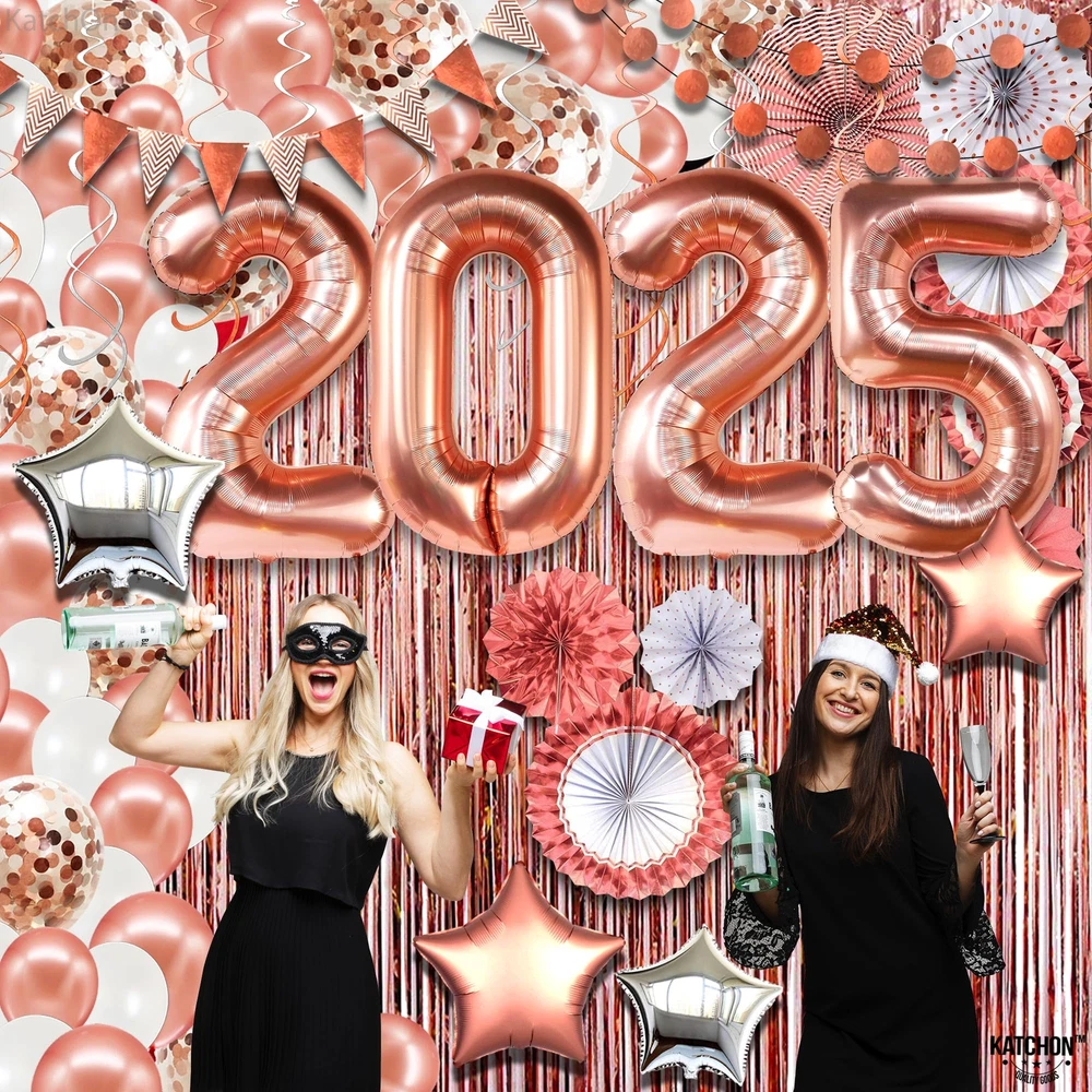 HUGE PACK OF 149 | ALL IN ROSE GOLD 2025 ARCH SET - Save your time with our this rose gold new years decorations 2025 that is a complete package that includes everything from 2025 balloons numbers to foil fringes. This happy new year decorations 2025 rose gold will be unique factor to your new year decorations. This huge 2025 rose gold balloons numbers set are best for new years decorations, senior night decorations 2025 or even for graduation decorations 2025. GIANT 40 INCH : 2025 BALLOON WITH ROSE GOLD FRINGE AND ASSORTED PAPER FANS - This 2025 new years eve party supplies rose gold set includes all from 40-inch rose gold 2025 balloons, rose gold fringe curtain (pack of 3), 8 assorted paper fans, rose gold/white/confetti balloons (pack of 110), 4 silver/rose gold star balloons, 12 silver, and rose gold swirls, 2 garlands (6.5ft), Plus, other supporting accessories like balloon strip, glue dots etc. DECORATE WITH 40 INCH 2025 BALLOON NUMBER - Elevate your nye decorations 2025 rose gold kit with mesmerizing huge 40 inch 2025 Balloon Backdrop set. Dive into the joy of new year with premium new years eve party supplies 2025 and a captivating rose gold streamer backdrop. Make every moment shine with our curated decoracion de año nuevo 2025 which includes rose gold star balloon, paper fans, shinny swirls, latex and confetti balloons etc. HELIUM SUPPORTED | HIGH QUALITY | REUSABLE - Unleash the with our exceptional new years eve party supplies 2025 pink. Crafted for durability and elegance, our high-quality and sturdy new years balloons 2025 set, includes a dazzling rose gold streamers and a reusable huge nye balloons 2025 garland kit that are helium supported. Make a memorable rose gold new year decorations 2025. Let the countdown begin in style with our new years decorations 2025 balloons. ON-DEMAND SOCIAL BACKDROP PARTY – Create a bright New year 2025 decorations. This stunning rose gold new years decorations 2025 balloons set will surely get the attention of everybody in your rosegold party decoration. You can also use this new years decorations 2025 backdrop for next year new year decorations, graduation decorations 2025, senior night decorations, prom decorations and it will create an unforgettable night of your life. Powered by BRND.ME.