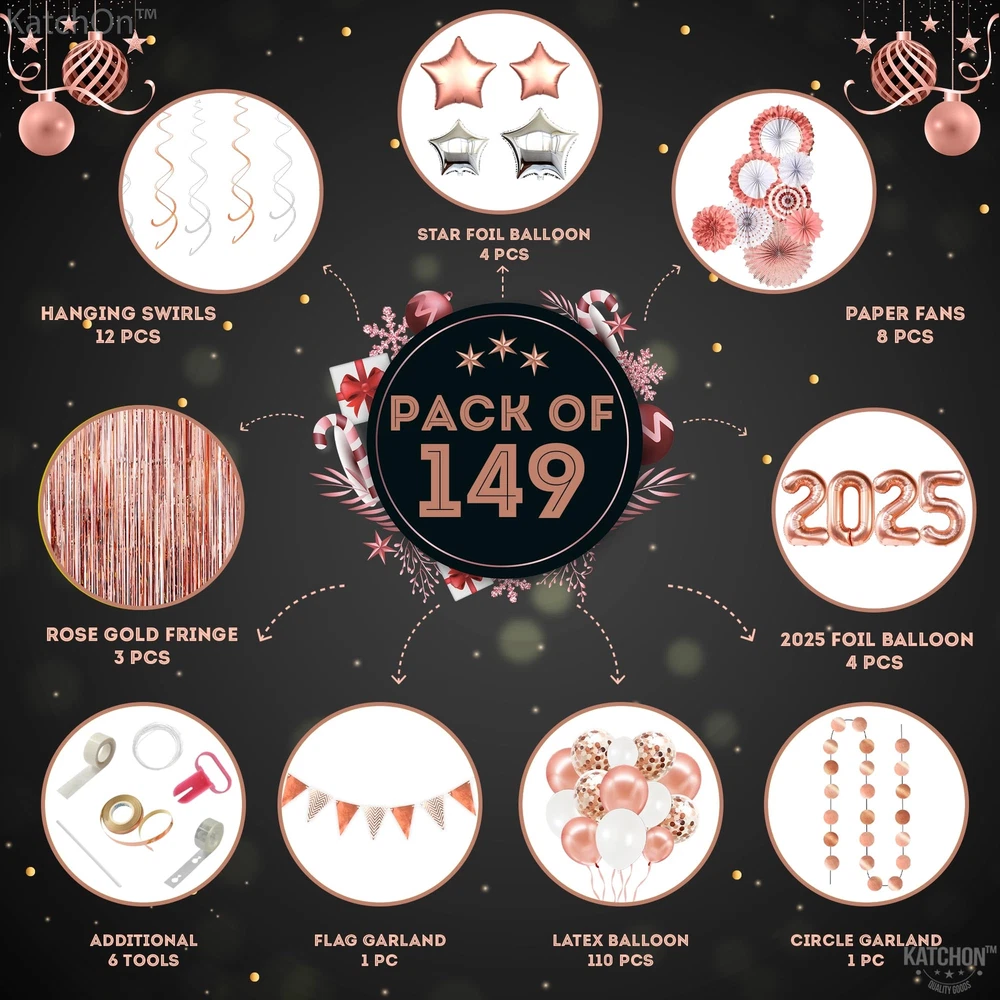 HUGE PACK OF 149 | ALL IN ROSE GOLD 2025 ARCH SET - Save your time with our this rose gold new years decorations 2025 that is a complete package that includes everything from 2025 balloons numbers to foil fringes. This happy new year decorations 2025 rose gold will be unique factor to your new year decorations. This huge 2025 rose gold balloons numbers set are best for new years decorations, senior night decorations 2025 or even for graduation decorations 2025. GIANT 40 INCH : 2025 BALLOON WITH ROSE GOLD FRINGE AND ASSORTED PAPER FANS - This 2025 new years eve party supplies rose gold set includes all from 40-inch rose gold 2025 balloons, rose gold fringe curtain (pack of 3), 8 assorted paper fans, rose gold/white/confetti balloons (pack of 110), 4 silver/rose gold star balloons, 12 silver, and rose gold swirls, 2 garlands (6.5ft), Plus, other supporting accessories like balloon strip, glue dots etc. DECORATE WITH 40 INCH 2025 BALLOON NUMBER - Elevate your nye decorations 2025 rose gold kit with mesmerizing huge 40 inch 2025 Balloon Backdrop set. Dive into the joy of new year with premium new years eve party supplies 2025 and a captivating rose gold streamer backdrop. Make every moment shine with our curated decoracion de año nuevo 2025 which includes rose gold star balloon, paper fans, shinny swirls, latex and confetti balloons etc. HELIUM SUPPORTED | HIGH QUALITY | REUSABLE - Unleash the with our exceptional new years eve party supplies 2025 pink. Crafted for durability and elegance, our high-quality and sturdy new years balloons 2025 set, includes a dazzling rose gold streamers and a reusable huge nye balloons 2025 garland kit that are helium supported. Make a memorable rose gold new year decorations 2025. Let the countdown begin in style with our new years decorations 2025 balloons. ON-DEMAND SOCIAL BACKDROP PARTY – Create a bright New year 2025 decorations. This stunning rose gold new years decorations 2025 balloons set will surely get the attention of everybody in your rosegold party decoration. You can also use this new years decorations 2025 backdrop for next year new year decorations, graduation decorations 2025, senior night decorations, prom decorations and it will create an unforgettable night of your life.