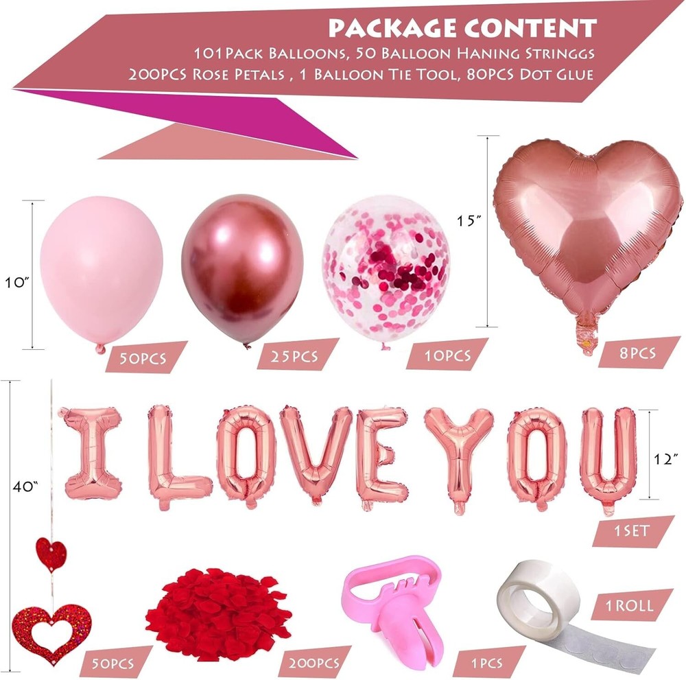Valentines Day Balloons Kit 101 Pack Rose Gold Pink Heart Balloons with Rose Occasion: Mother's Day, Wedding, Anniversary, Valentine's Day Color: Pink Included Components: Glue Cartoon Character: PARTYKIT Theme Valentines day Material: Rubber Unit Count: 1 Count CPSIA Cautionary Statement: Choking Hazard - Balloon, No Warning Applicable Special Feature Confetti Our valentines balloons kit includes 50pcs pink latex balloons, 25pcs metallic red latex balloons, 10pcs red confetti Balloons, 8pcs foil heart balloons, 1 set of I LOVE YOU balloons, 50pcs balloon hanging strings, 200pcs artificial rose petals, 1pcs balloon tie tool and 1 roll of balloon dot glue. Sufficient quantity and various styles can satisfy your decorative demands! All latex and foil balloons are made of high quality material,easy inflatable but not easily broken, not easy to leak; All Colors are vivid as picture shows, perfect for Valentines day decoration; All materials are safe to use. We provide dot glue and balloon tie tool so you can assemble this valentines day balloons easily. If you don’t know how to arrange them, please see our product picture! Our pictures are all real shots, you can see the actual effect directly. You will get 200pcs artificial rose petals to enhance the romantic atmosphere. The rose petals are made of high quality non-woven fabric material, environment friendly and will not fade. Perfect decorations for Valentine's Day. Whether it is Valentines day, anniversary decorations, bachelor parties, weddings, engagements or any other special events, you can use this love balloons set to celebrate with your love. The pink balloon set adds a romantic atmosphere in your home. Return Policy: We offer a 30 day return policy from the receiving date. Please contact us for a Free Return Label. Please use our return label so it will go back to our supplier and we can do a refund or replacement afterwards. Feedback: Your satisfaction is very important to us! If you have any problem with your order, please contact us and we will do our very best to make you satisfied. As long as you are happy with your purchase, please leave a positive feedback for us. We will always leave you a positive feedback in return. If you have any problem with your purchase, please do not leave a negative feedback. Please Contact us ... and your issue will be solved quickly and positively We are a small family-owned business trying to make a living, not a huge company that does not care ... We will ALWAYS do our best for you!