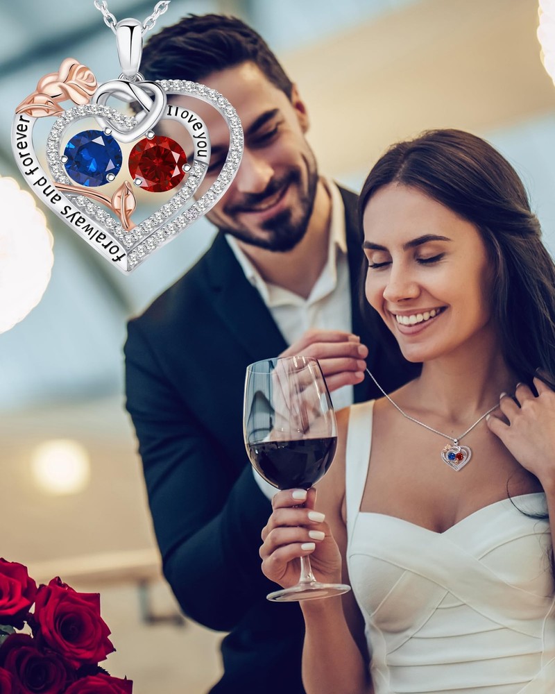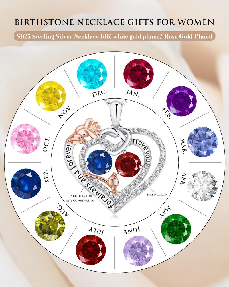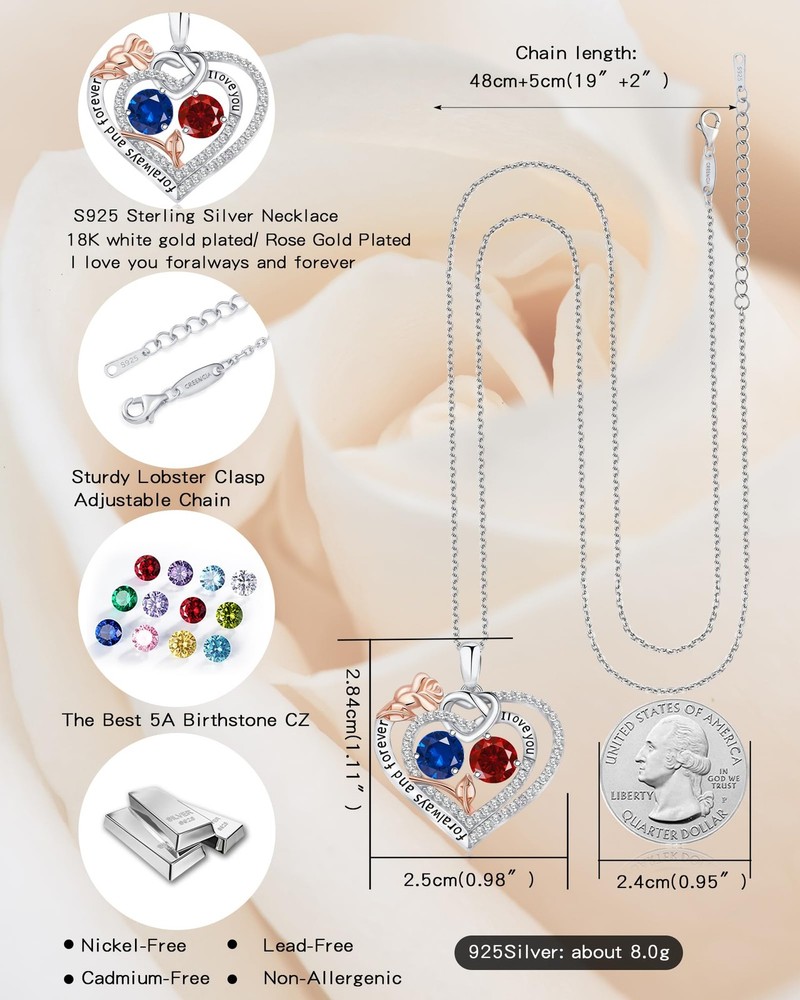 Birthstone Necklace for Women 【Gifts for Women 925 Sterling Silver】This double heart rose birthstone necklace is made of 925 sterling silver and filled with real gold plated and set with 2 5A cubic zirconia stones, which are refract dazzling light like diamonds. Its material is hypoallergenic and antioxidant, it won't rust, fade, corrode, or tarnish. Heart pendant necklace size: 19"+2" adjustable chain, weight: 8g. "I love you foralways and forever" is engraved on the face of the necklace 【Anniversary Gifts for Wife】Double heart pendants symbolize mutual love and fixed birthstones ruby is represent that sincere love is endless. The love birthstone necklace with gemstone pendant will make your relationship stronger. The uniqueness of necklaces is that love energy keeps love going all the way and never stops. It can be romantic love, cherished friendship, or a bond that strengthens a relationship, so the heart pendants are eternal expressions of love 【Mothers Day Gifts to My Wife Necklace】Great as a birthday gifts for women, Anniversary gifts, Mother's Day gifts, Graduation gifts, Wedding gifts, for her/wife/girlfriend/daughter/woman/mom/grandmas An exquisite fashion jewelry gift to express a promise of love to the most important one or friendship between friends and girlfriends You can also give it to yourself; wear it, and you will be the focus of any occasion 【Birthday Gifts】You can choose birthstone according to your birth month or favorite color, one is a fixed July ruby and the other birthstone is free to choose its color. January represents loyalty, February represents honesty, March represents bravery, and April represents May represents beauty, June represents nobility, July represents enthusiasm, August represents happiness, September represents love, October represents energy, November represents friendship, December represents With warmth 【Excellent After-sales Service】is committed to providing high-quality jewelry and efficient service to our customers. Each necklace comes with an exquisite gift box and gift bag, making it the ideal women's necklace for your most important woman. If you have any questions about women's jewelry necklaces, please feel free to contact us. The pendant has a moderate weight, it's not too light that it feels cheap or flimsy. Tips: The chain can be separated from the pendant
